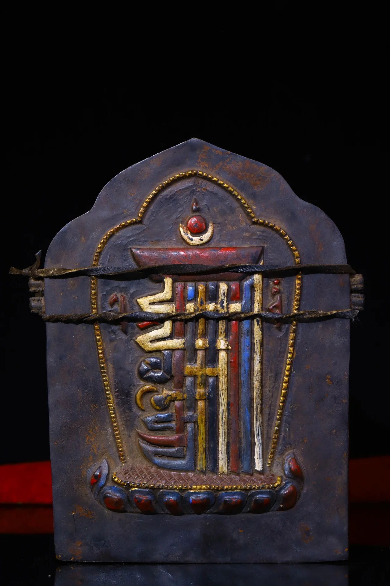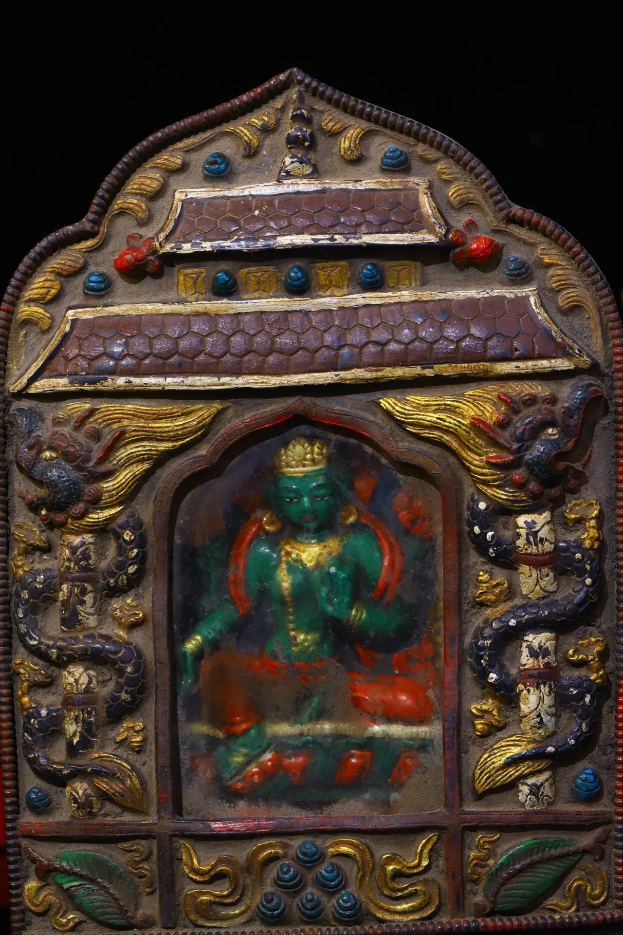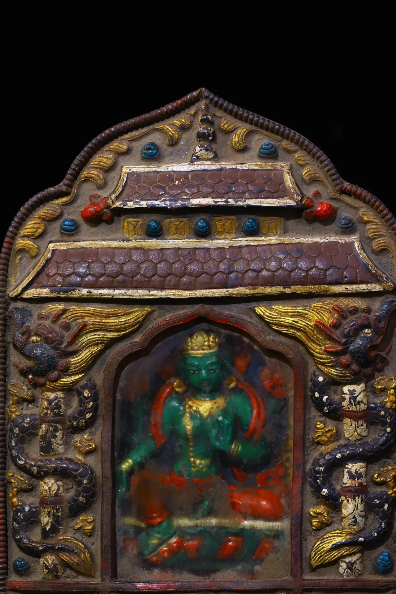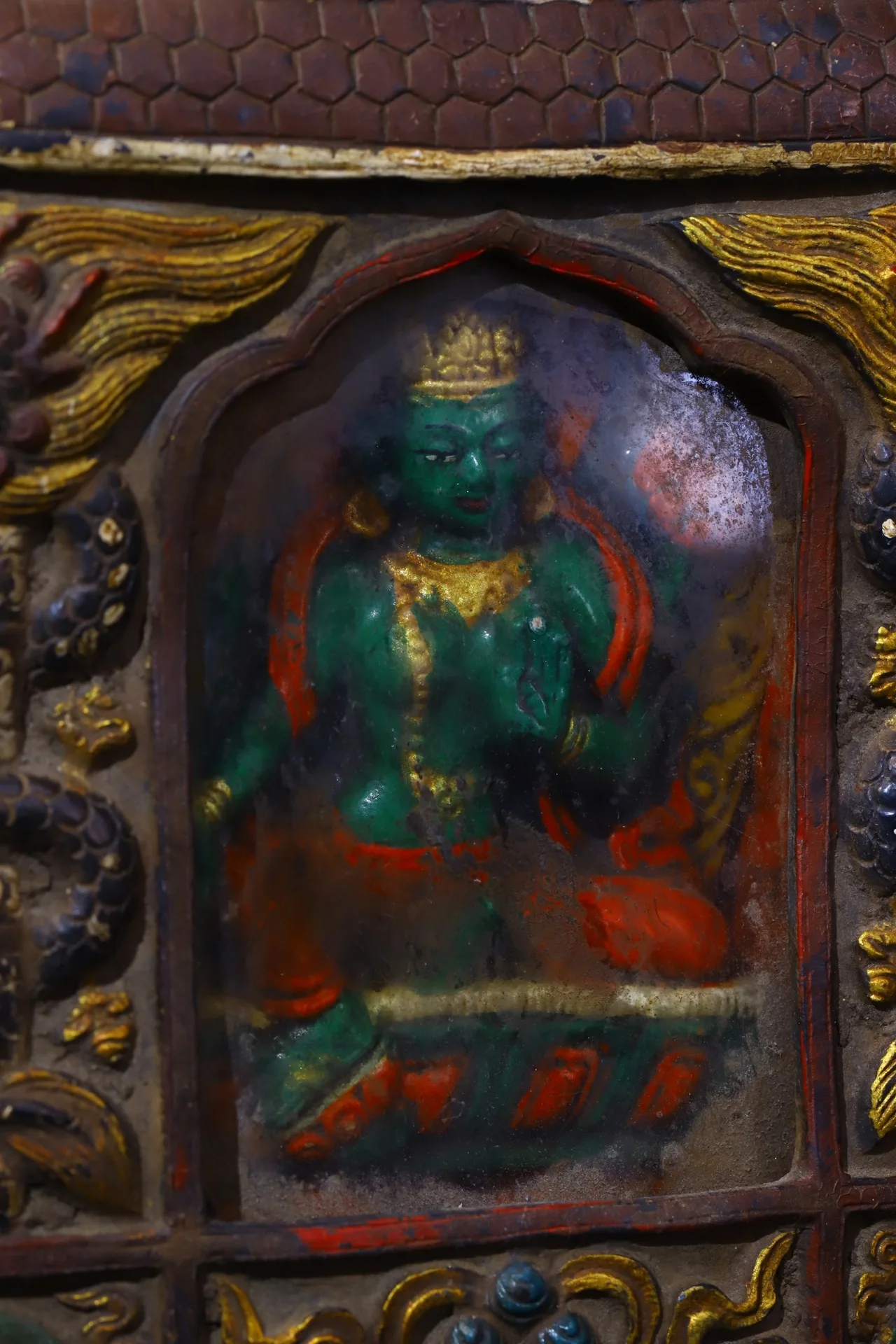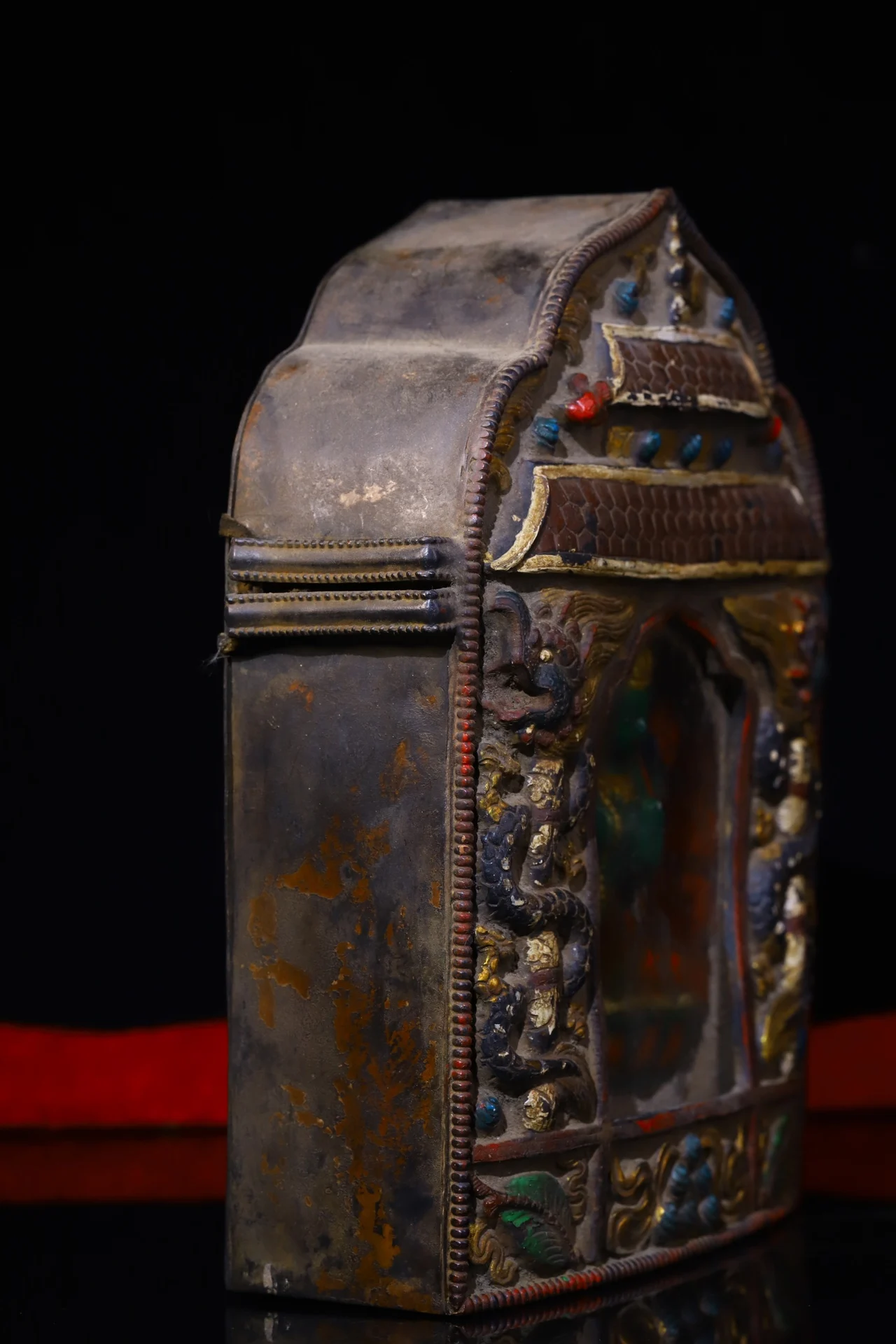 8"Tibetan Temple Collection Old Purple Bronze Cinnabar Painted Green Tara Buddha Gawu Box Buddhist Niche Amulet Worship Hall