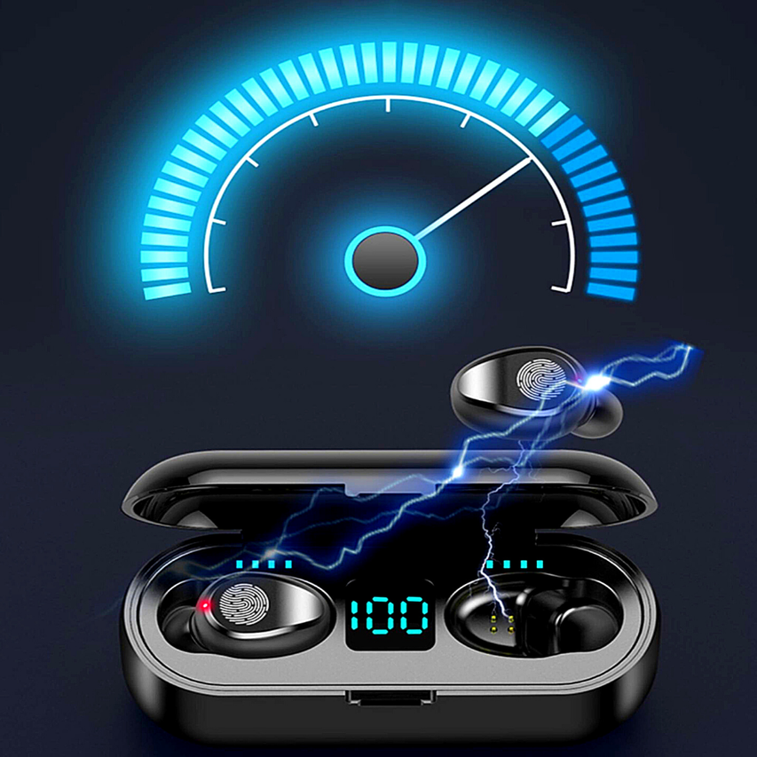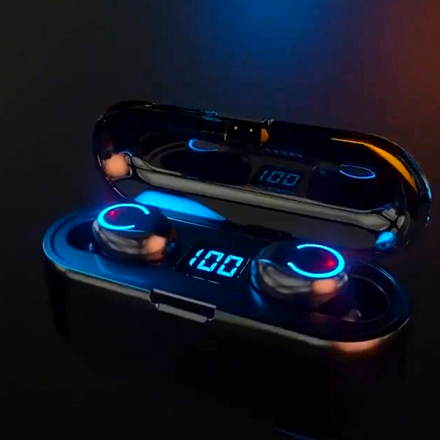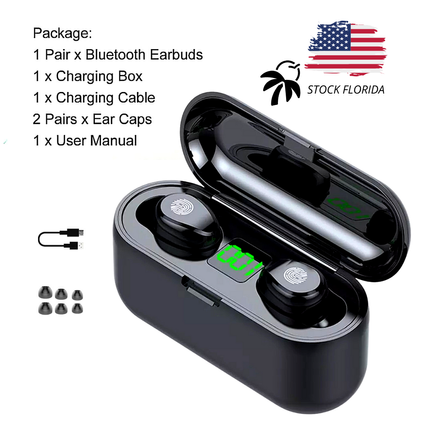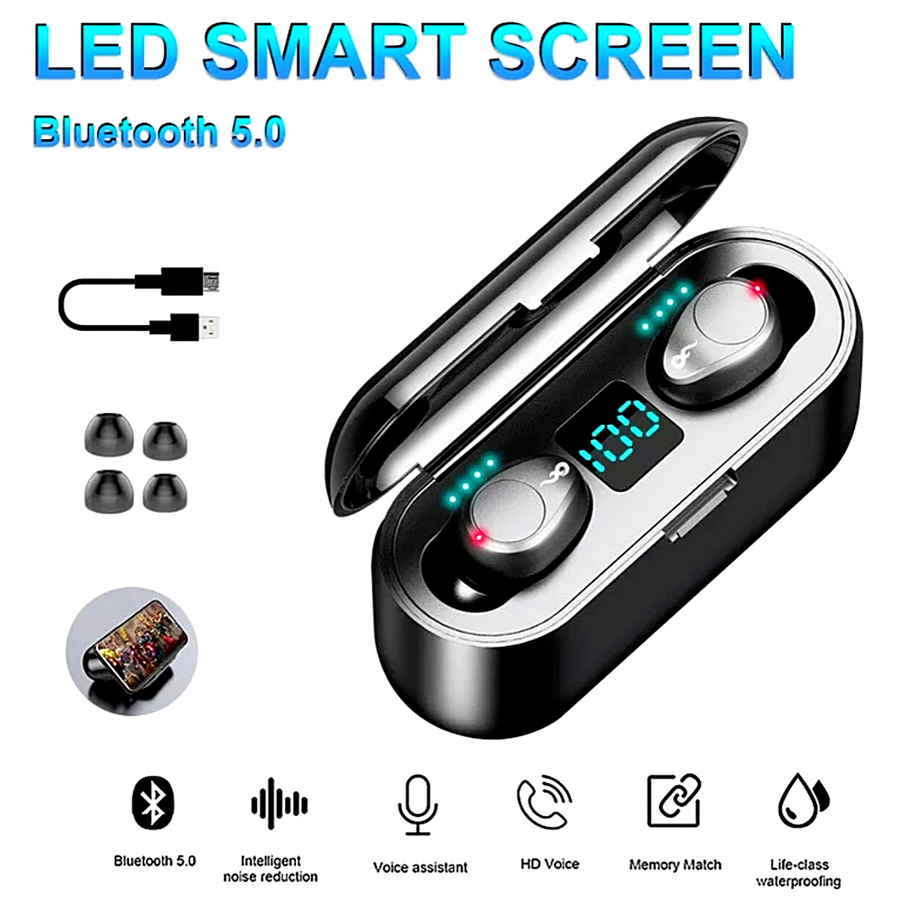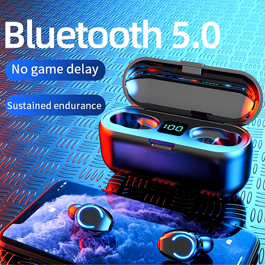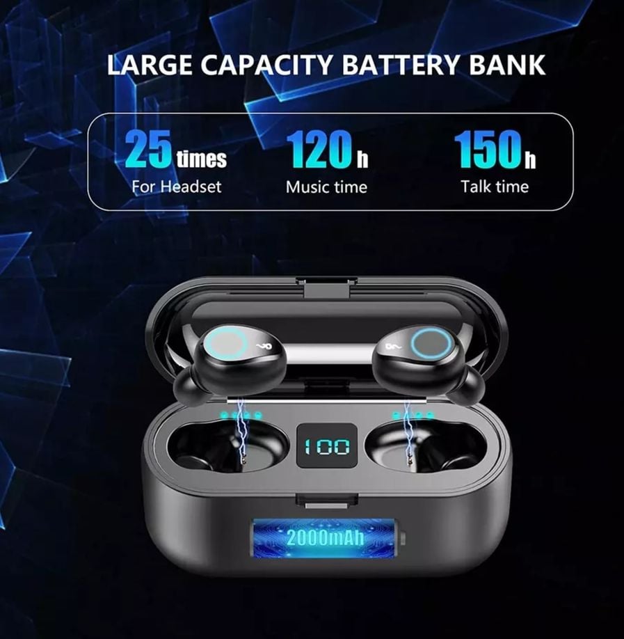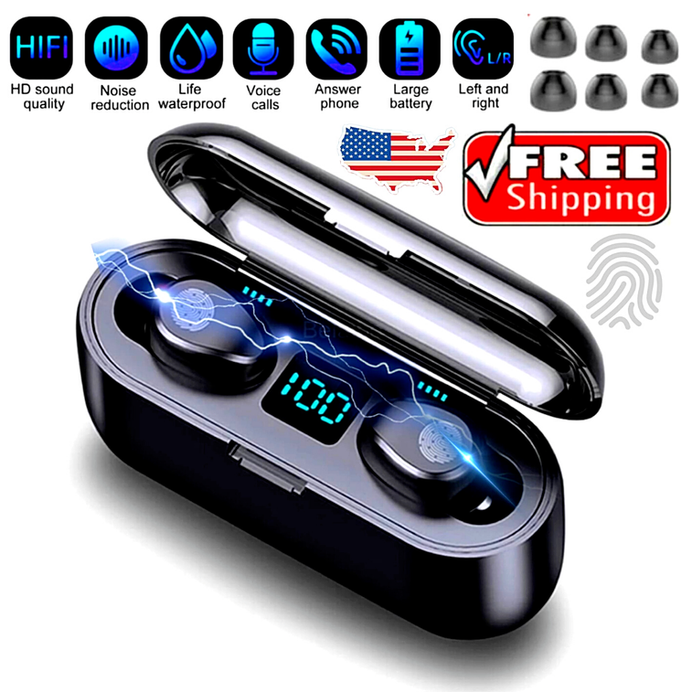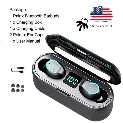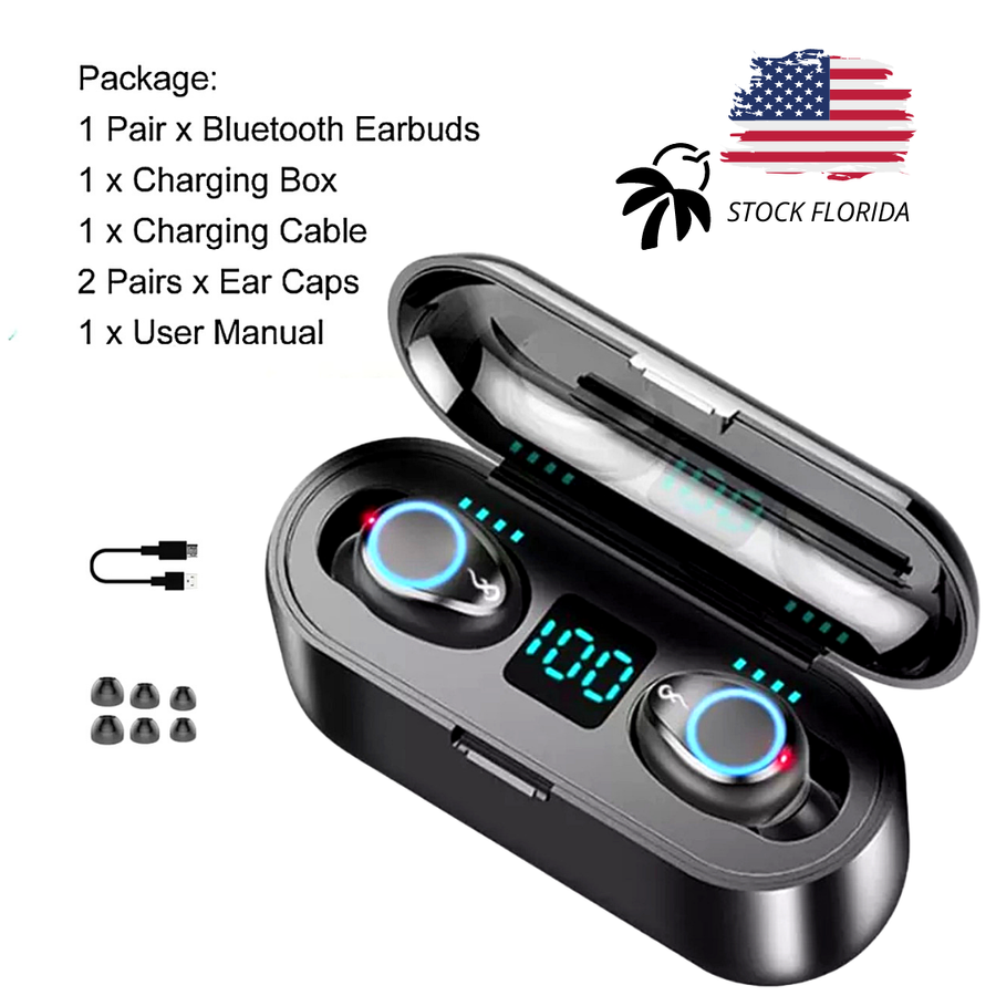 It is the F9 Headphone Bluetooth Wireless Series, these devices are one of the best devices accepted in the market in relation to price: quality: sound: functions, among their characteristics they have a Touch Control grip, a high fidelity sound (HIFI) They are ideal for the use of daily life sports Gym since they come equipped with a level of waterproof against sweat and splashes of water and dust, they can be easily paired with any device with their autopairing function, they can be used in a Binaural way associated with 1 team o 2 teams at the same time with different music or calls, you can share with your loved one with different functions, they bring a powerful charging box, so that they can perform a whole day of work, when their headphones run out of charge after 3 o 4 hours of use, you can simply place them in your portable charging box for half an hour and you will have your headphones ready to work again, you can repeat this 3 or 4 times without having to charge. ar the charging box, they also have the power bank function included so that in an emergency you can give life to your phone (DO NOT USE THIS FUNCTION TO TRY TO GIVE A FULL CHARGE TO THE PHONE OR TABLET) it is simply an emergency function to charge a little your phone., We are Jekyll USA and we are located in Florida all our packages are shipped quickly and we have customer service for any detail question or doubt, we also have guarantees and all our equipment is passed through a rapid test before being sent by our technician to guarantee the experience on your side (using gloves and safety measures), thank you for visiting our store, we are eager to assist you. These headphones are compatible with any equipment or phone with bluetooth !!! Features: Superior Music Quality: Upgraded Bluetooth 5.0 and noise canceling no wire, no trouble, high-quality chip, built in Mic and HD speaker, make these noise canceling earbuds perform best in bass sound. Enjoy it while playing high fidelity video, Hi-F music- Portable charger for mobile phone charging. Not only does it power your headphones, but it also ACTS as an emergency charger. Optional for single/double ears. Two earphones can be connected to a mobile phone at the same time, or they can be used separately to connect two mobile phones. IPX4 water-resistant and dust proof. Water-resistant for daily life, support outdoor sports on rainy days, sweat in the gym with enthusiasm and no scruples. But as a mobile phone stand, the multi-function headphone compartment can not only serve as a mobile phone stand when you are watching TV series, but also liberate your hands. Active noise reduction, HD calling. V5.0 chip upgrade clear call, shielding ambient noise. Communicate effectively. Specifications: Resistance: 32 ohms Frequency response range: 20-20000Hz Sensitivity: 108±3dB Bluetooth version: Bluetooth 5.0 + EDR Touch Control Connection Distance: 10m Headphone protocol support: A2DP/HFP/HSP/AVRCP Headphone battery: 50mAh Charging case battery: 2000mah Packaging size: 130*115*35mm/5.11*4.52*1.37'' Weight: 120g Latest Bluetooth V5.0 Technology. Long-term use of high-capacity batteries. Using CVC8.0 noise reduction technology. Designed for sport, wearing sturdy clothes. Sub woofer stereo. High Definition Microphone Support Call. With Digital Display Function. Package Included: 1*Pair of Bluetooth Earbuds 1*Charging dock 1*USB Charging Cable 1*User Manual 6*Earbud caps