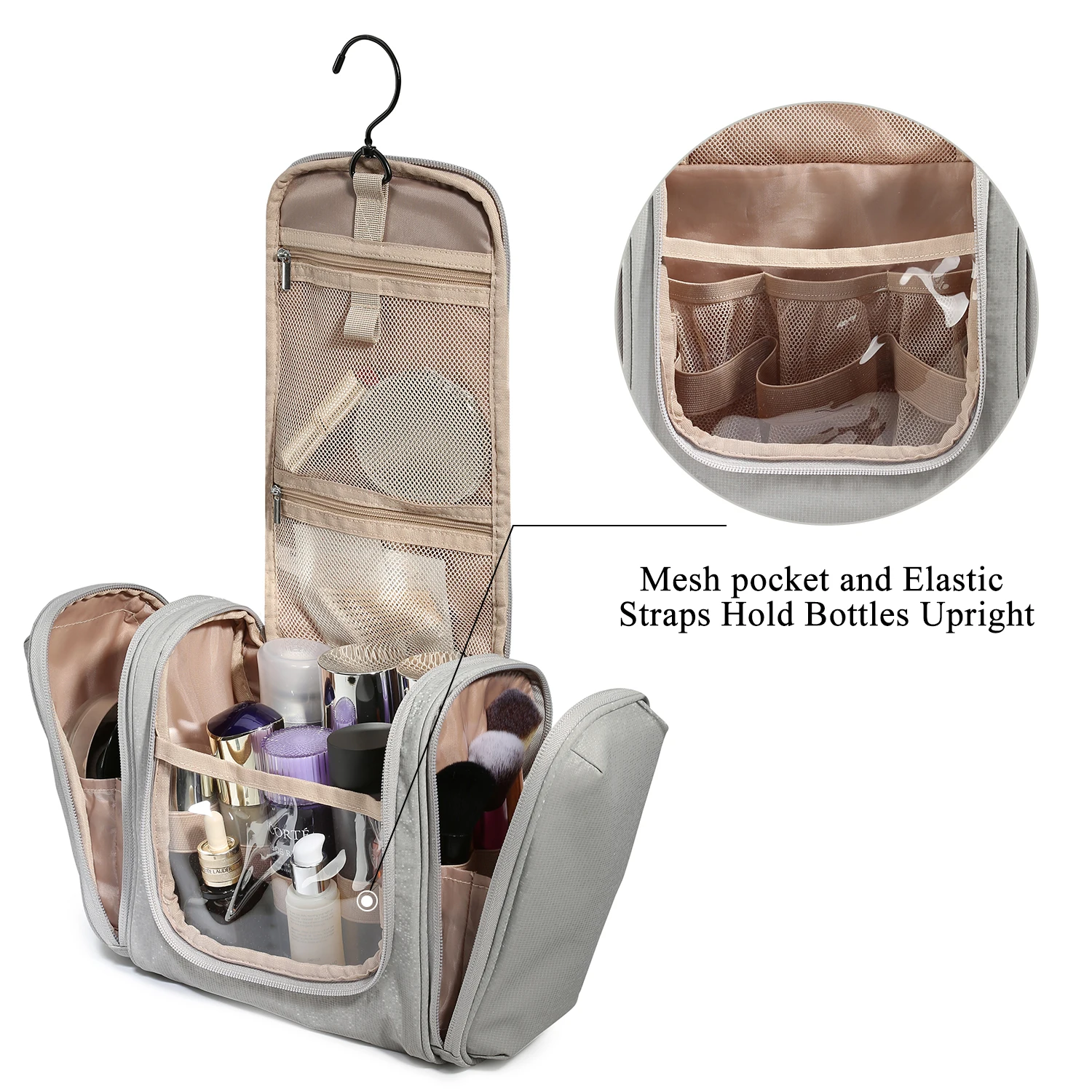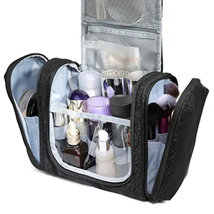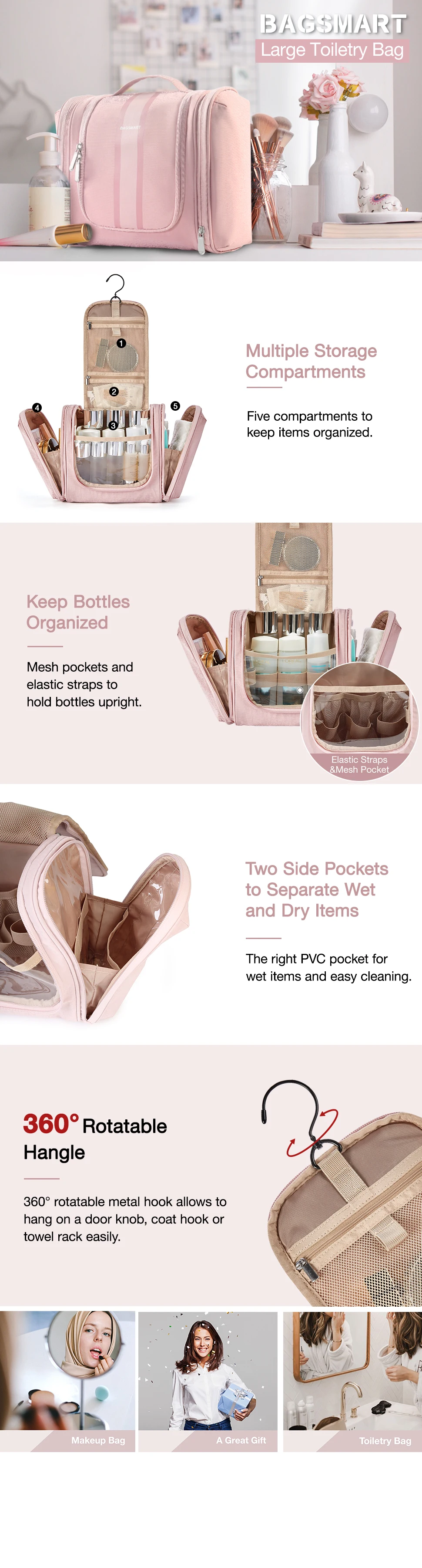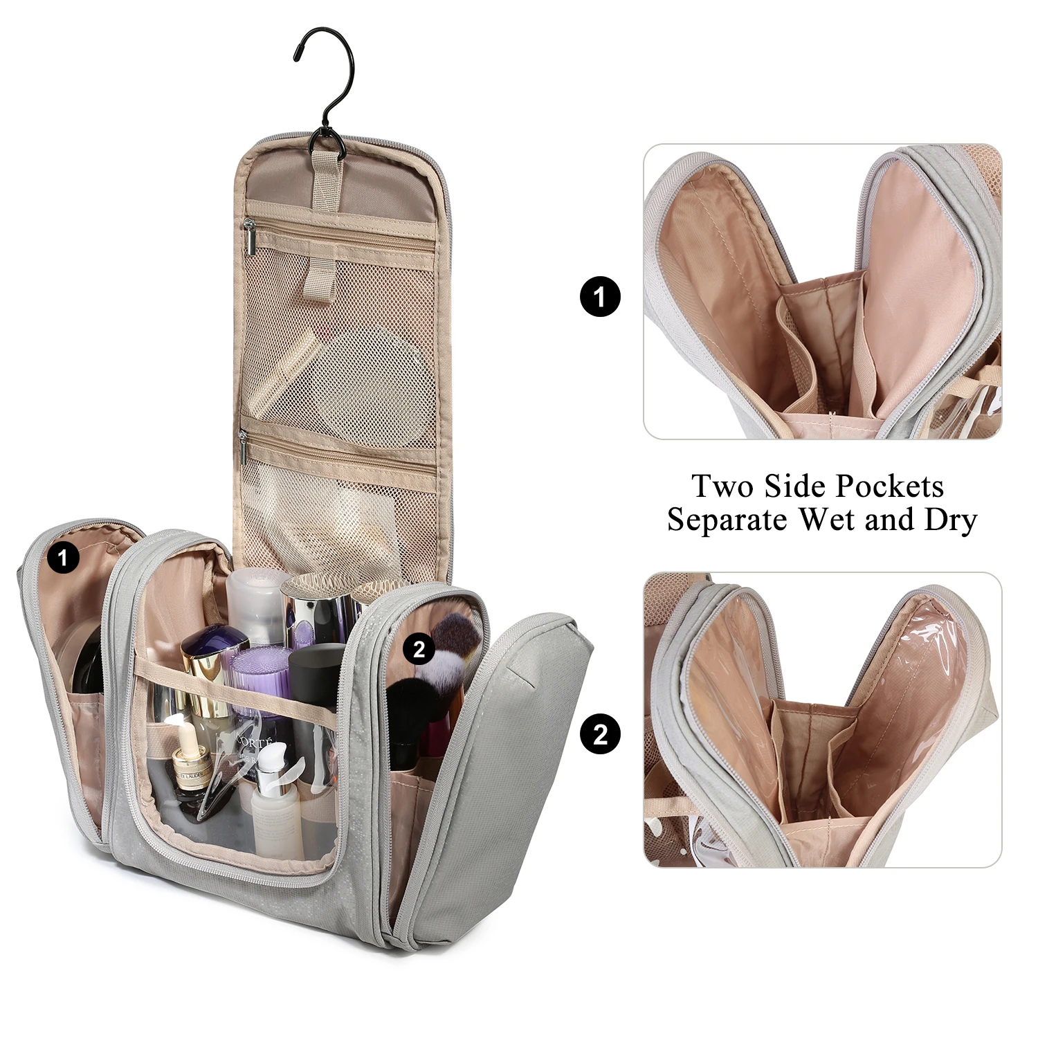 • SPECIAL DESIGN - The inner pocket has an elastic band that allows the bottle to stand upright. The side pockets of the two travel toiletry bags allow for separate storage of wet/dry items. The right pocket is made of PVC material for easy cleaning and drying, perfect for makeup brushes, toothbrushes, wet towels. 360-degree rotating non-slip metal hook can be stowed away, a variety of hanging methods.