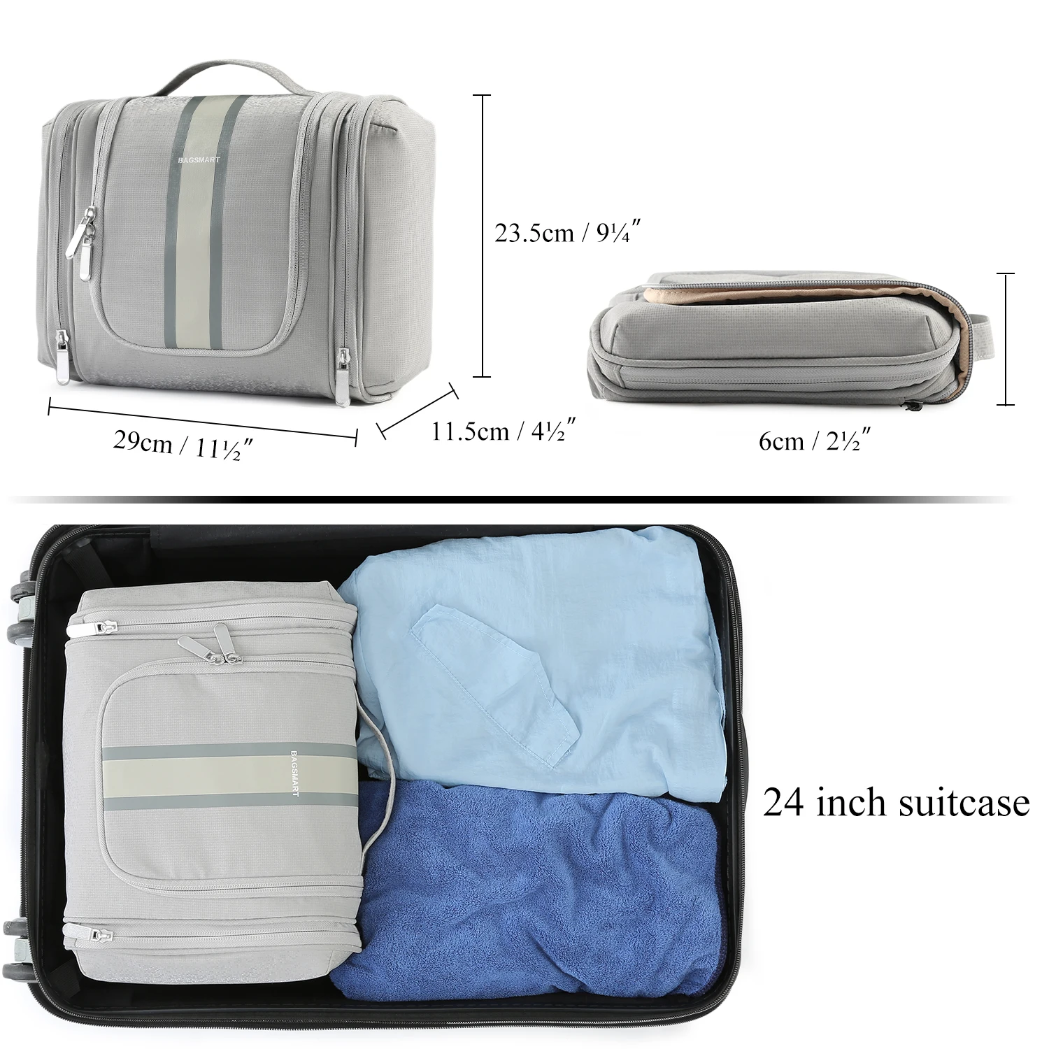 • Large Size Toiletry Bag - Expanded Dimensions: 29.06cm L x 11.42cm W x 23.25cm H / Folded Dimensions: 22.96cm L x 23.69cm W x 6.39cm H. 1 large main compartment can hold various sizes of toiletries and makeup. 2 zippered pockets on both sides to keep dry and wet separate. There are 2 zippered mesh pockets on the top to store some small items. Suitable for 3-5 day trips.