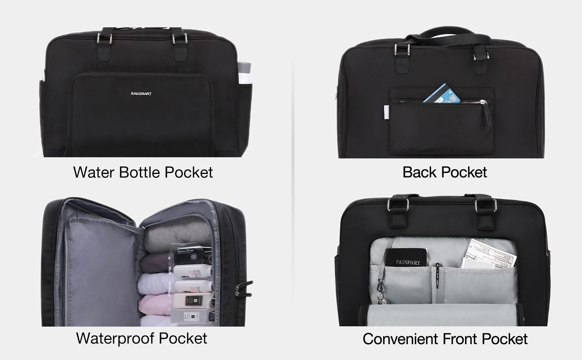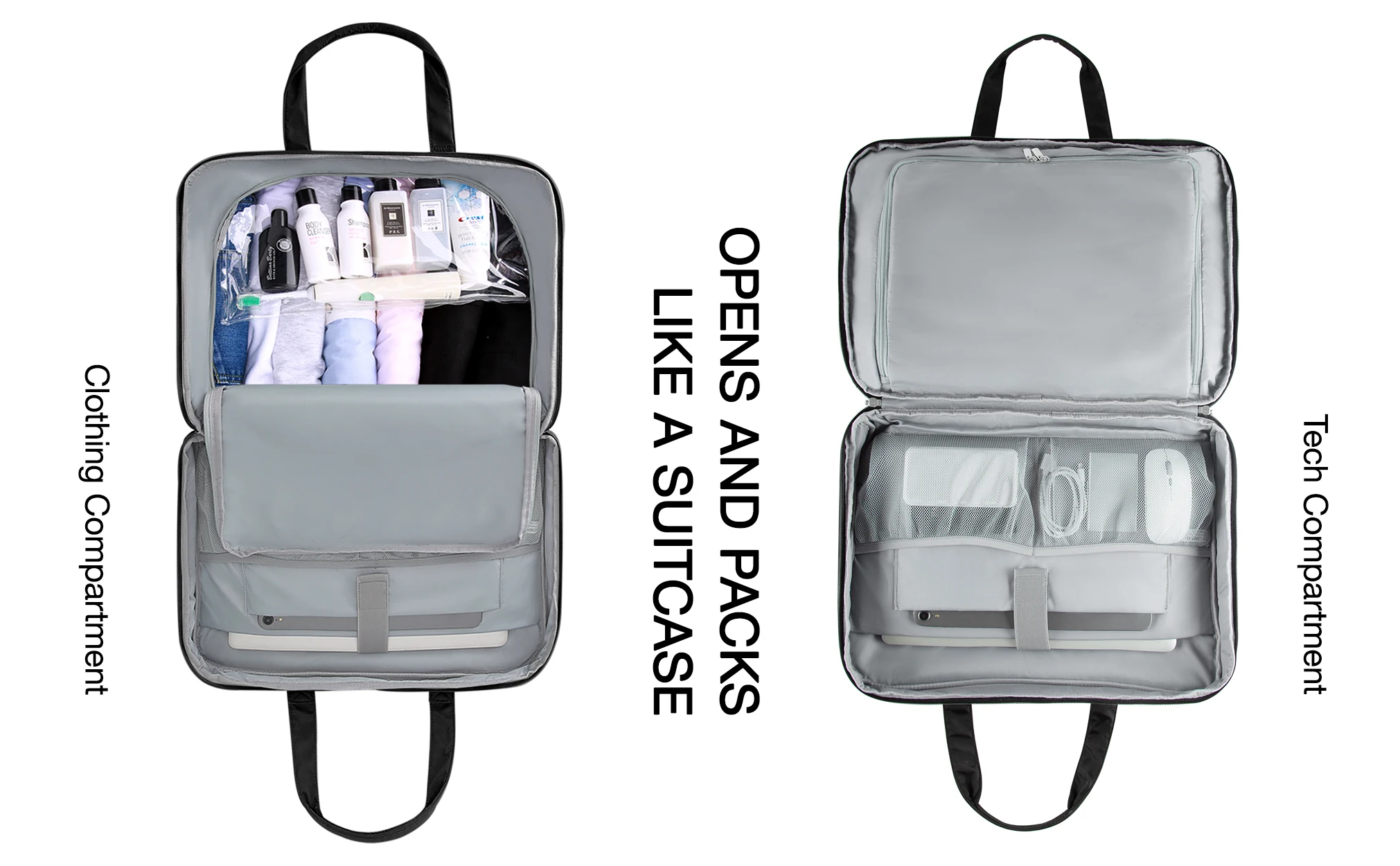 ②Business and work compartments include 15.6"/15" Macbook Pro computer compartment/iPad compartment/business meeting manager folder/normal folder; travel clothes living compartment/overnight bag can hold 3 to 6 shirts, 2 jackets or Sweater, two pairs of trousers, one pair of shoes, 100ML*6 bottles of toiletries, dry and wet separation design, TPU transparent waterproof bag is used to satisfy customers' wet or dirty clothes storage; RFID internal pouch for credit card anti-theft brush; equipped with independent Shoe pocket; external front magazine pocket with passport compartment, sunglasses/mouse/cable/pencil/keychain; cup pockets on one of the left and right (must be deep enough to prevent the water mark from falling off easily); One side is the mobile power charging pocket; the back lever inserts design a more private storage pocket to store important documents such as boarding passes;