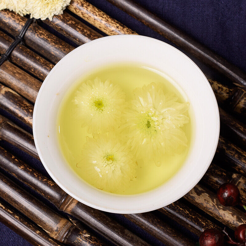 This tea is slightly sweet and refreshing, with a cooling effect on the body. Chrysanthemum Tea is believed to improve cloudy vision and gradually reduces liver inflammation. It is frequently included in formulas for sinus congestion, fever, complexion problems, and high blood pressure. The infusion is a nearly fluoresent yellow with a fantastically light taste. Chysanthemum teas are often served with meals and complement many main dishes.