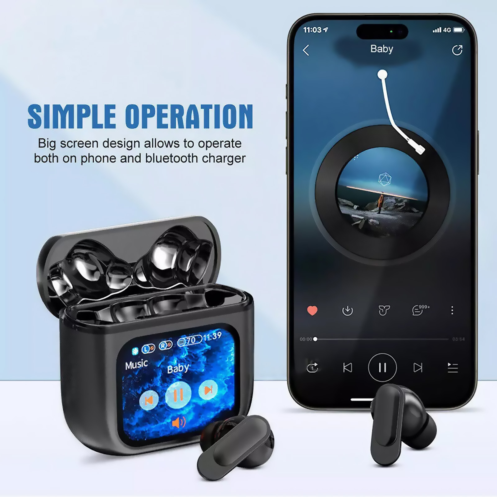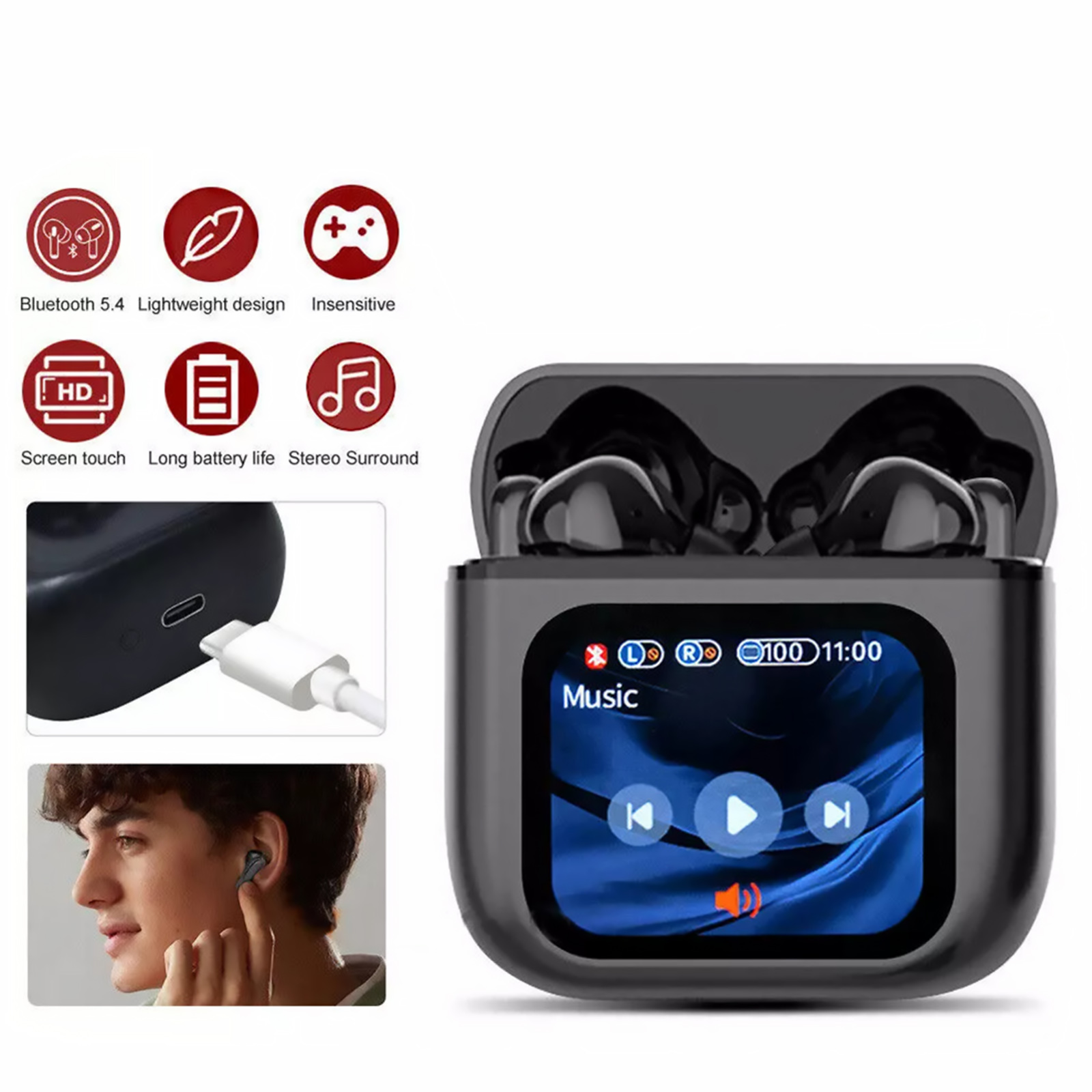 Features: 100% Brand new high quality. Built-in bluetooth v5.4 smart chipset. ANC+ENC intellihent noise reduction clearer calls Touchscreen function, control the earbuds settings, manage calls and playback, control your audio setting and battery level and set your alarm without taking out your phone, through the screen of the charging case. Touch screen Bluetooth headset equipped with LCD, MP3 play music, sound equalizer, multiple languages, message reminder, multi-wallpaper switch use, screen brightness adjustment, make and receive calls, voice assistant, find earbuds other kinds of functions. Ergonomic design makes it comfortable to wear and it will not hurt you after you wear it for a long-time.