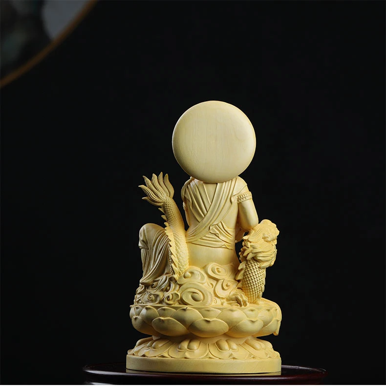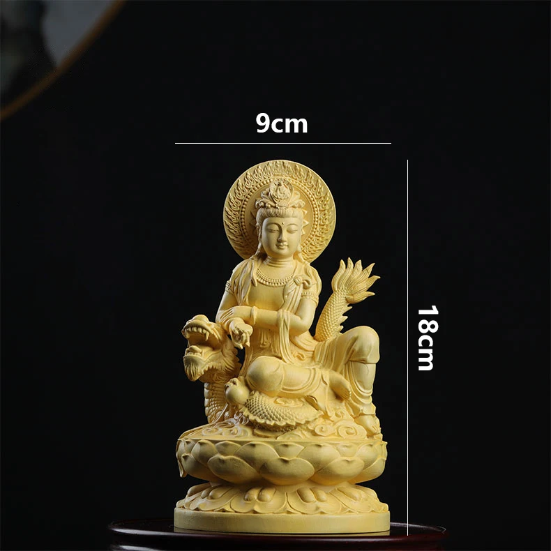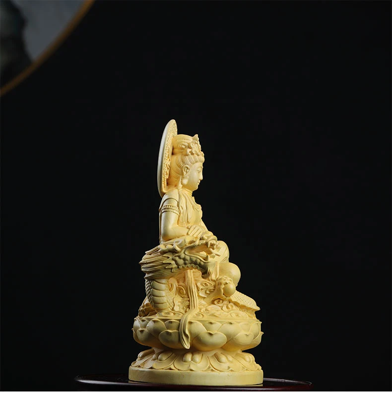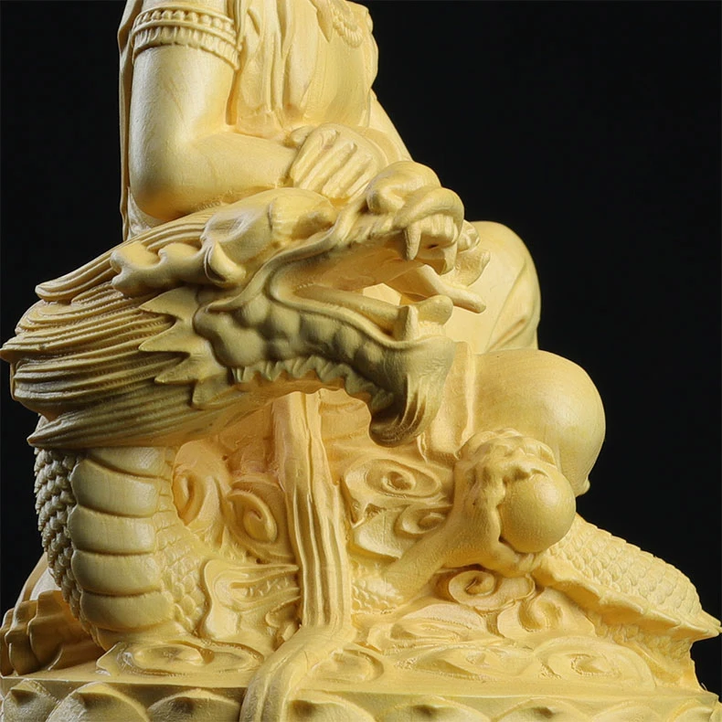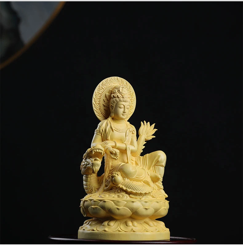 Boxwood 13cm Dragon Guanyin Sculpture Wood Buddha Statue Guan Yin Lucky Worship Feng Shui Home Decor