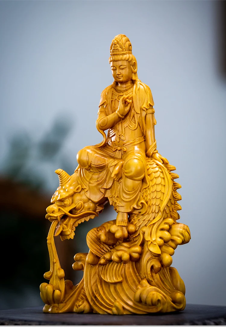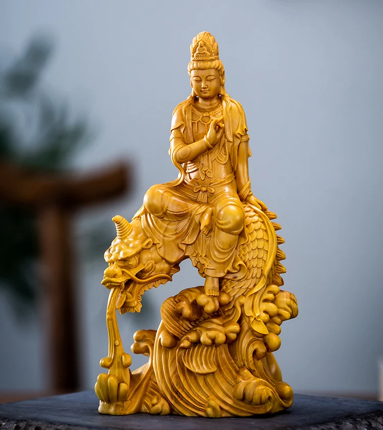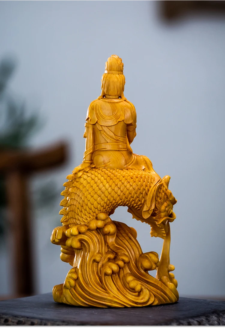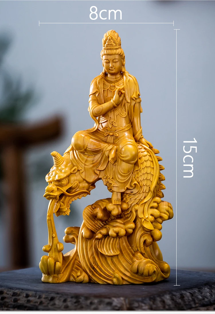 Boxwood 15cm Guan Yin Wood Buddha Statue Dragon Guanyin Bodhisattva Feng Shui
