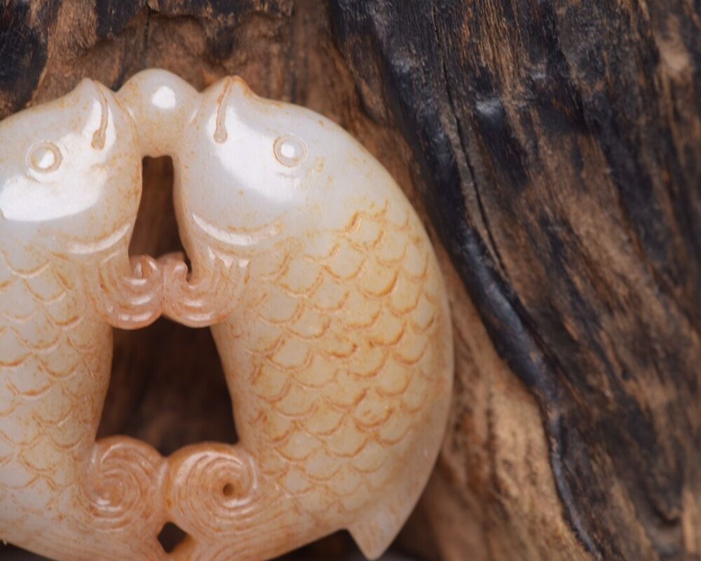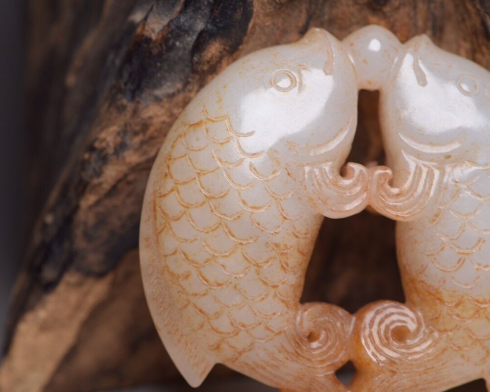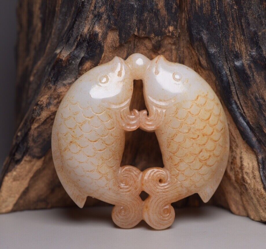 China Old Natural Hetian Jade Hand Carved Pair Nice Fish Statue Pendant Jewelry Size:(2.28x2.28x0.62) "inch = (5.8×5.8×1.6)cm Weight: (66) g