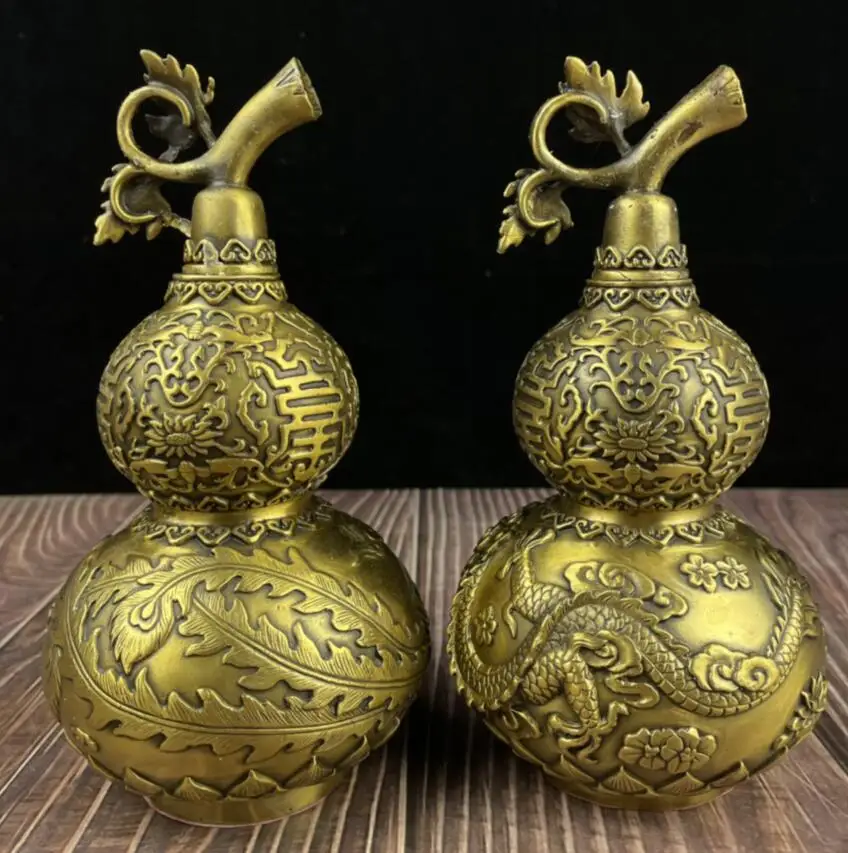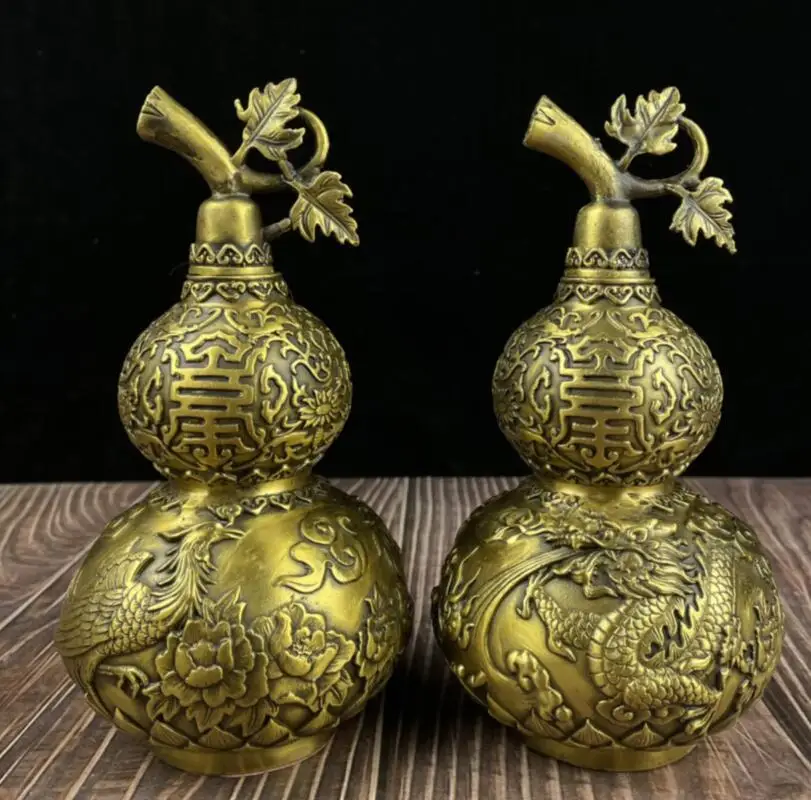 China seiko brass dragon phoenix gourd crafts statue A pair