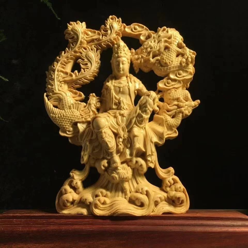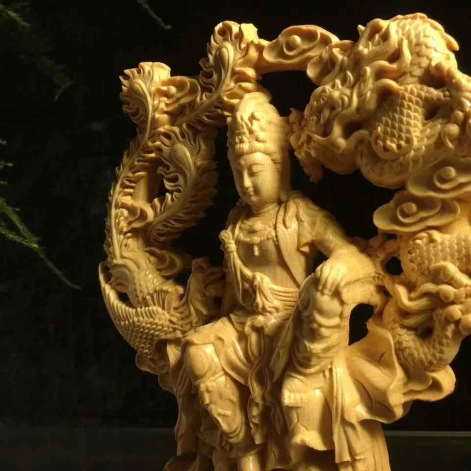 Chinese Guanyin Woodcarving Dragon and Phoenix Statue Solid Wood Carving Home Decor Buddha Statue