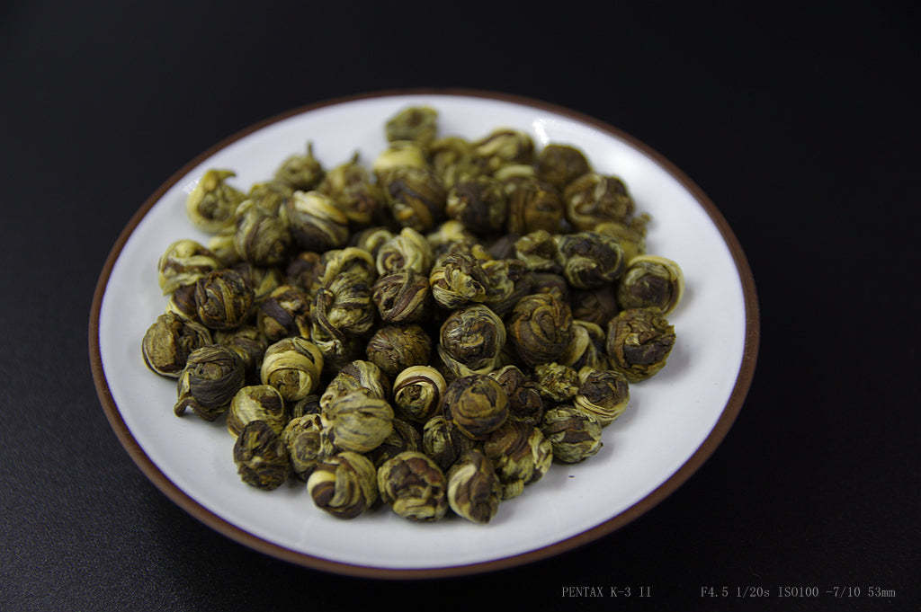 Jasmine Balls are hand rolled and tied. The leaf appearance tends toward a mottled and white appearance, indicating very early new season tea and extremely careful plucking. New season tea of this quality is rare and only available for 2-3 weeks each year. When you infuse a Jasmine Ball, you will see the outer leaves begin to uncurl. Once the infusion time is complete the tea looks like a chrysanthemum flower with long petals on the outside and the short petals on the inside. The chrysanthemum implies tranquillity, beauty, longevity and health
