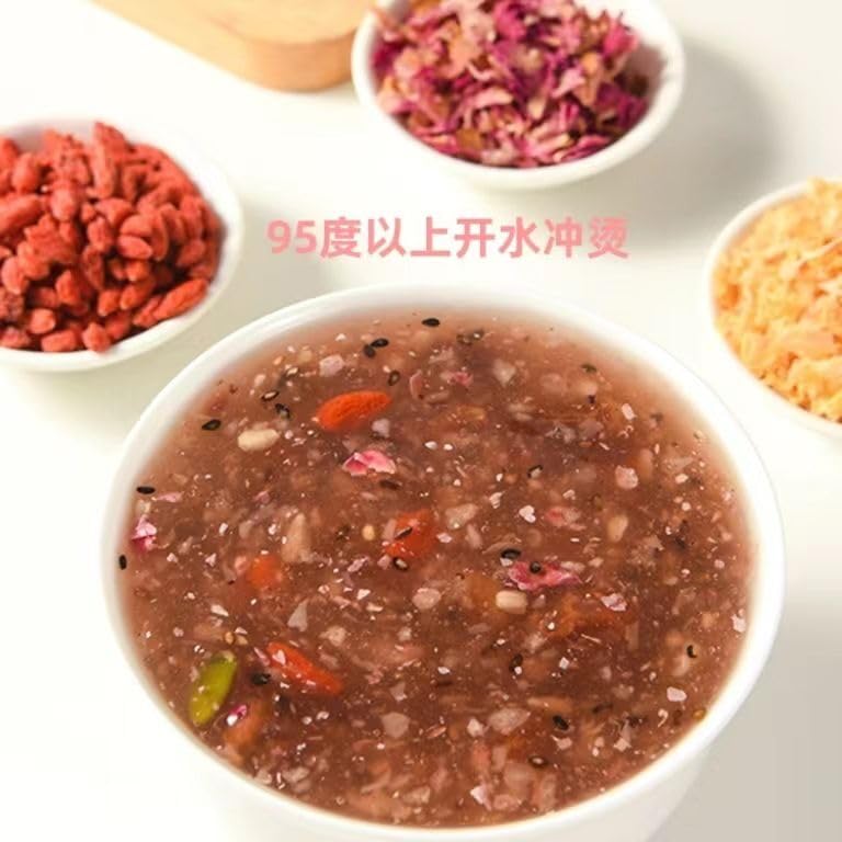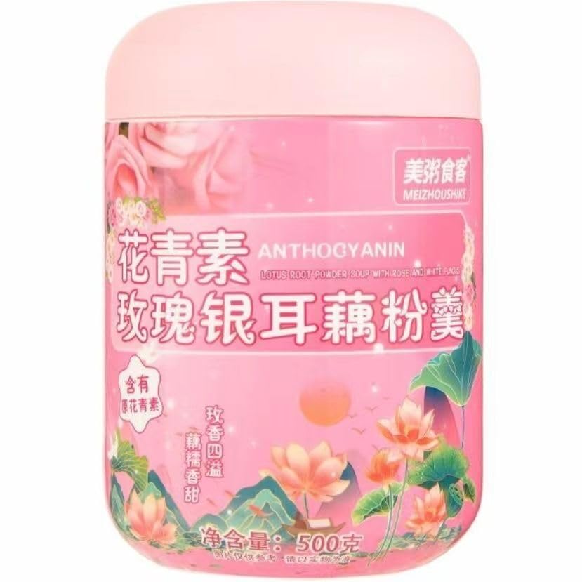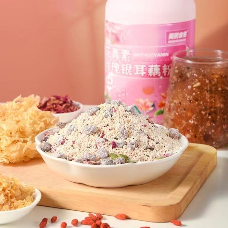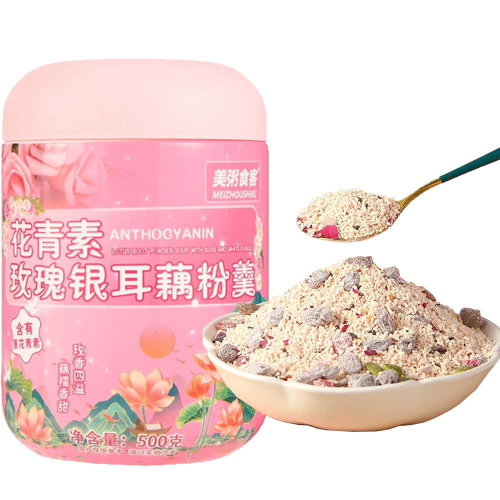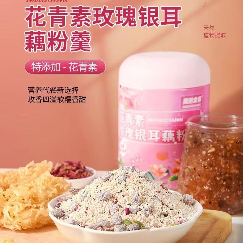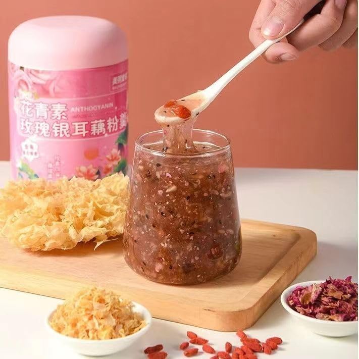 Anthocyanin rose tremella lotus root powder is delicious and nutritious, soft and mellow, the lotus root is smooth, sweet but not greasy, and the raw material is fresh. The lotus root powder is warm and rich in nutritional value. Tremella is more comfortable for the stomach. Ingredients: lotus seed powder and pure lotus root powder, edible glucose, raisin, white fungus, black sesame, double red rose, sunflower seed, pumpkin seed, wolfberry, red date powder, xylitol, etc. How to eat: Step 1: Take some lotus root powder and pour it into the cup; Step 2: The boiling water must be above 95 ℃, preferably just boiled; The water temperature of the water dispenser is insufficient; Water: Lotus root starch=1:5 is the best. Stir well until it becomes paste. (Boiling hot water is OK, but it can be dissolved without warm water) Shelf life: 12 months Net content: 500g Storage method: please keep it in a cool and dry place.