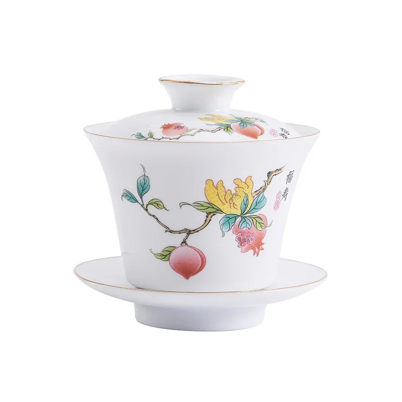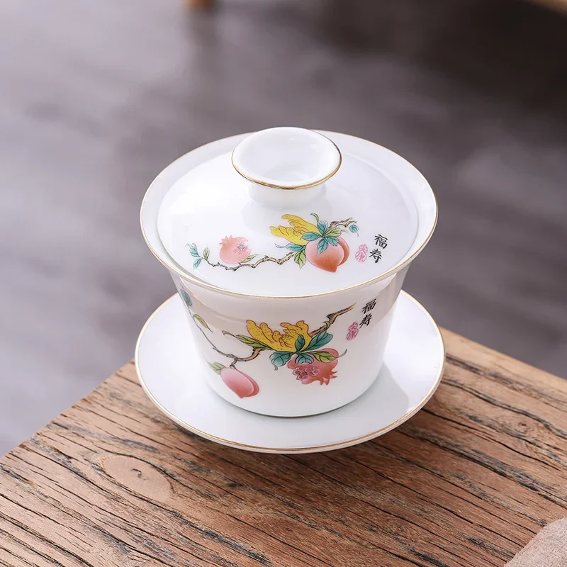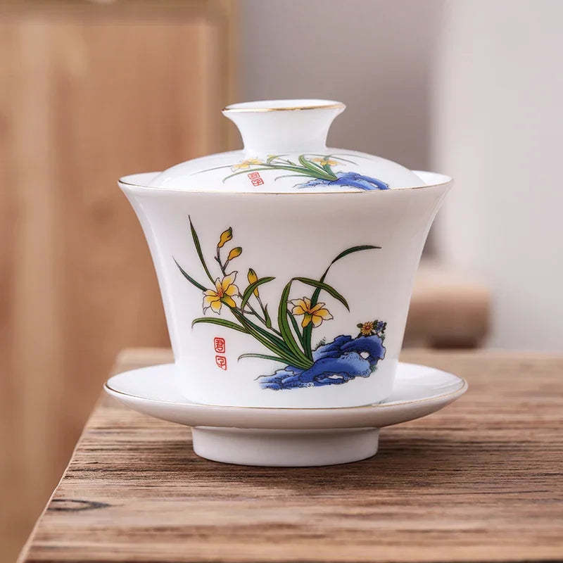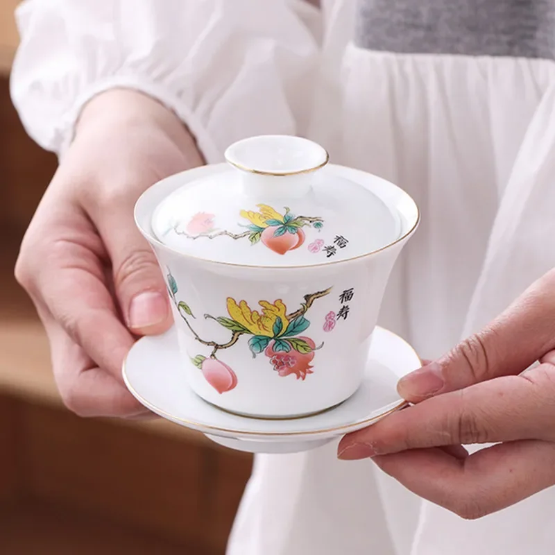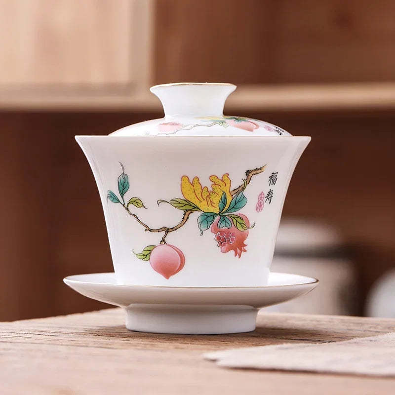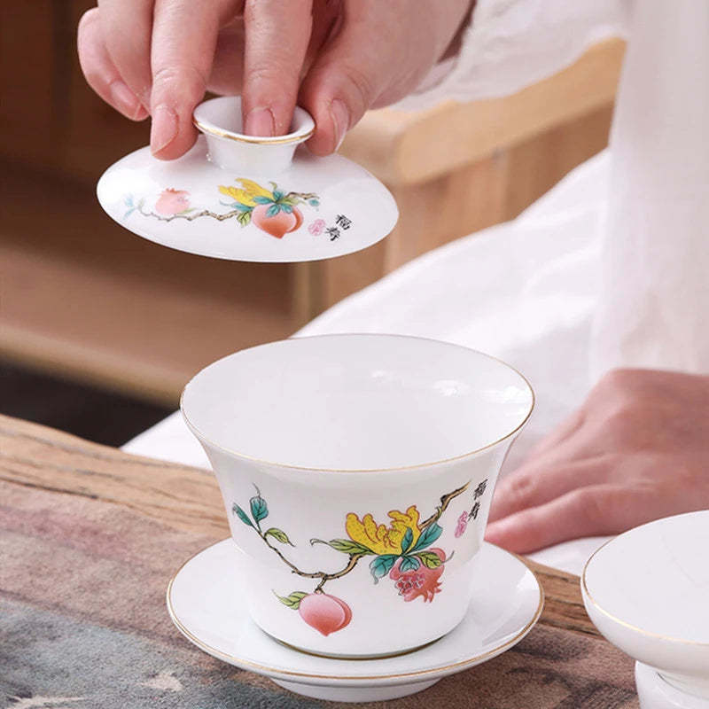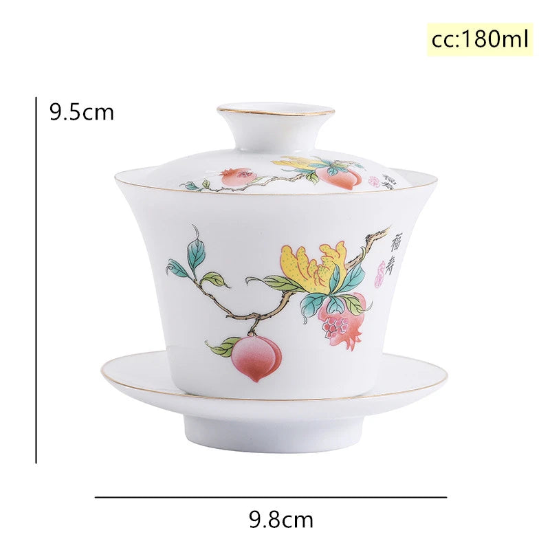 Chinese Phnom Penh White Porcelain Gaiwan Hand Painted Flowers Pattern Tea Bowl Home Ceramic Teacup Teaware Single Cup 180ml
