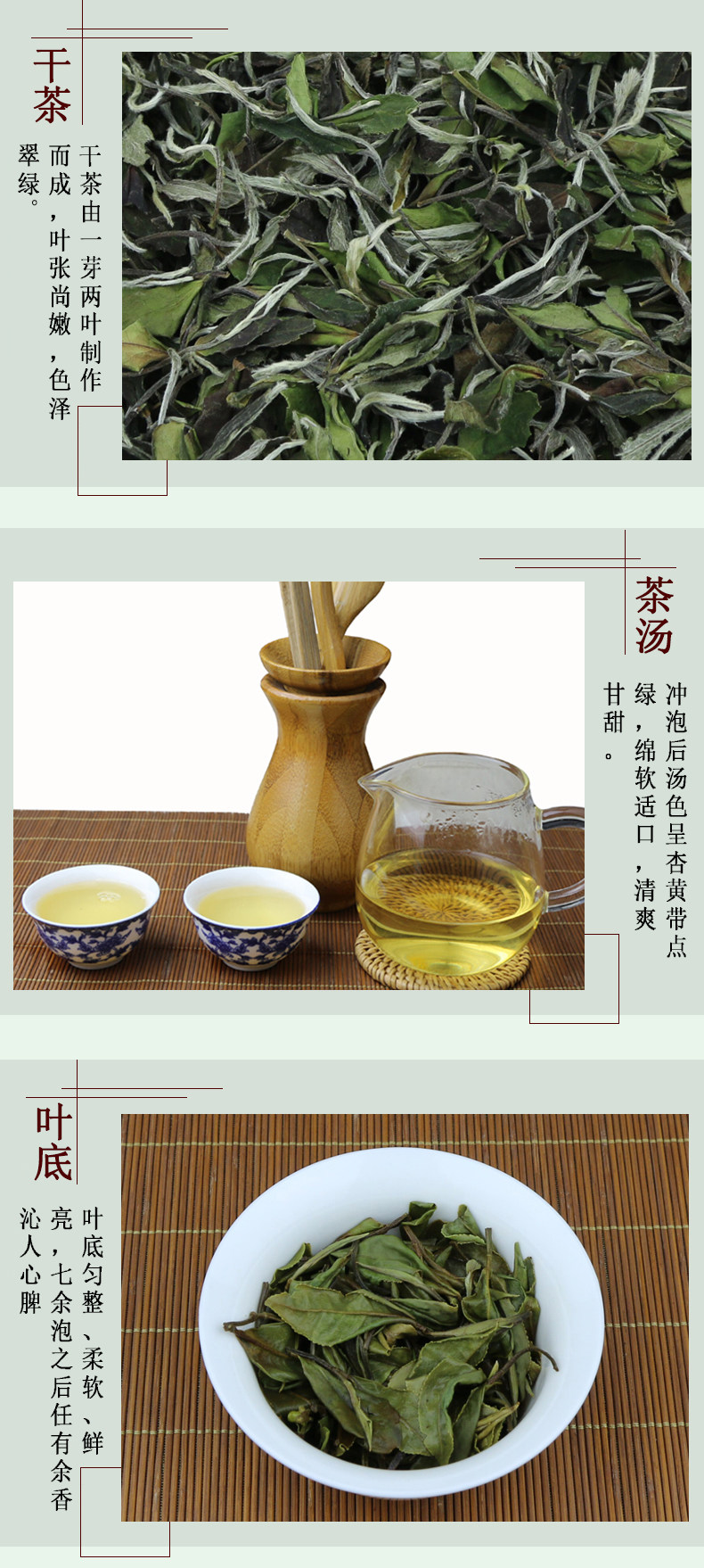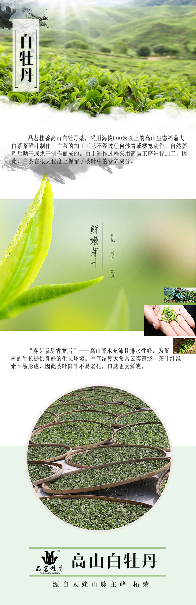 The processing rules require this tea only be picked between March 15 and April 10. It is not picked on days that may be raining or if the dew has not dried or if there is frost on the ground. No purple buds are allowed and the stems must not be too long or too short. Leaves damaged by wind, handling, insects or partially open are rejected and put into a lower grade. The best Bai Mu Dan is produced using the two leaves and a bud proportion and is naturally or mechanically withered to produce leaves that are not black or red but green in color.