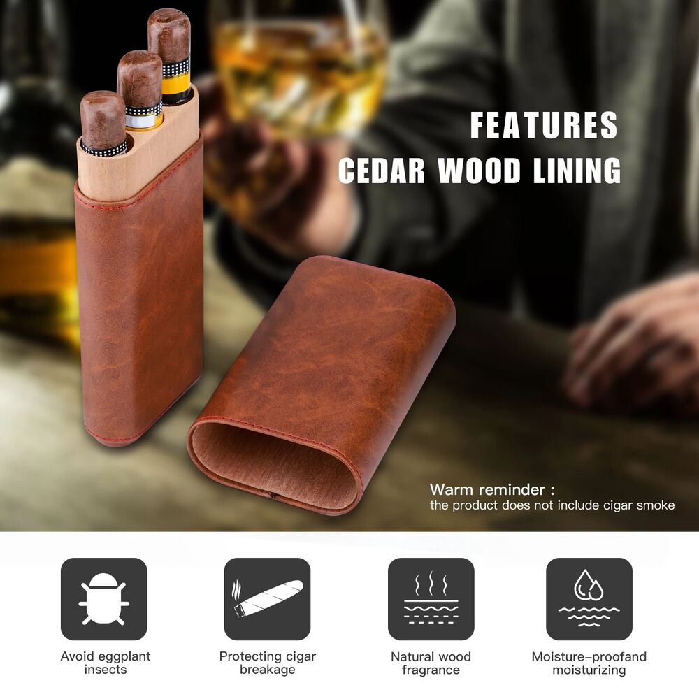 • In summary, the Cigar Cases PU Leather 3 Sticks Portable Storage Humidor Box is a compact and stylish solution for carrying and protecting cigars on the go. With its durable PU leather construction and capacity for three cigars, it provides cigar enthusiasts with a practical and fashionable accessory for portable cigar storage.