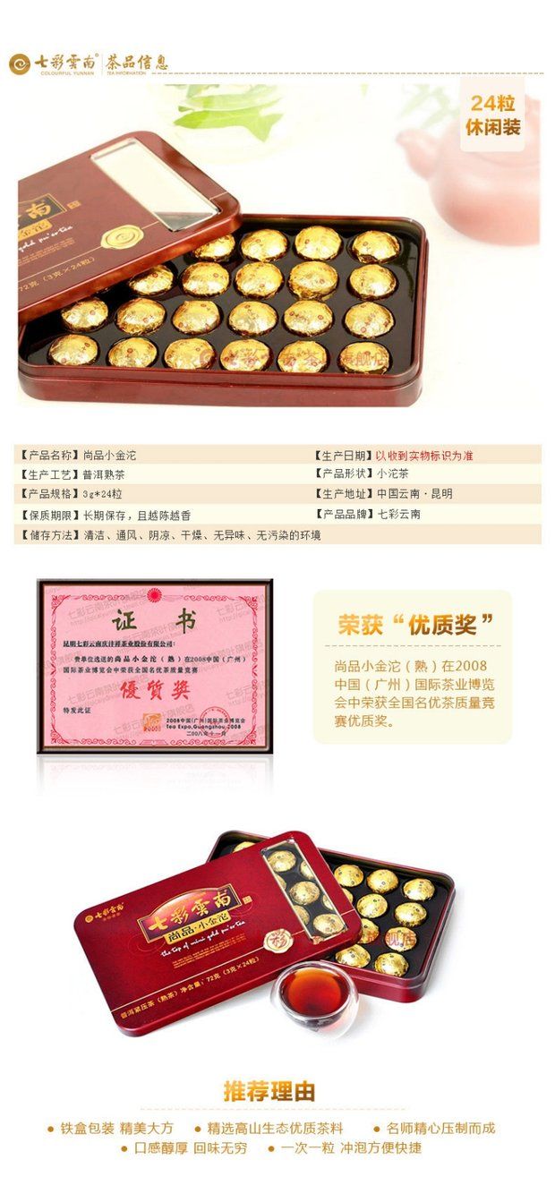 Brand: Colorful Yunnan Process: cooked tea / Puer Ripe Tea Specification: 3g * 24 capsules/box, 72 g/box, Year: random delivery of the year, subject to the actual date of receipt Storage: Store in a ventilated, dry, odorless and normal temperature environment