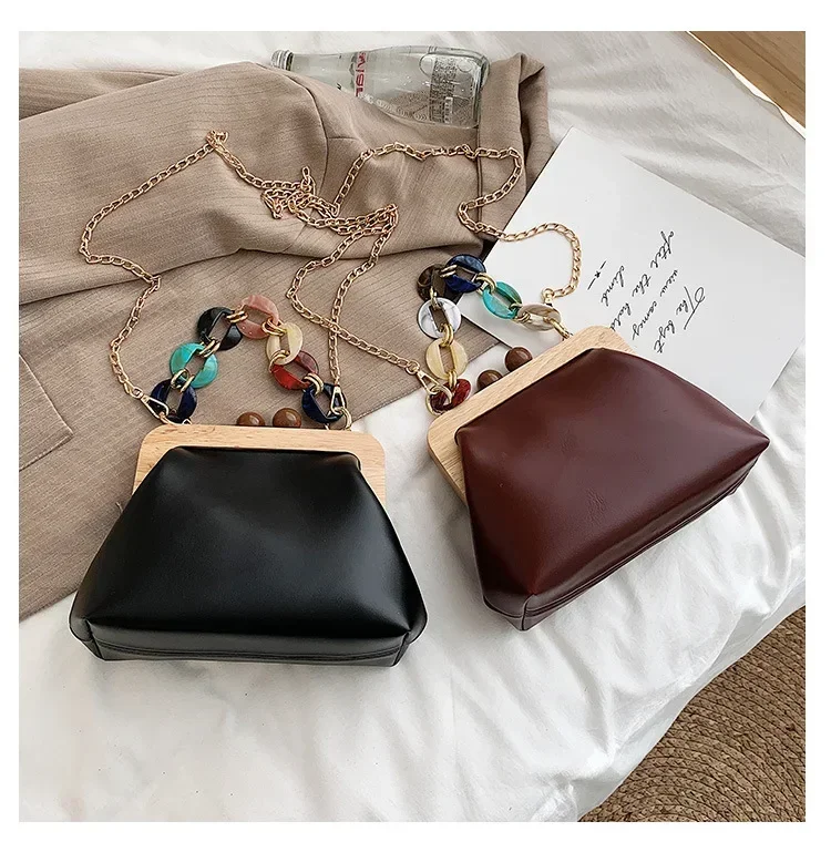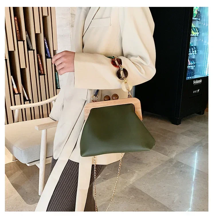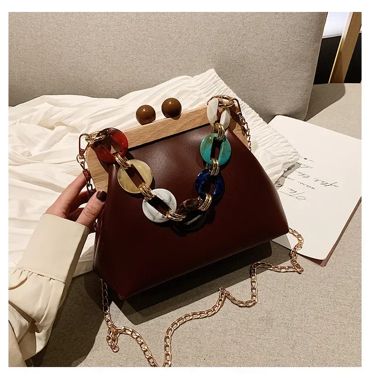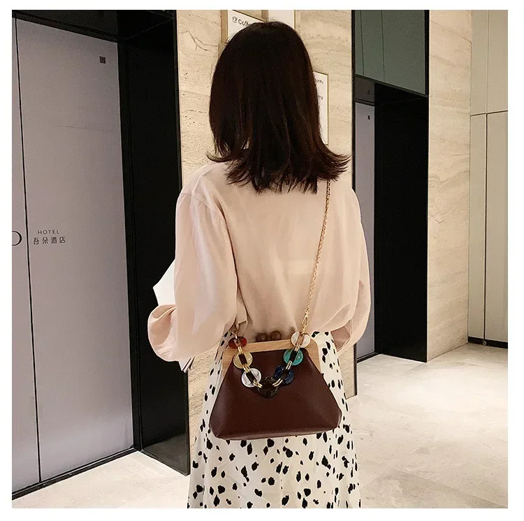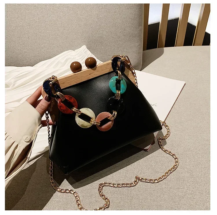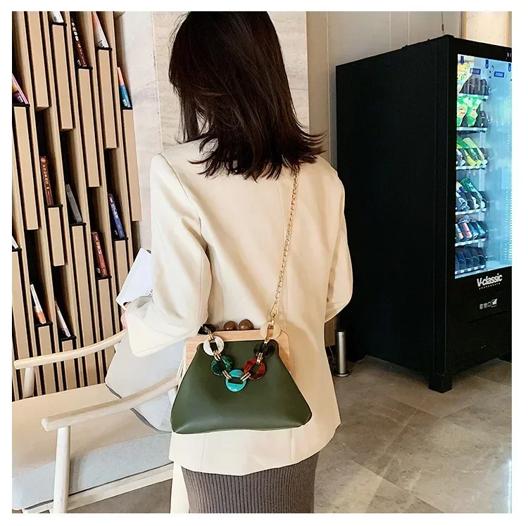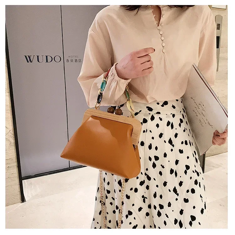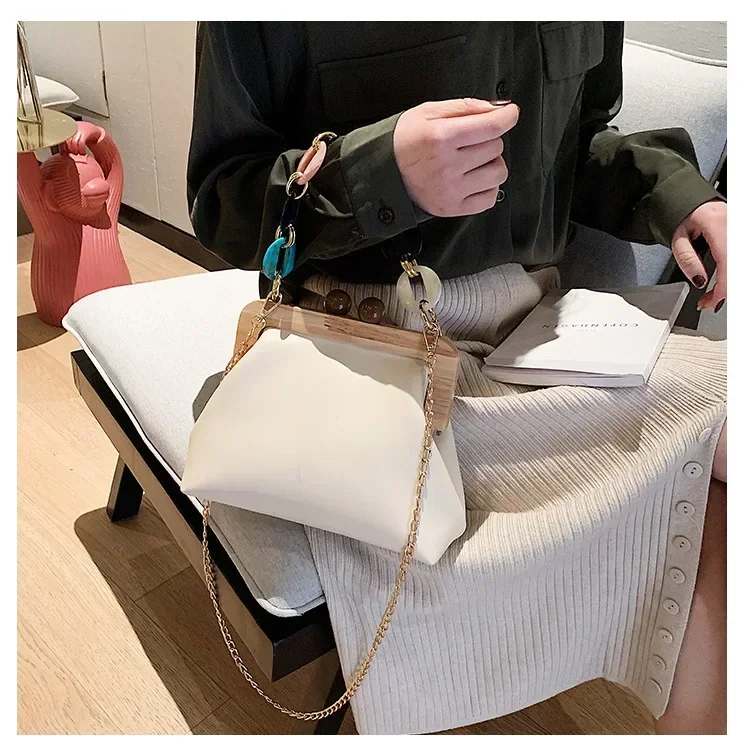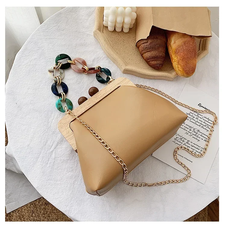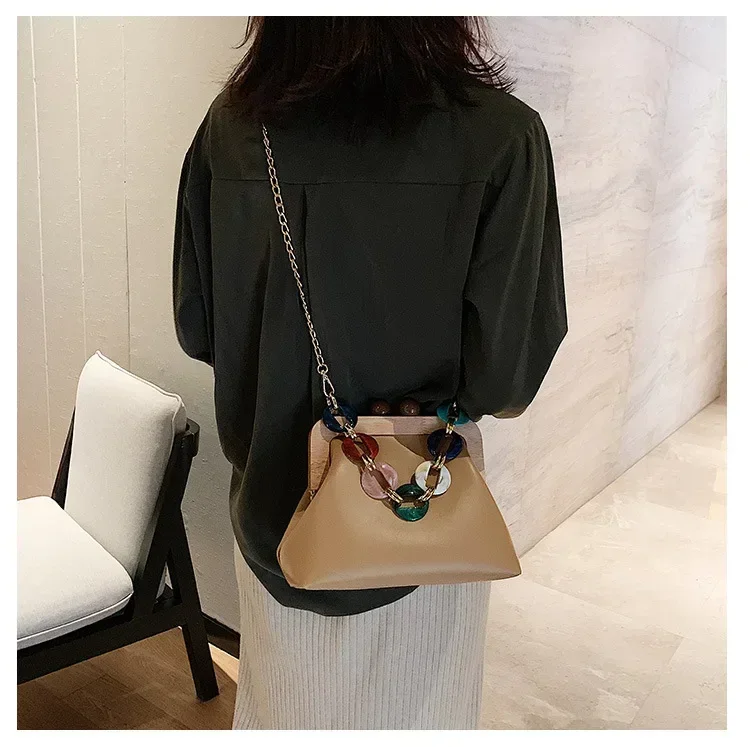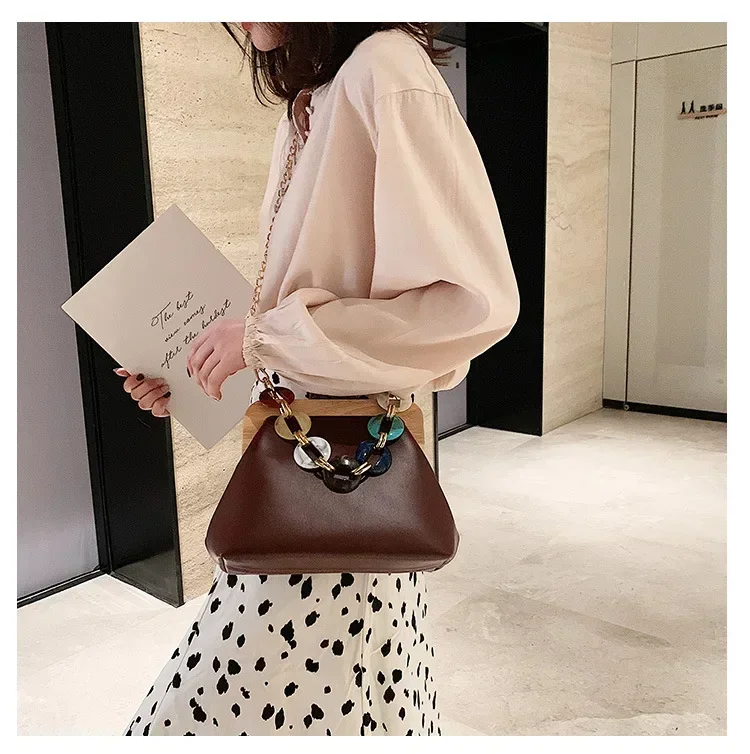 Fashion Wood Clip Buckle Shoulder Bag Woman Acrylic Chain Simple Design Trendy Casual Messenger Bag Luxury PU New In Handbag