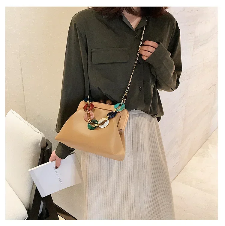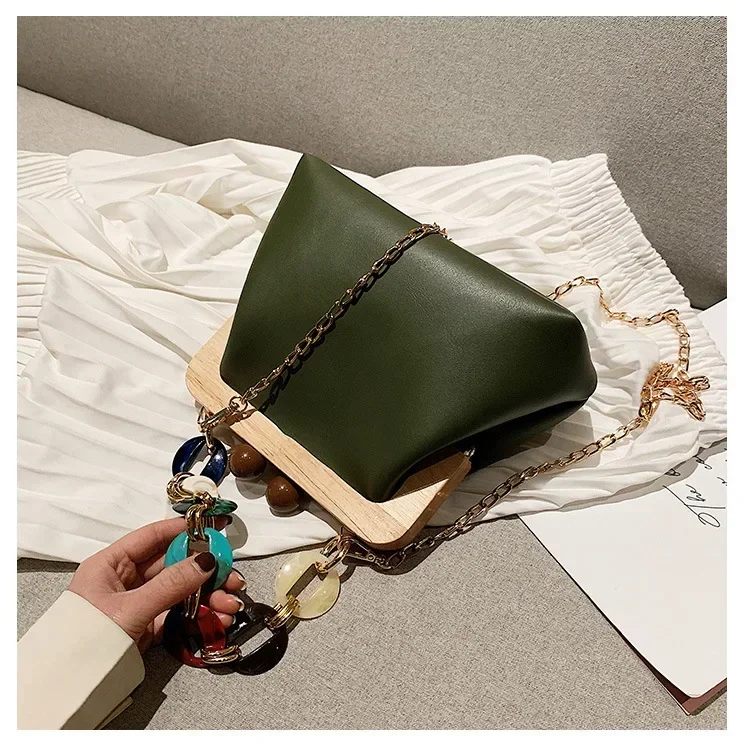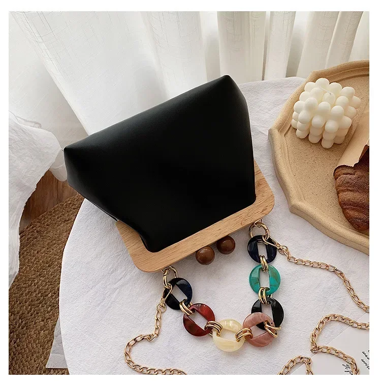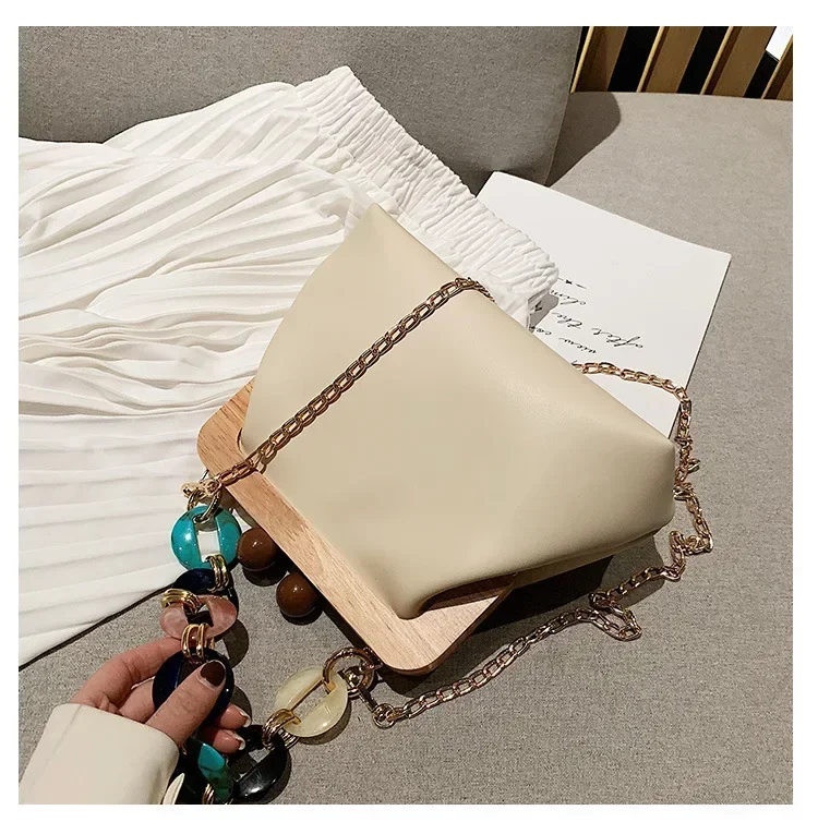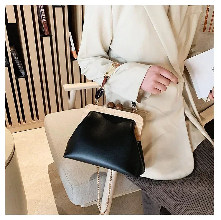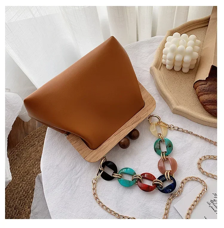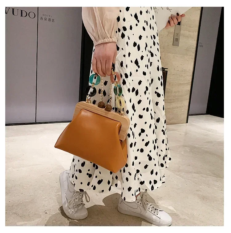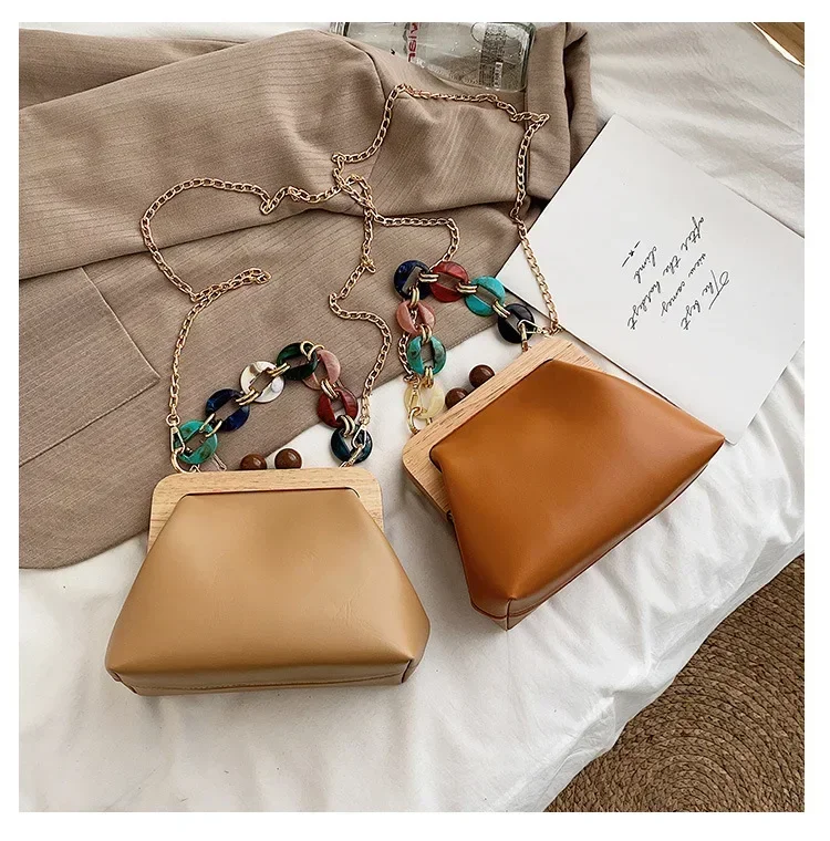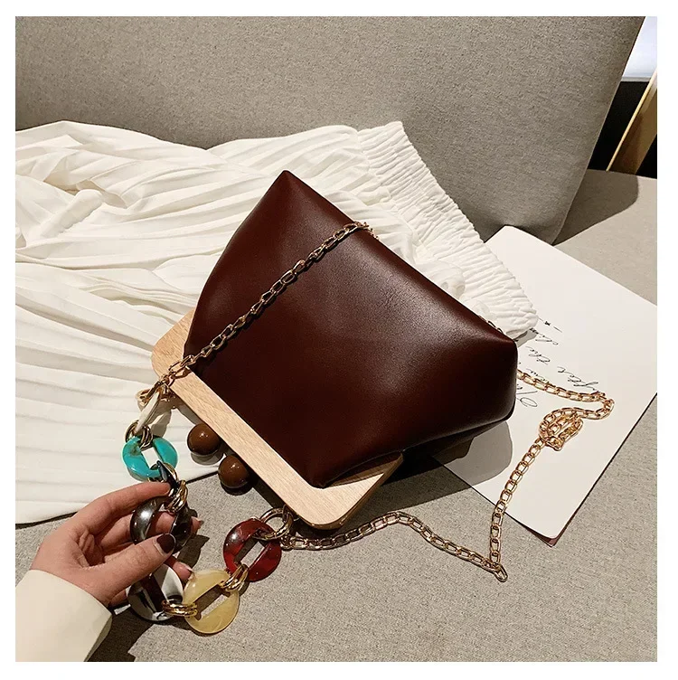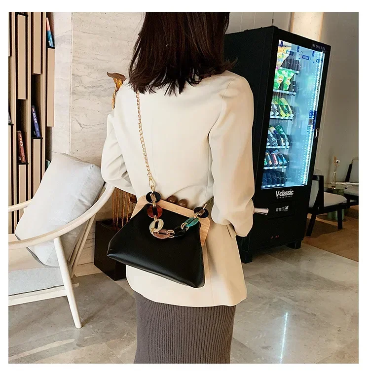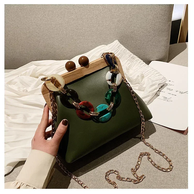 Fashion Wood Clip Buckle Shoulder Bag Woman Acrylic Chain Simple Design Trendy Casual Messenger Bag Luxury PU New In Handbag