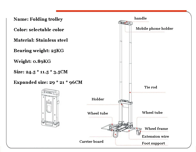 Full folding trolley stainless steel luggage car go to school Trolley bag travel carry suitcase shopping carts Phone holder