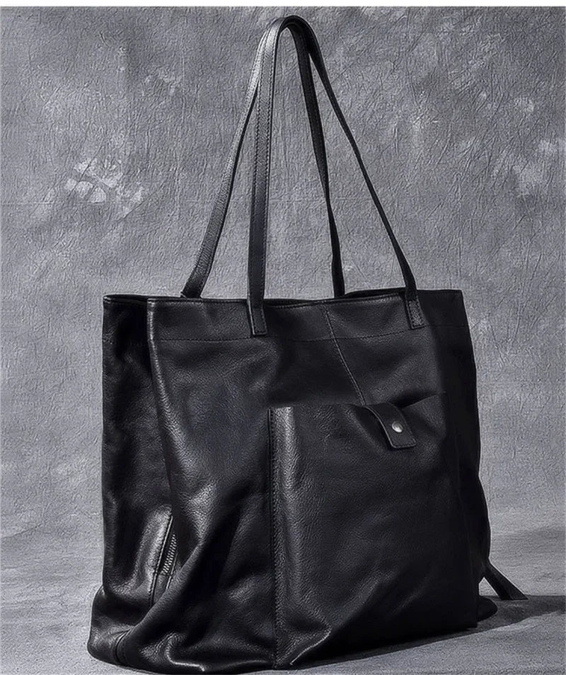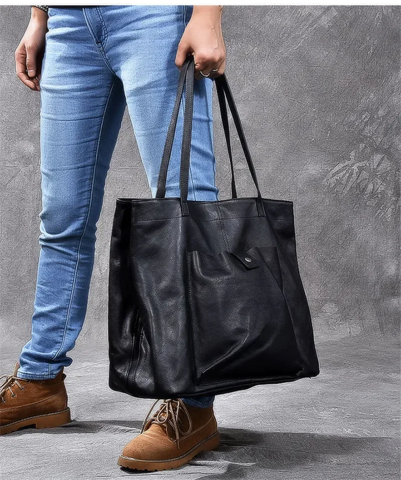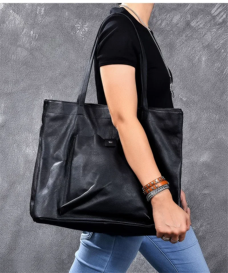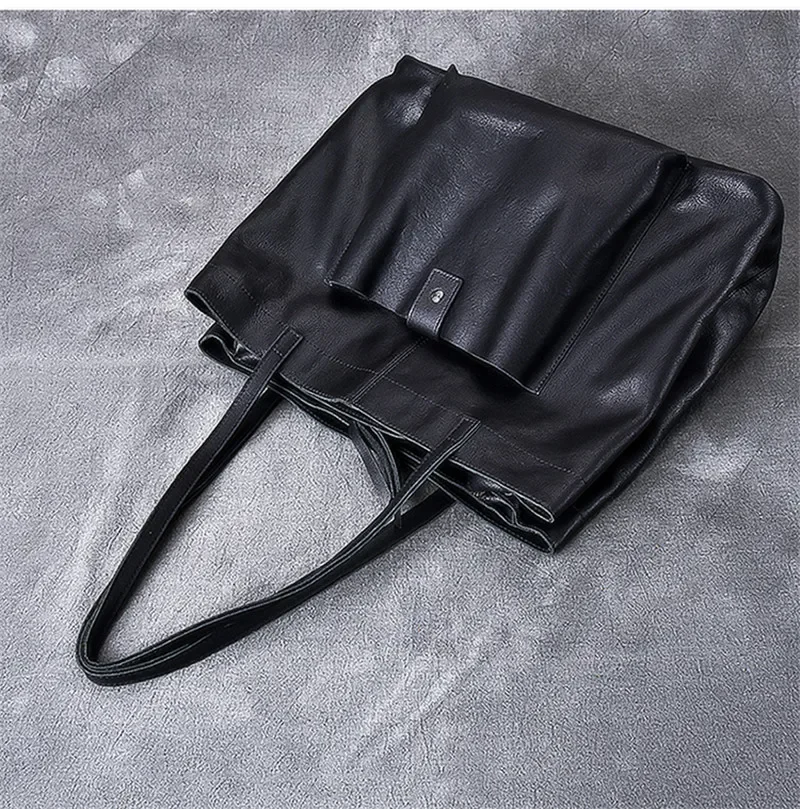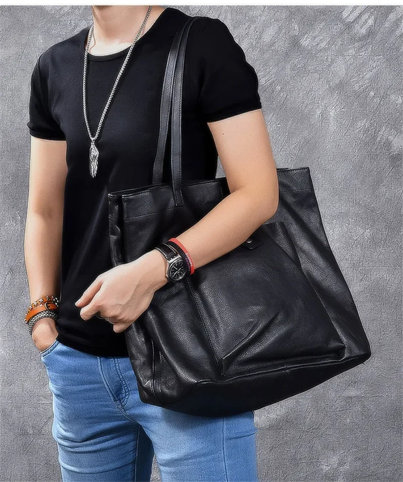 Genuine leather large capacity black tote bag luxury men's handbag casual real cowhide women's work travel shopping shoulder bag