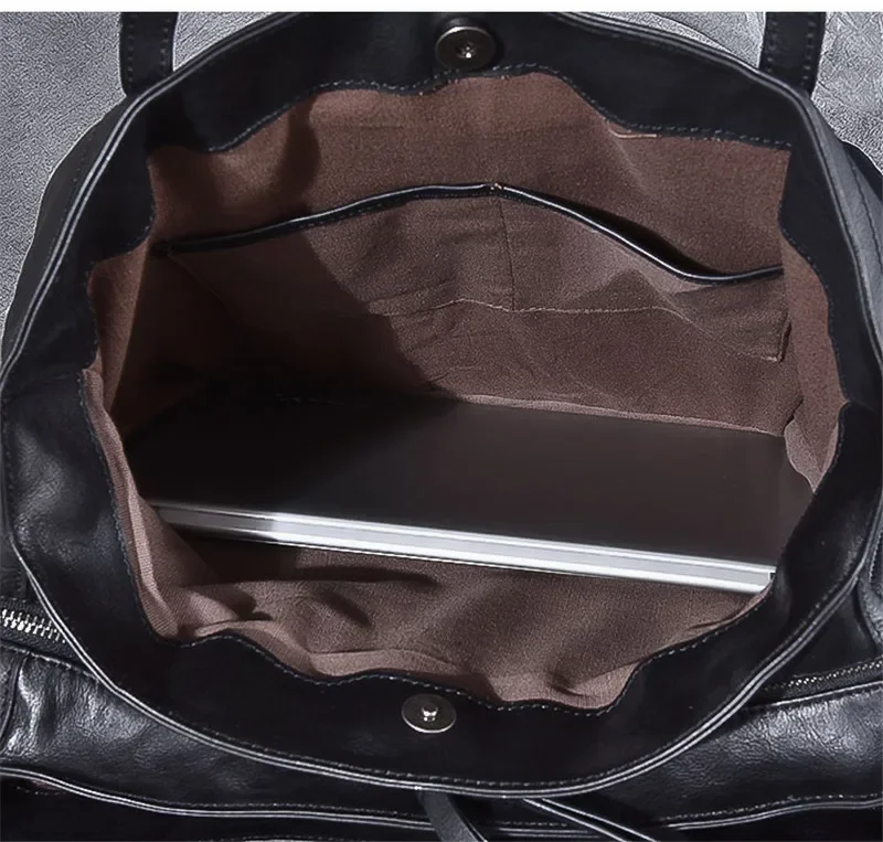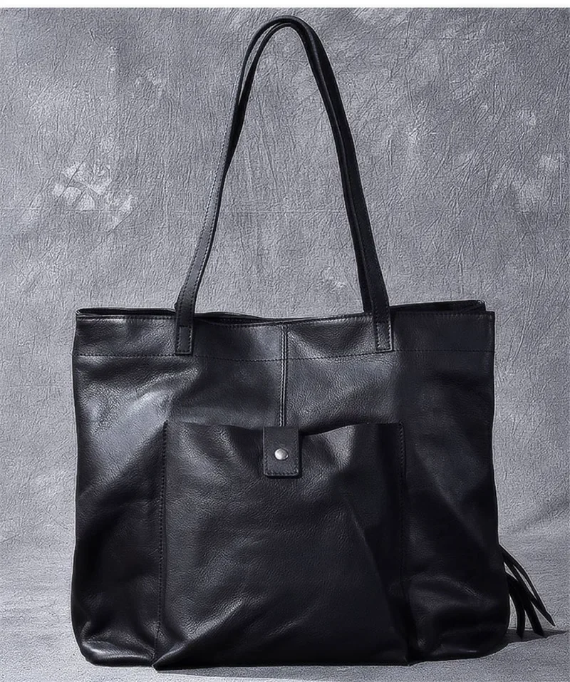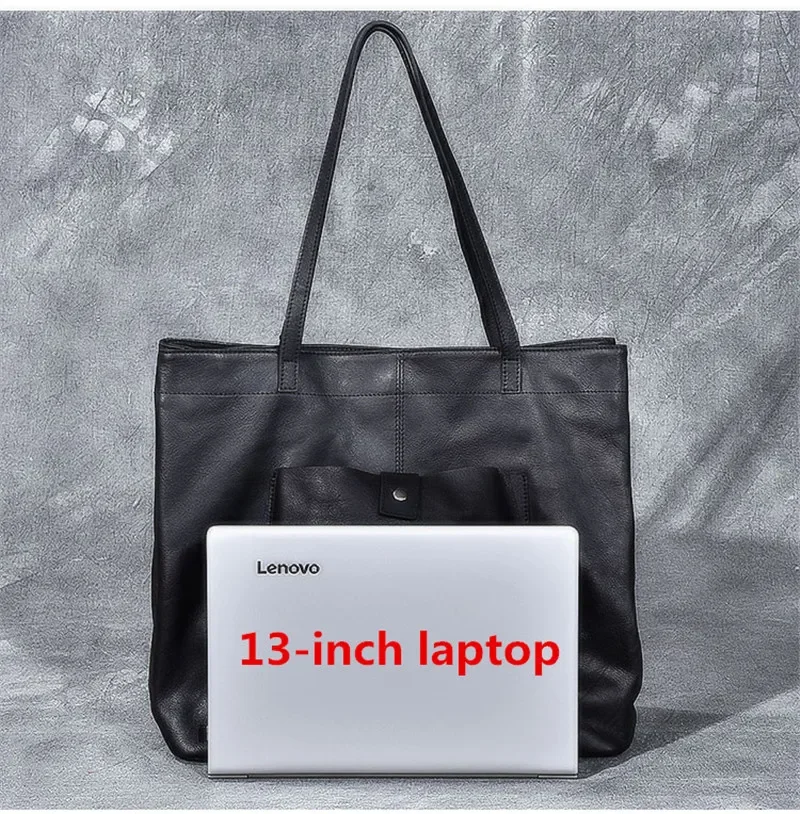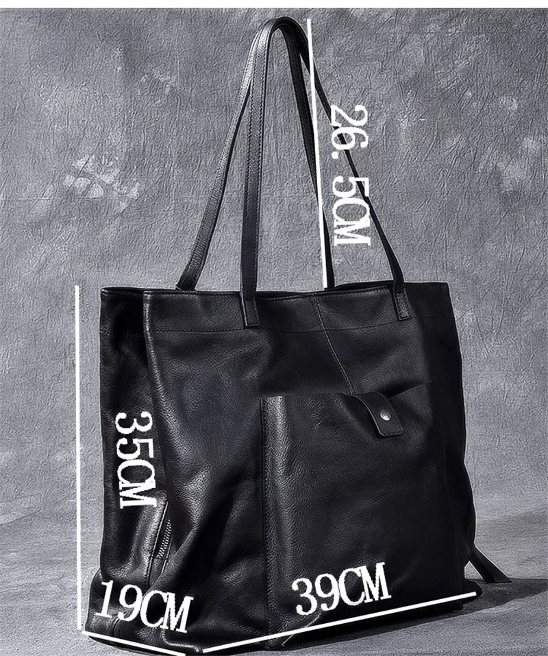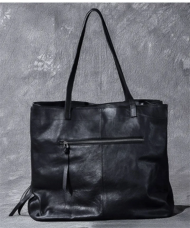 Genuine leather large capacity black tote bag luxury men's handbag casual real cowhide women's work travel shopping shoulder bag