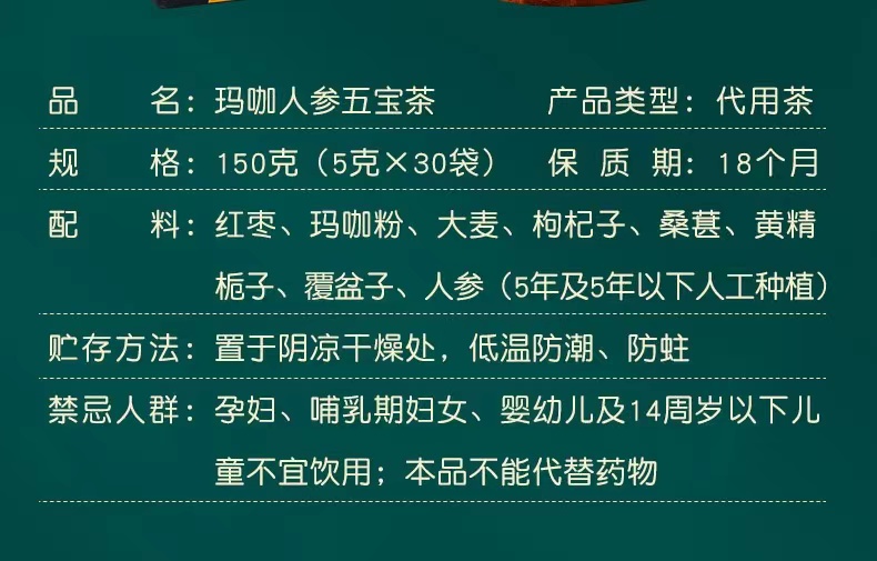 Ginseng Five Treasure Tea 同仁堂人参五宝茶150g(5g*30) 桑葚黄精红枣玛咖粉 男人茶老公茶 熬夜养生茶 代用茶 HOT