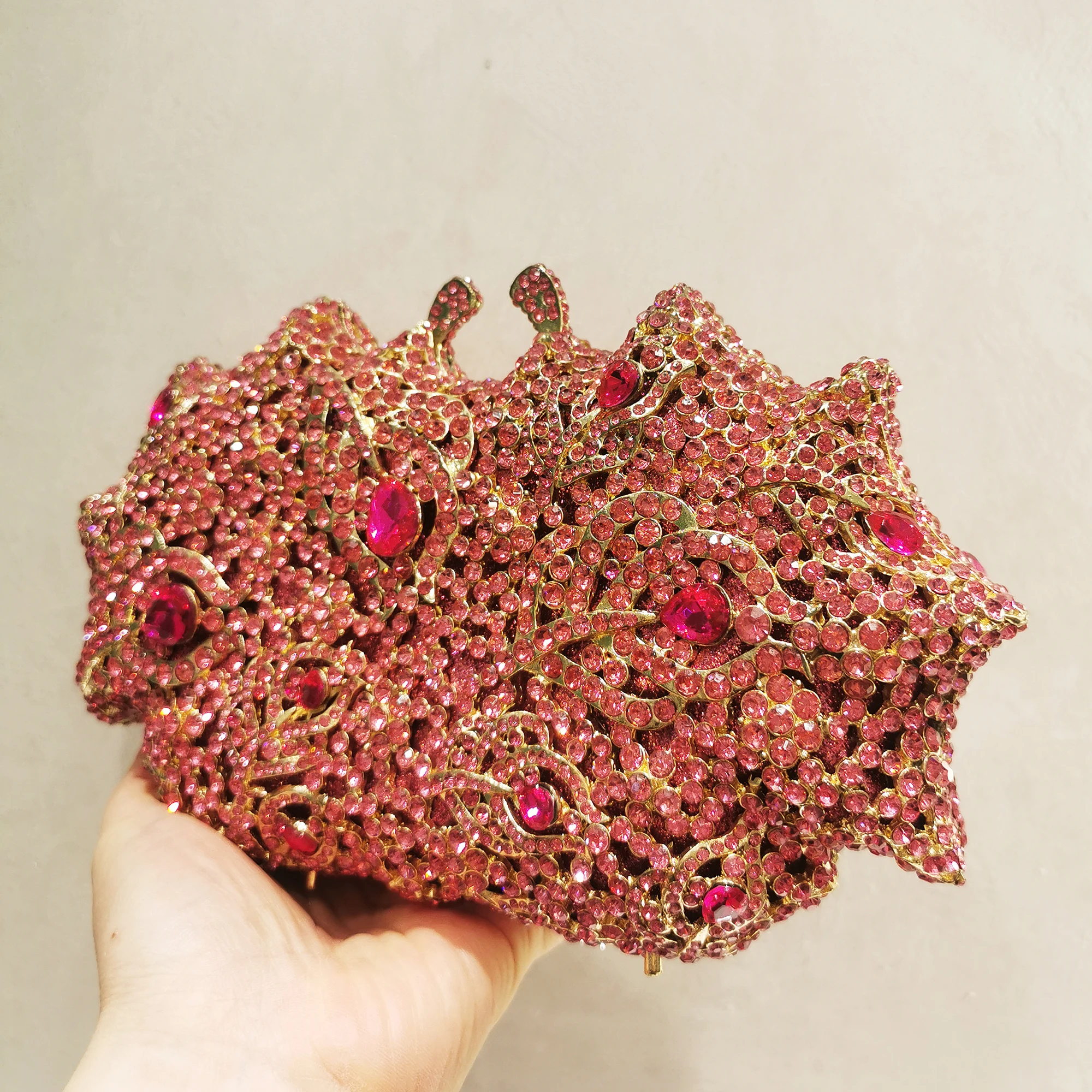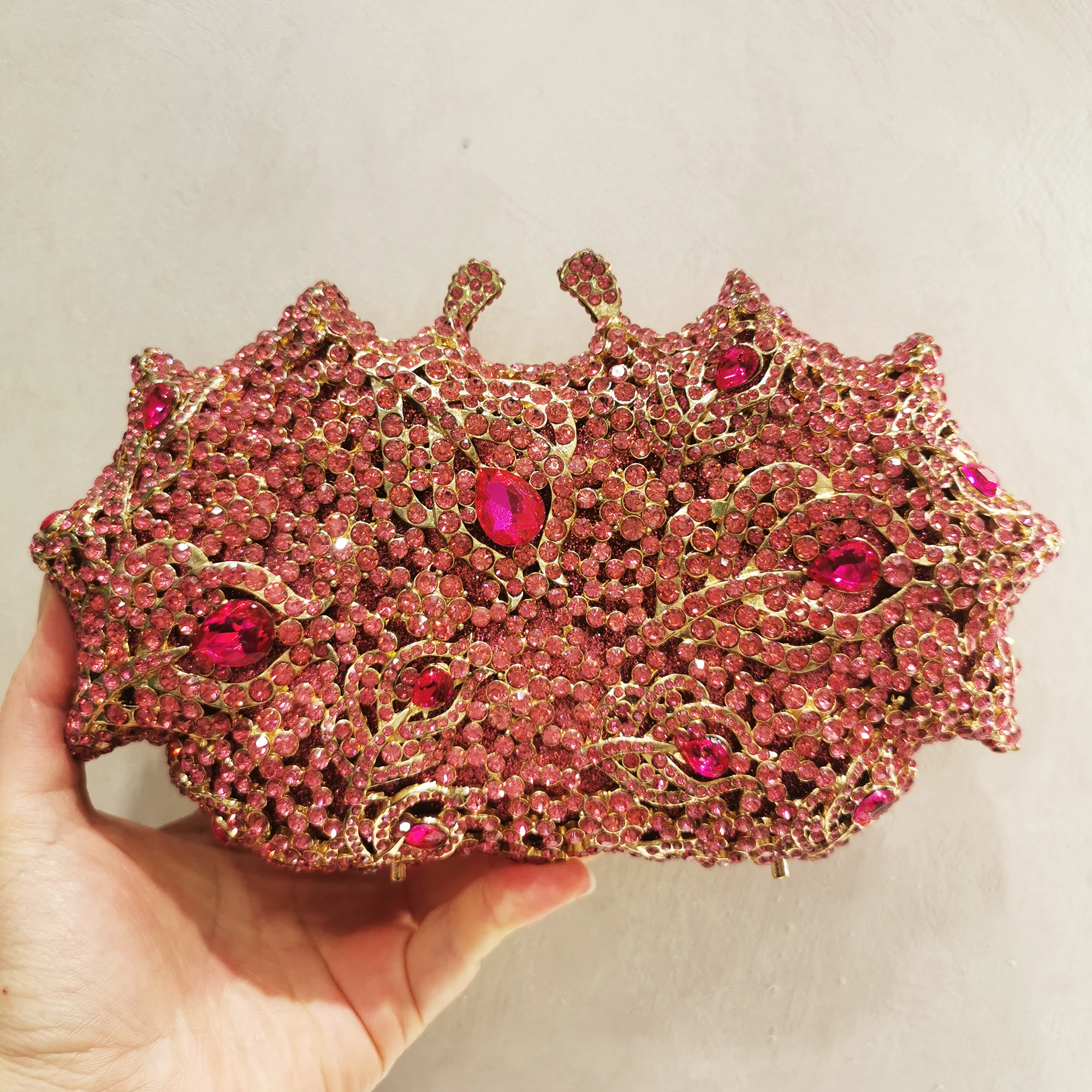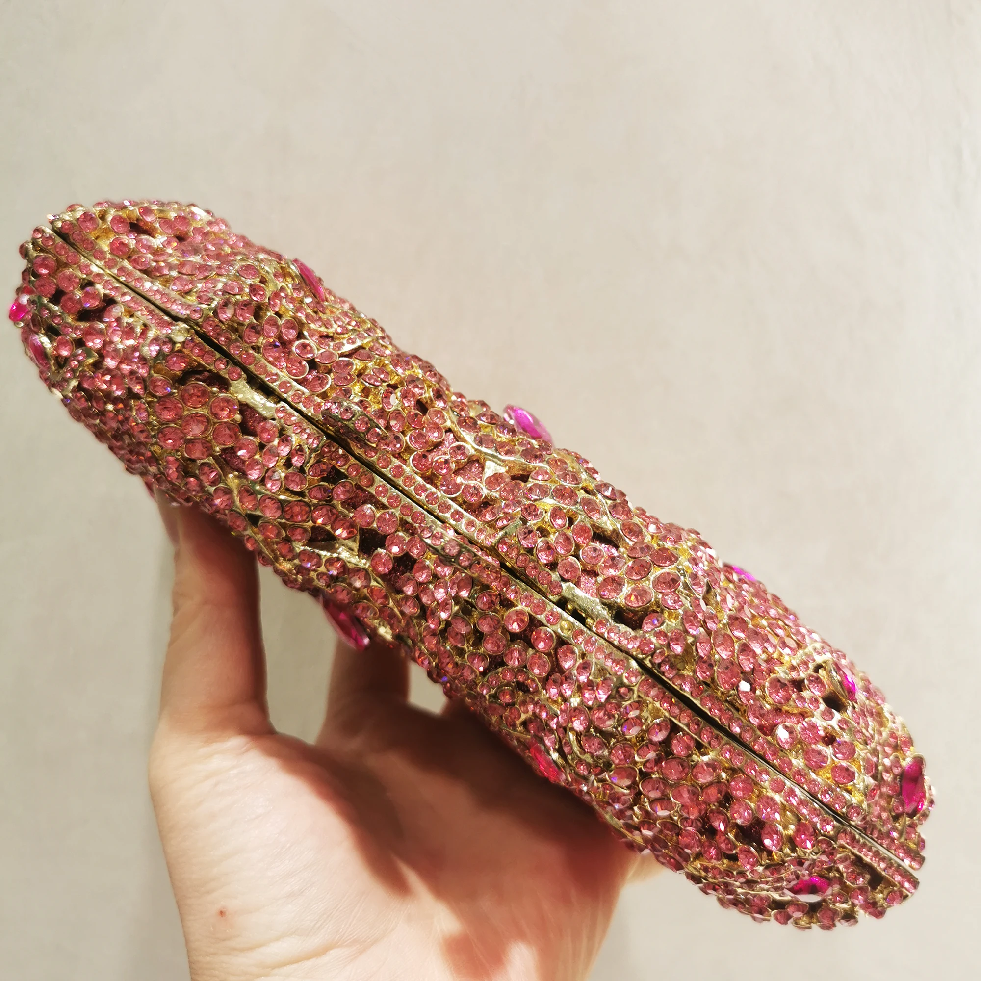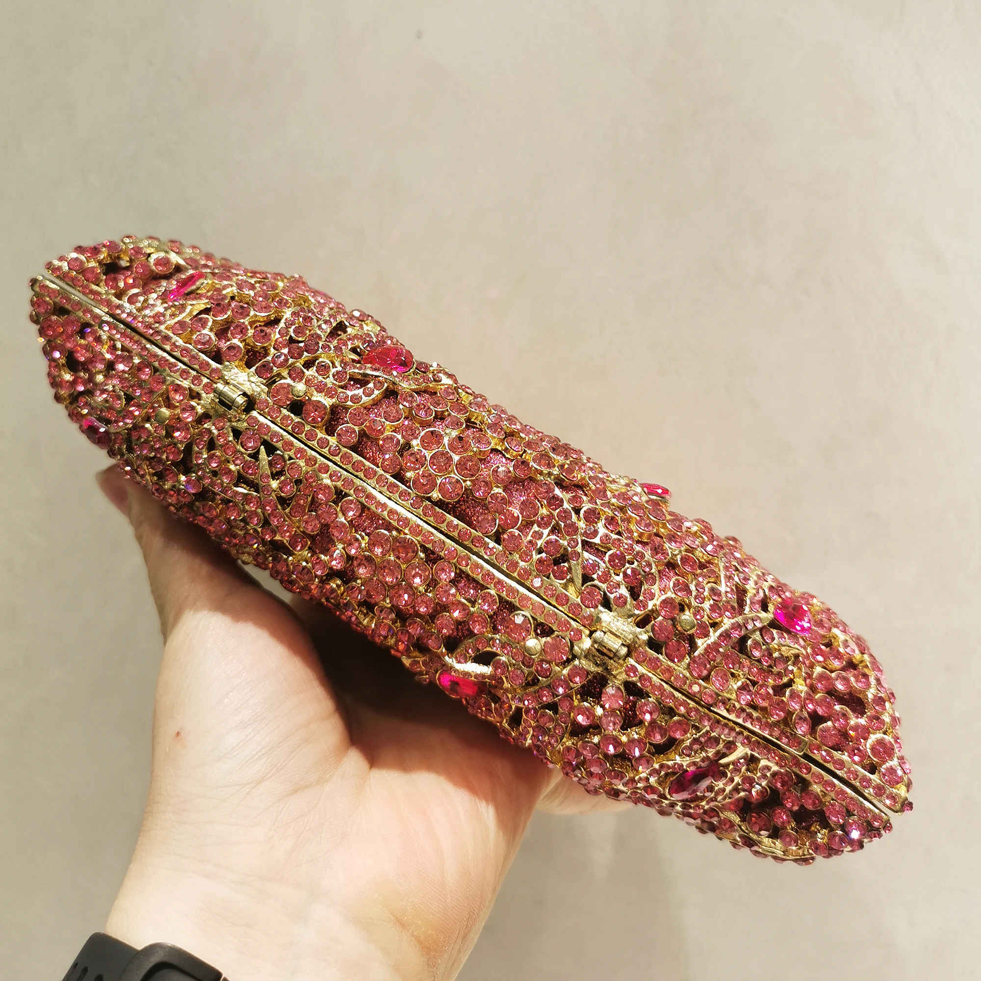 Gold Pink Champagne Floral Stone Clutch Woman Diamond Evening Purse Bridal Dinner Party Crystal Purse Wedding Flower Handbag