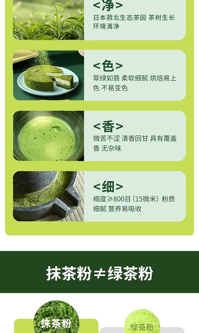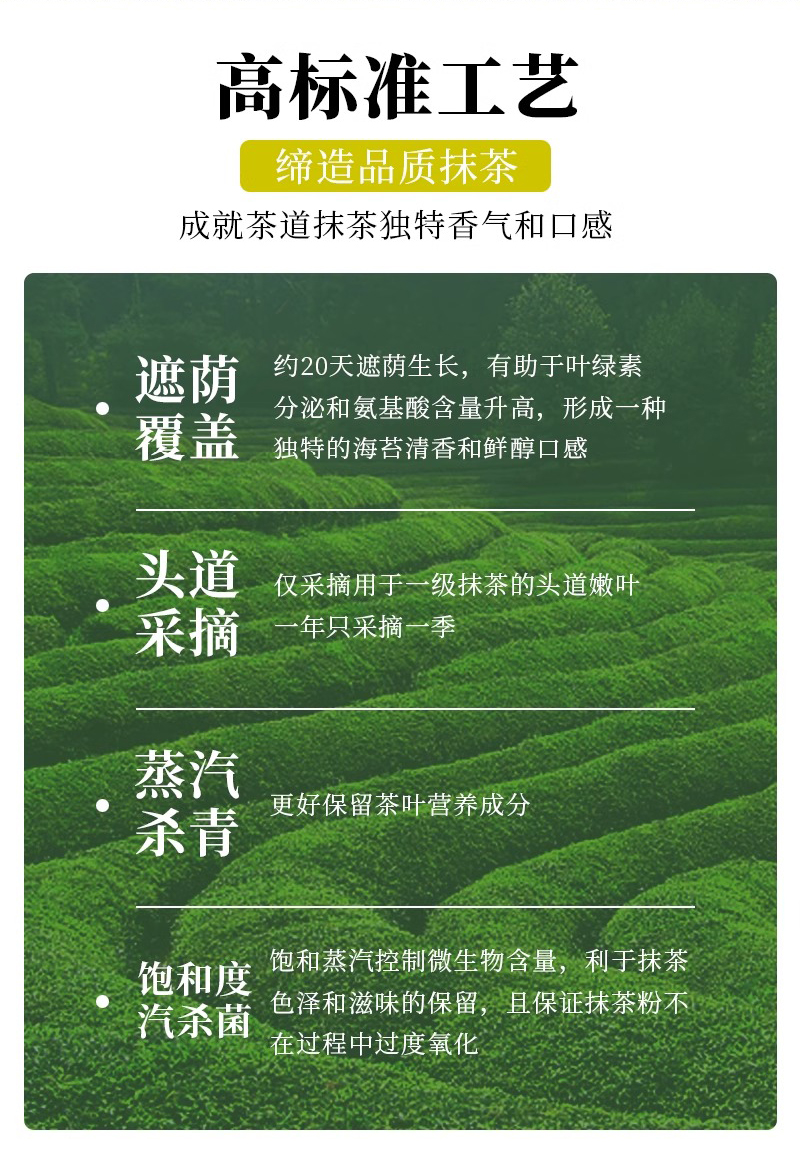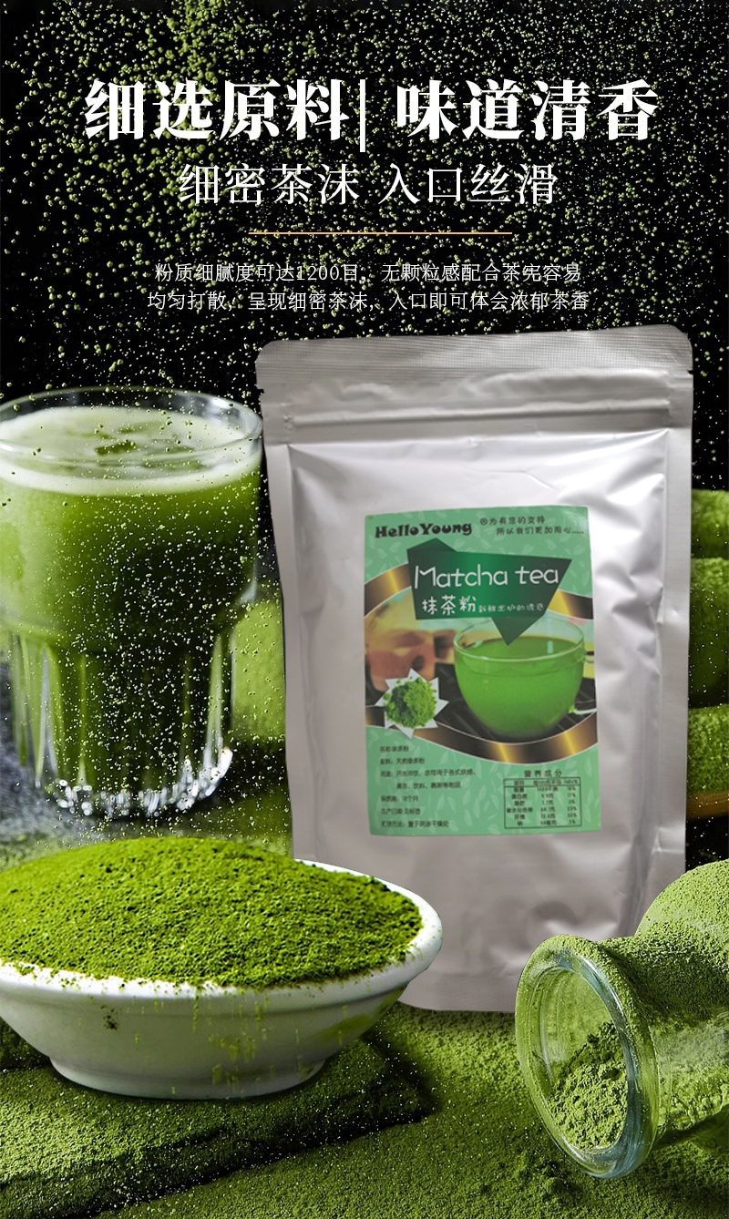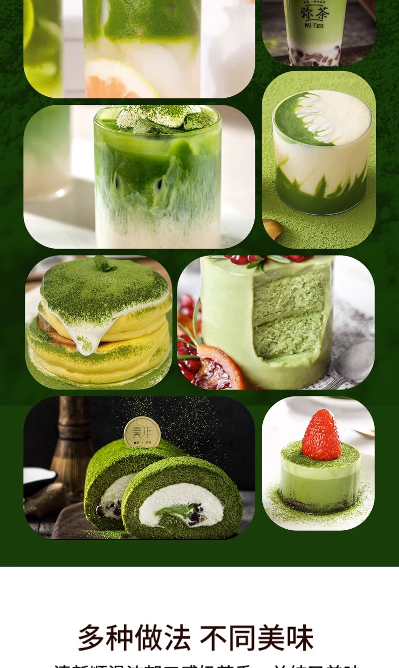 Matcha is suitable for the application of tea beverage (e.g. iced tea, pure tea, fruit tea,milk tea) as basic raw material or as food additive for cake,candy and chocolate etc.