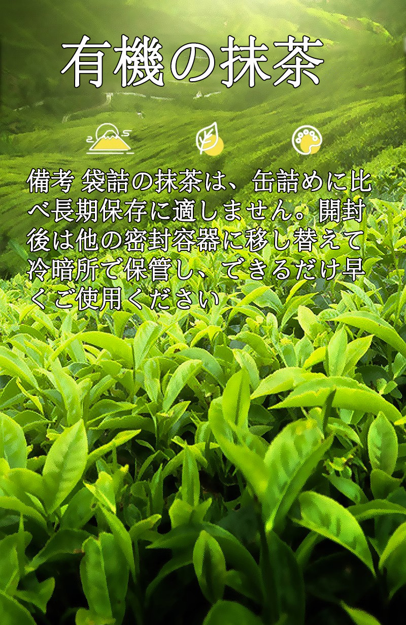 備考 袋詰の抹茶は、缶詰めに比べ長期保存に適しません。開封後は他の密封容器に移し替えて冷暗所で保管し、できるだけ早くご使用ください。