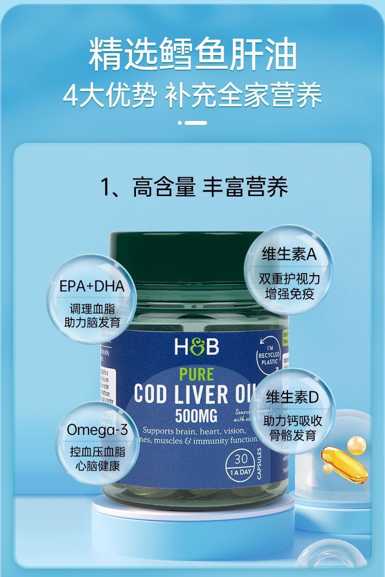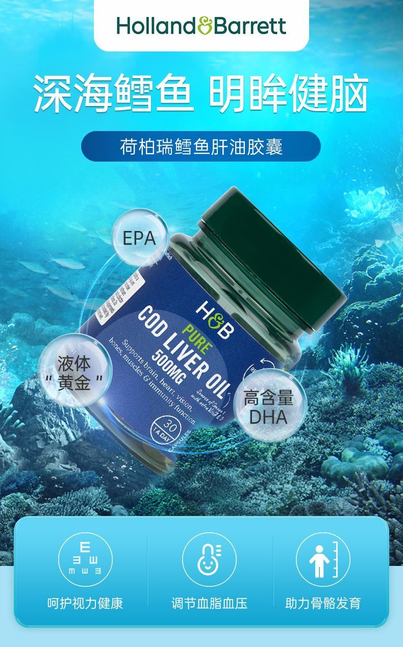 HB Holland&Barrett Cod Liver Oil DHA Capsules Fish Liver Oil 500mg*30 Capsules