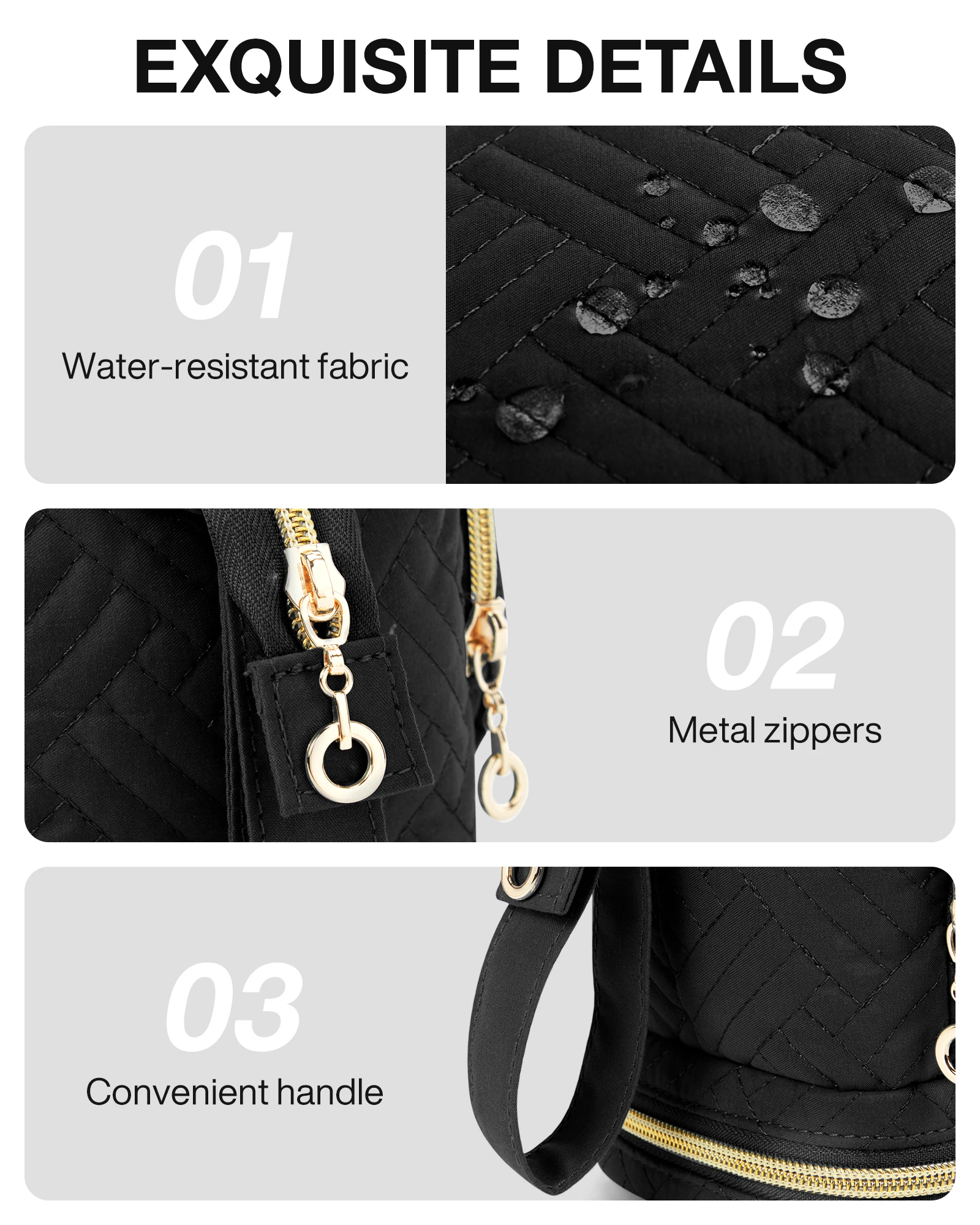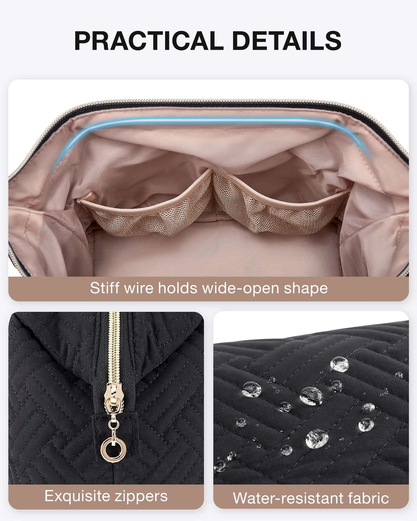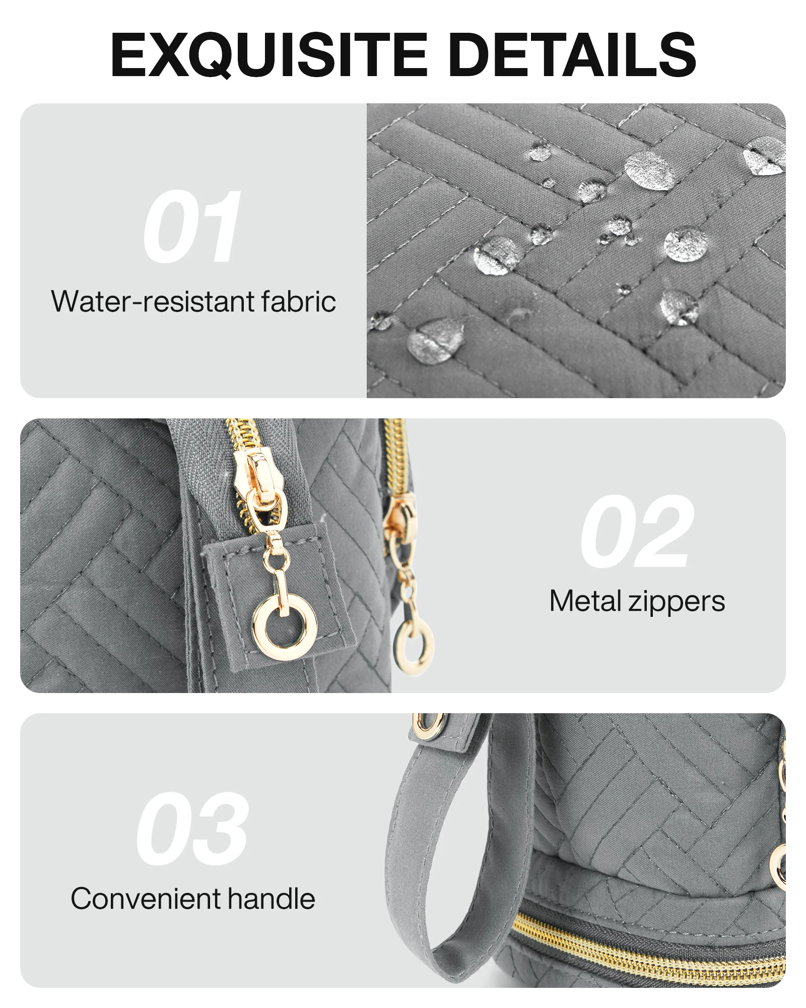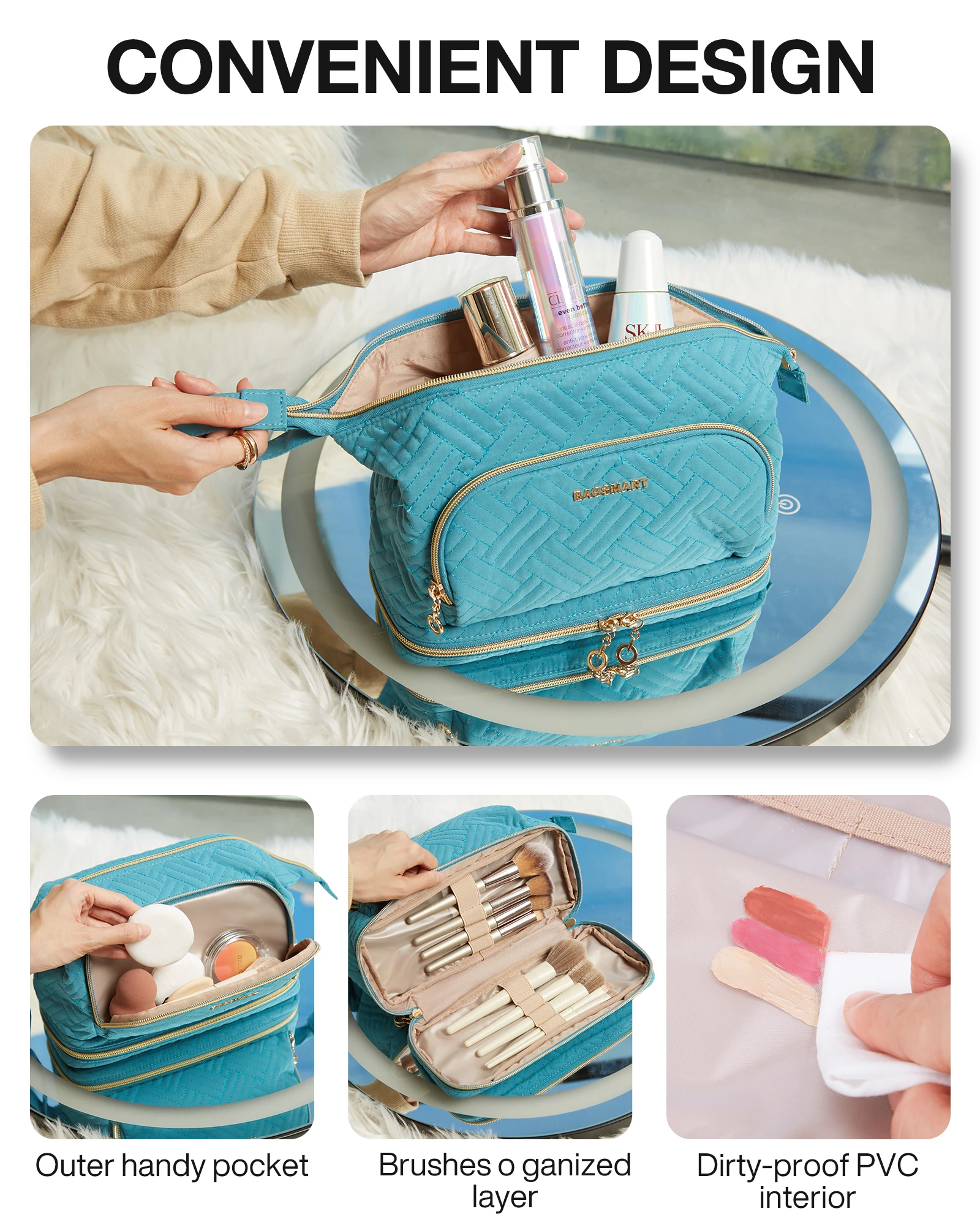 • 【 HIGH QUALITY 】- Cosmetic bag is Made of water-resistant polyester, soft and durable. Well-padded design of makeup bag organizer provides great protection performance. Metal zippers makes makeup pouch exquisite.