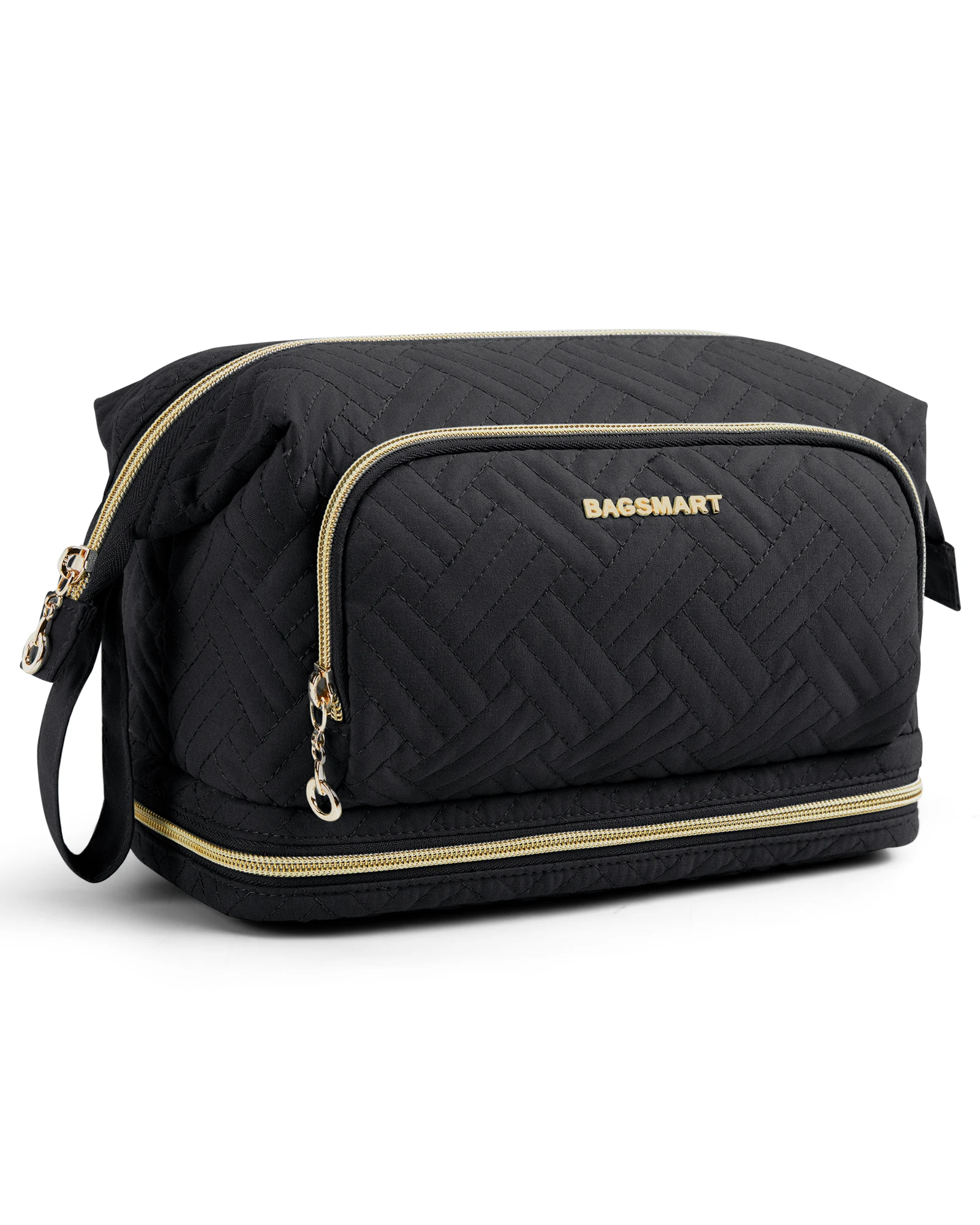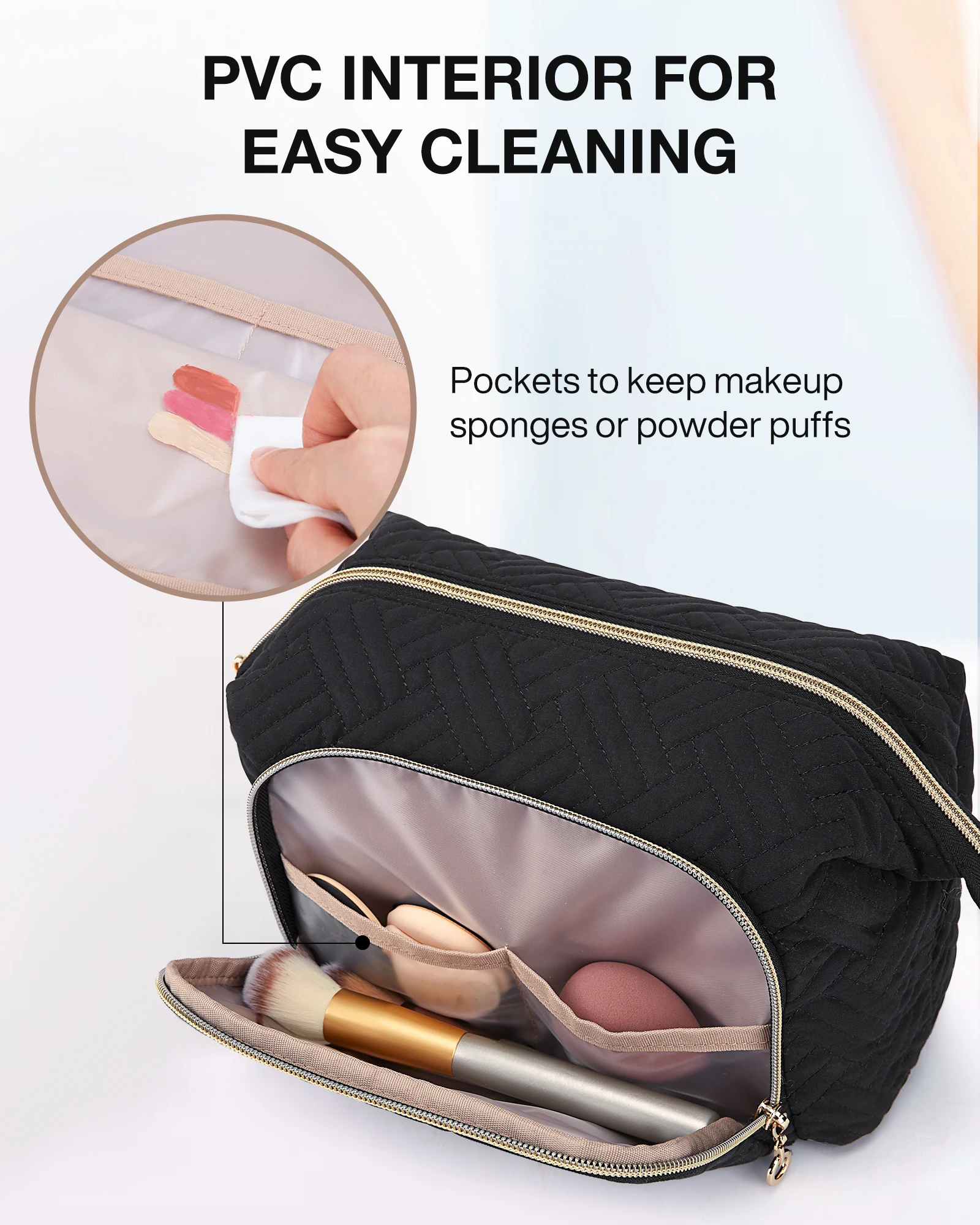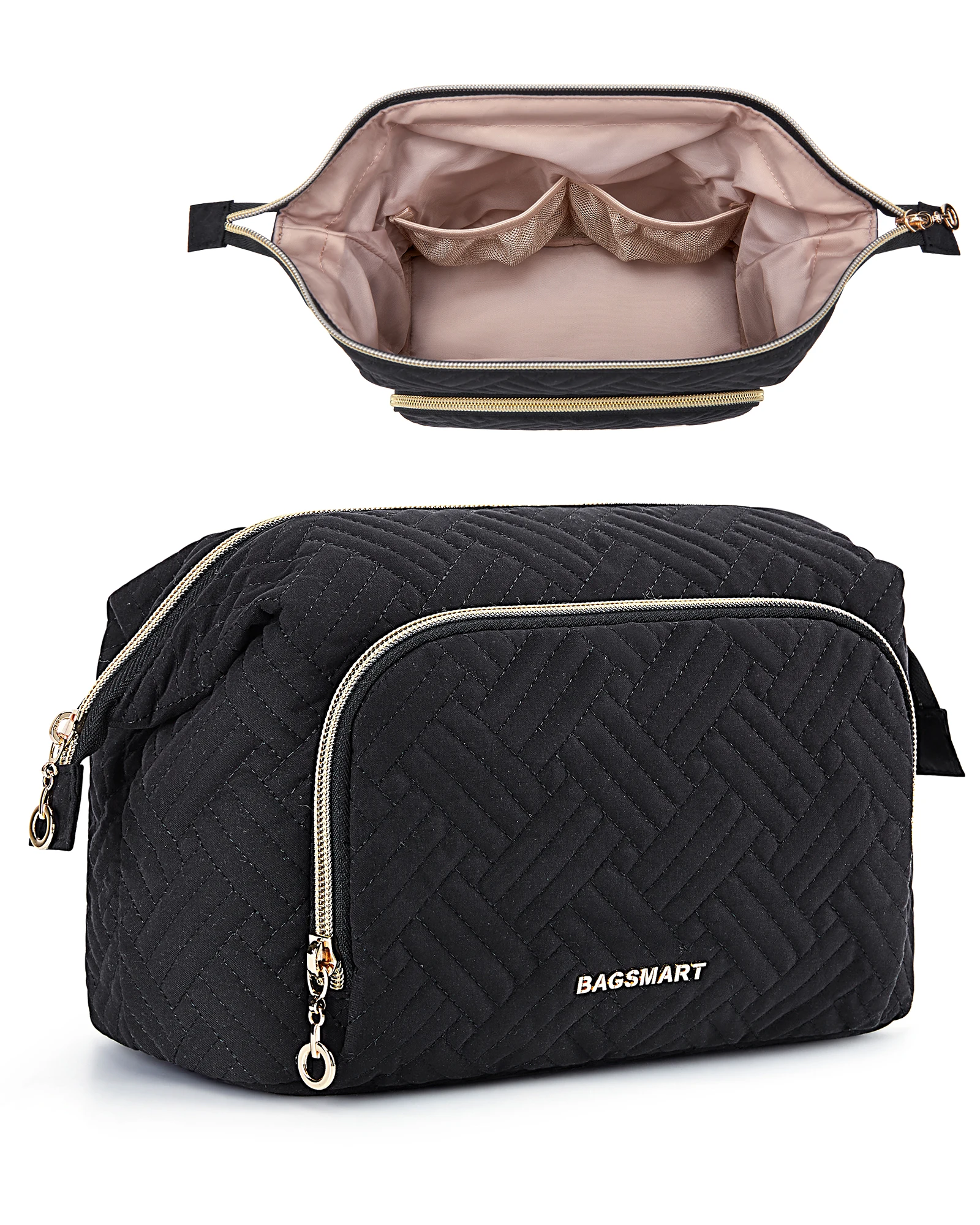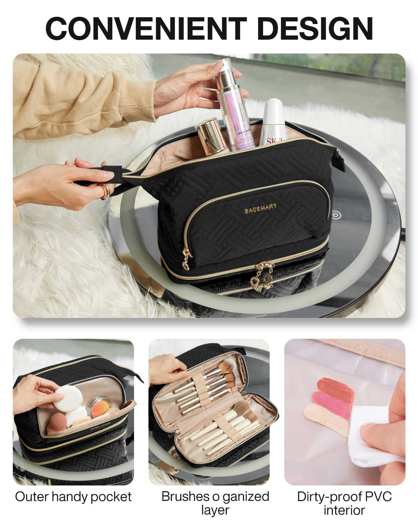 • 【 HIGH QUALITY 】- Cosmetic bag is Made of water-resistant polyester, soft and durable. Well-padded design of makeup bag organizer provides great protection performance. Metal zippers makes makeup pouch exquisite.
