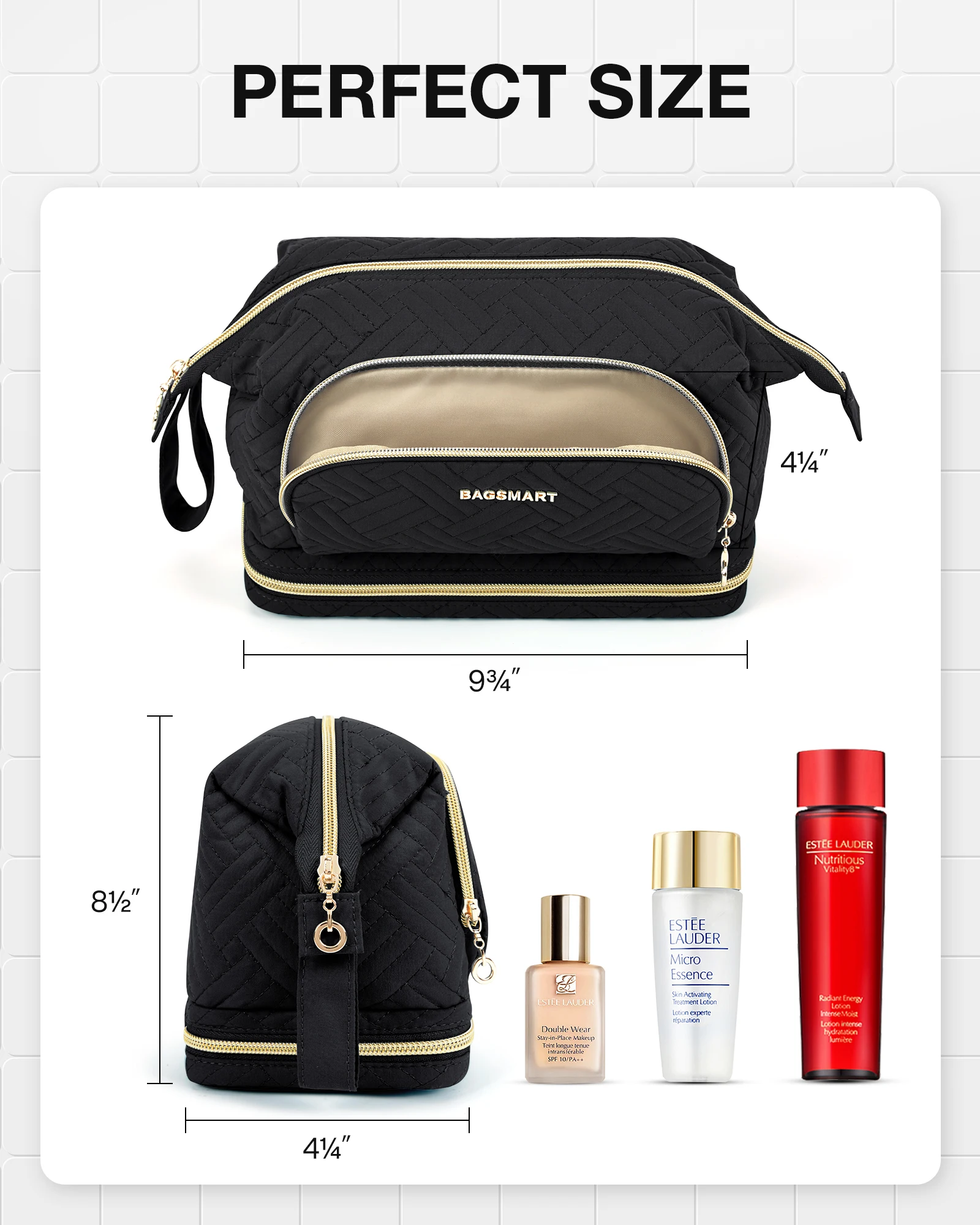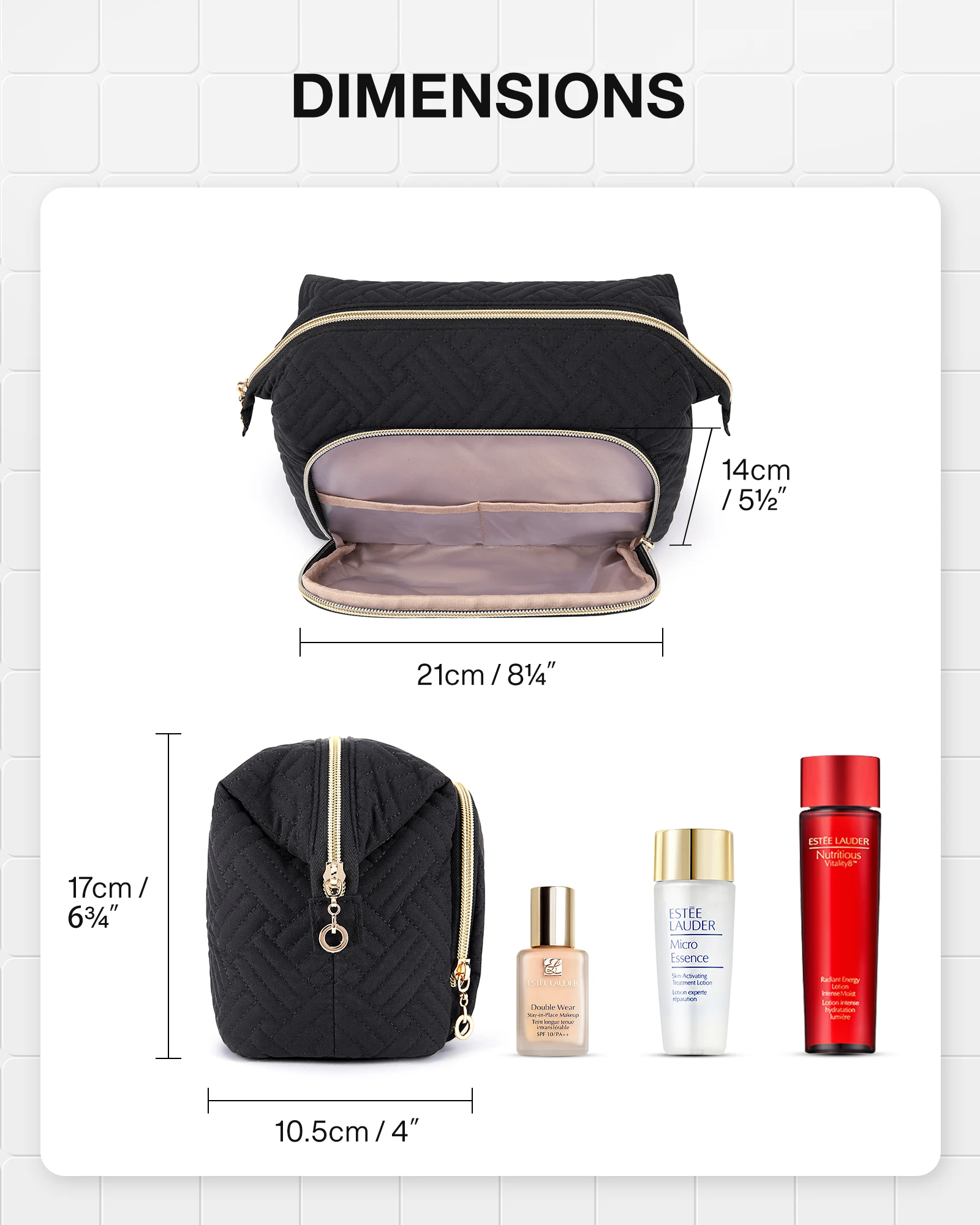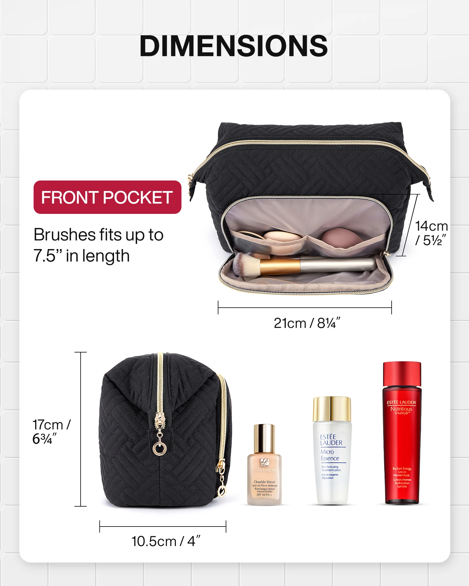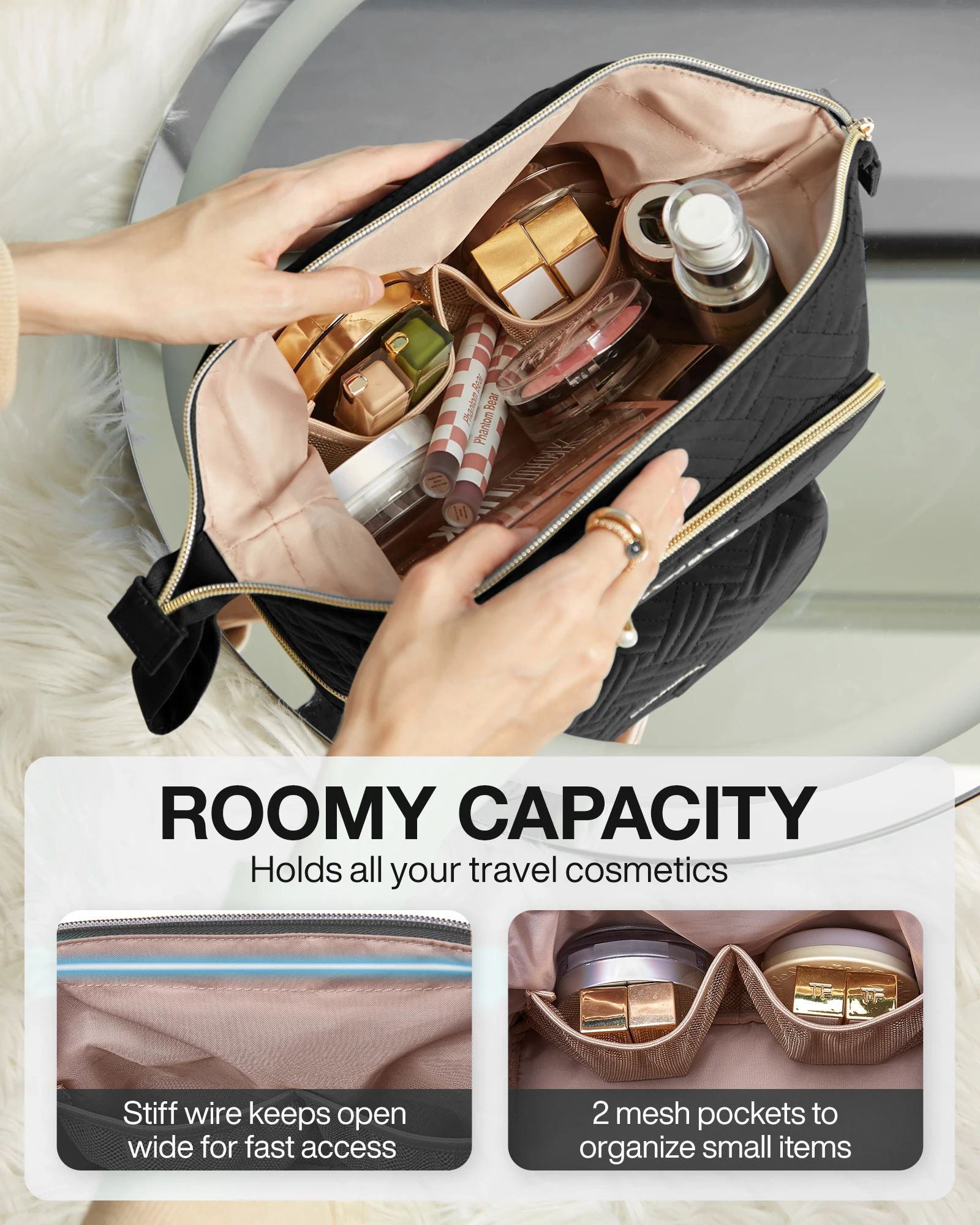 • 【 ROOMY CAPACITY 】- 9.75 x 8.5 x 4.25 inch. makeup travel bag is large enough for your 5-7 days travelling or daily use. The spacious makeup organizer bag can hold your full-sized cosmetics, make up tools, toiletries, or travel essentials.