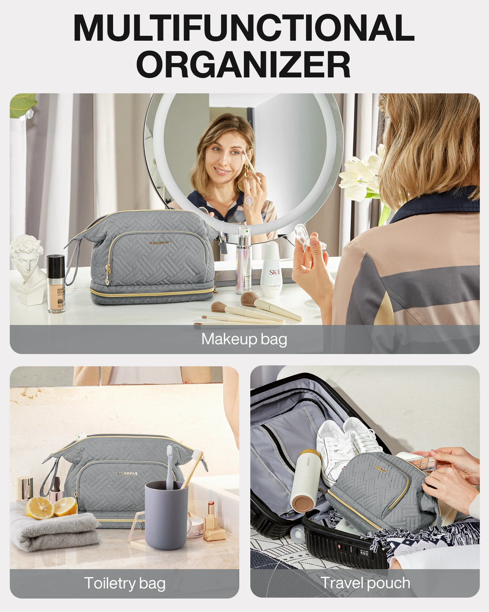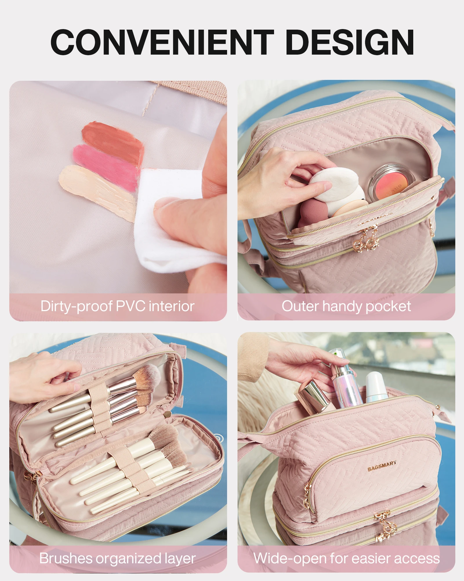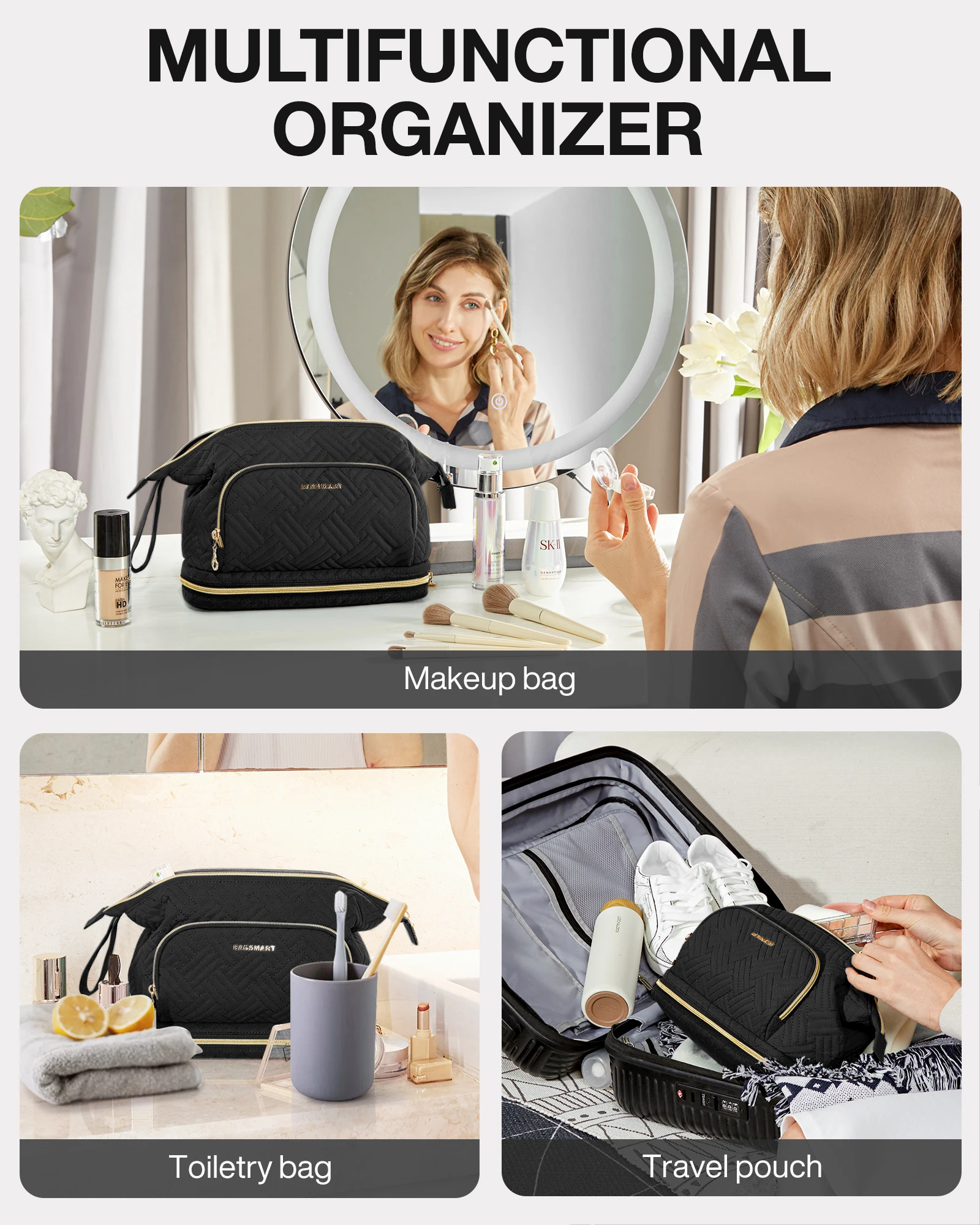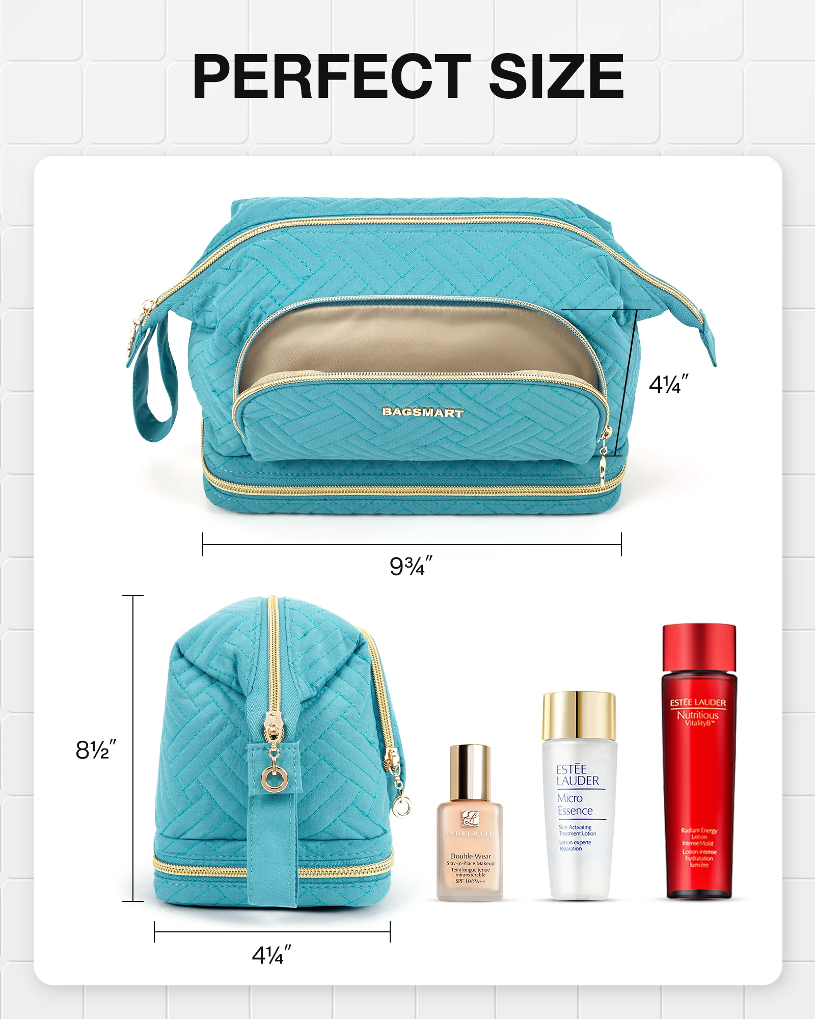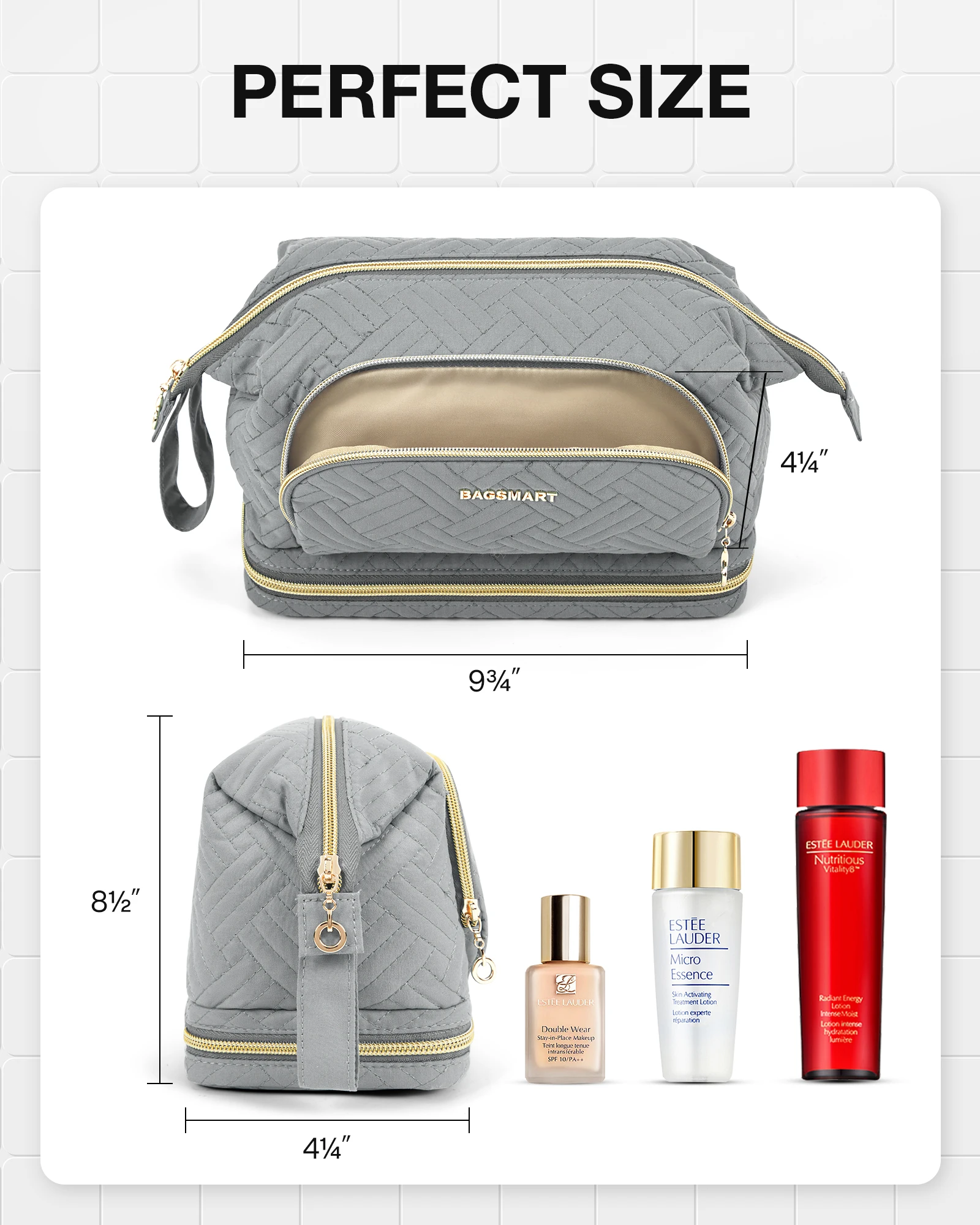 • 【 ROOMY CAPACITY 】- 9.75 x 8.5 x 4.25 inch. makeup travel bag is large enough for your 5-7 days travelling or daily use. The spacious makeup organizer bag can hold your full-sized cosmetics, make up tools, toiletries, or travel essentials.
