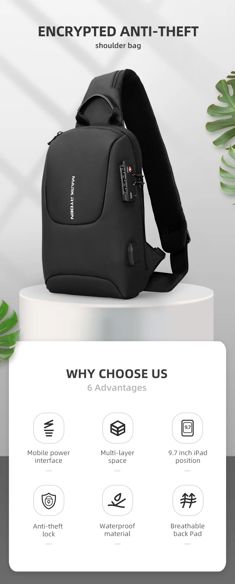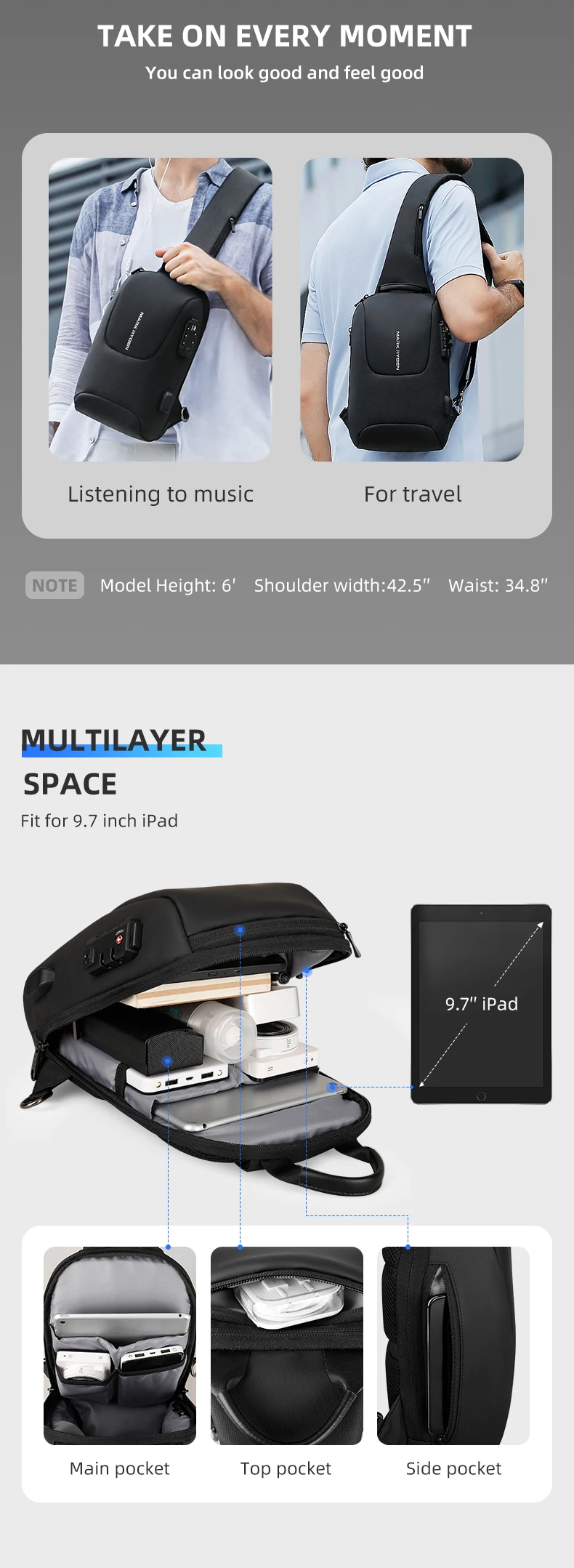 MARK RYDEN 9.7 Inch Ipad Men Shoulder Bag Black Anti-theft Water-repellent Male Crossbody Bag Short Trip Sling Bag USB Charging
