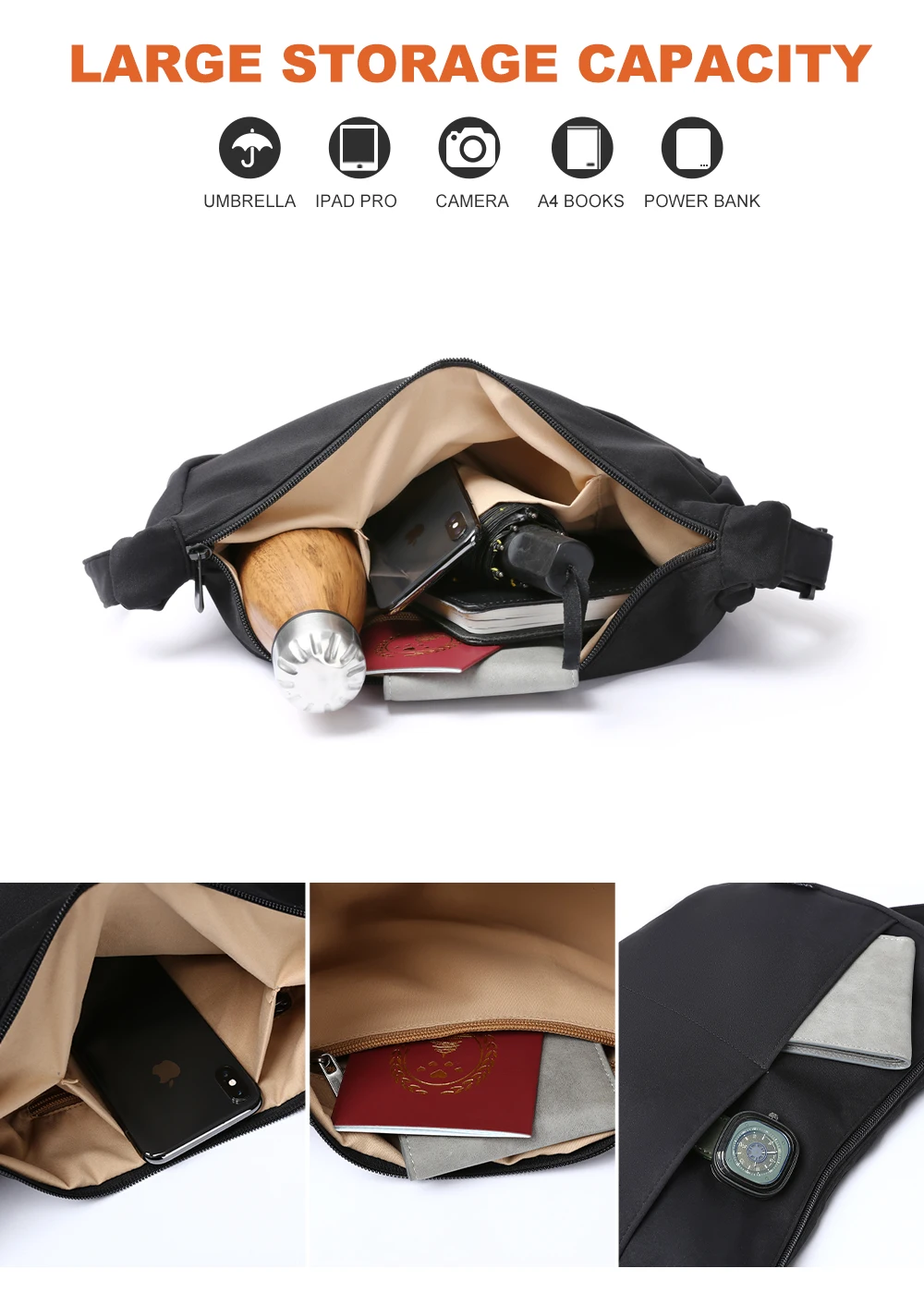 Capacity : wallet, cell phone, iPad, umbrella, Thermos cup,etc.