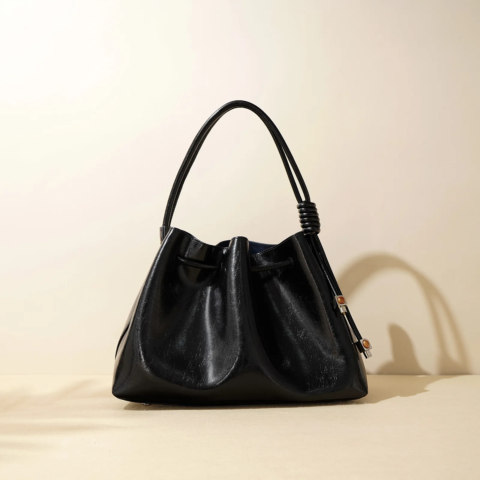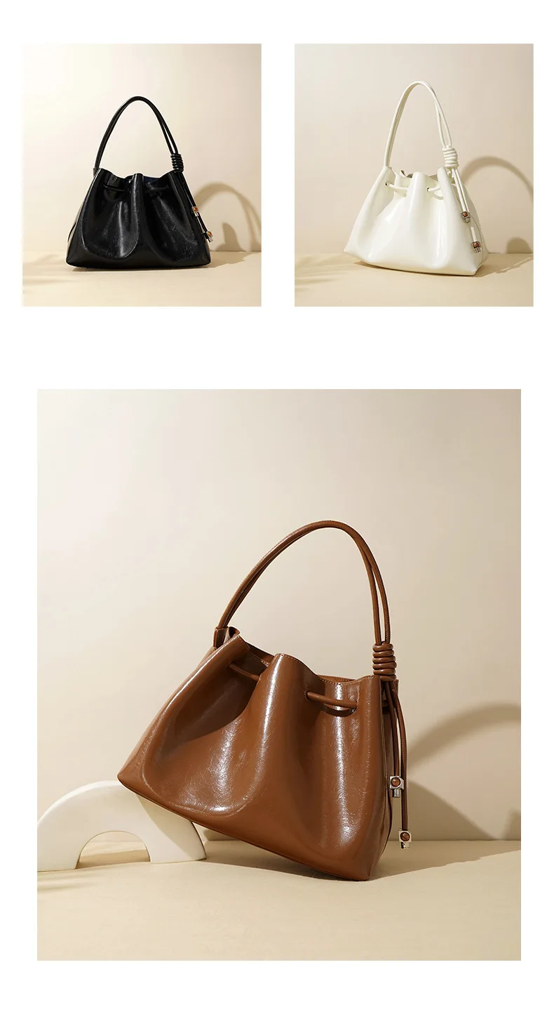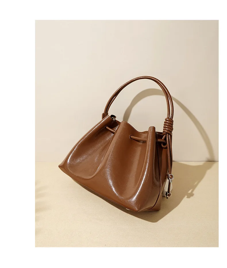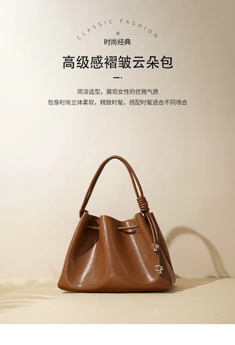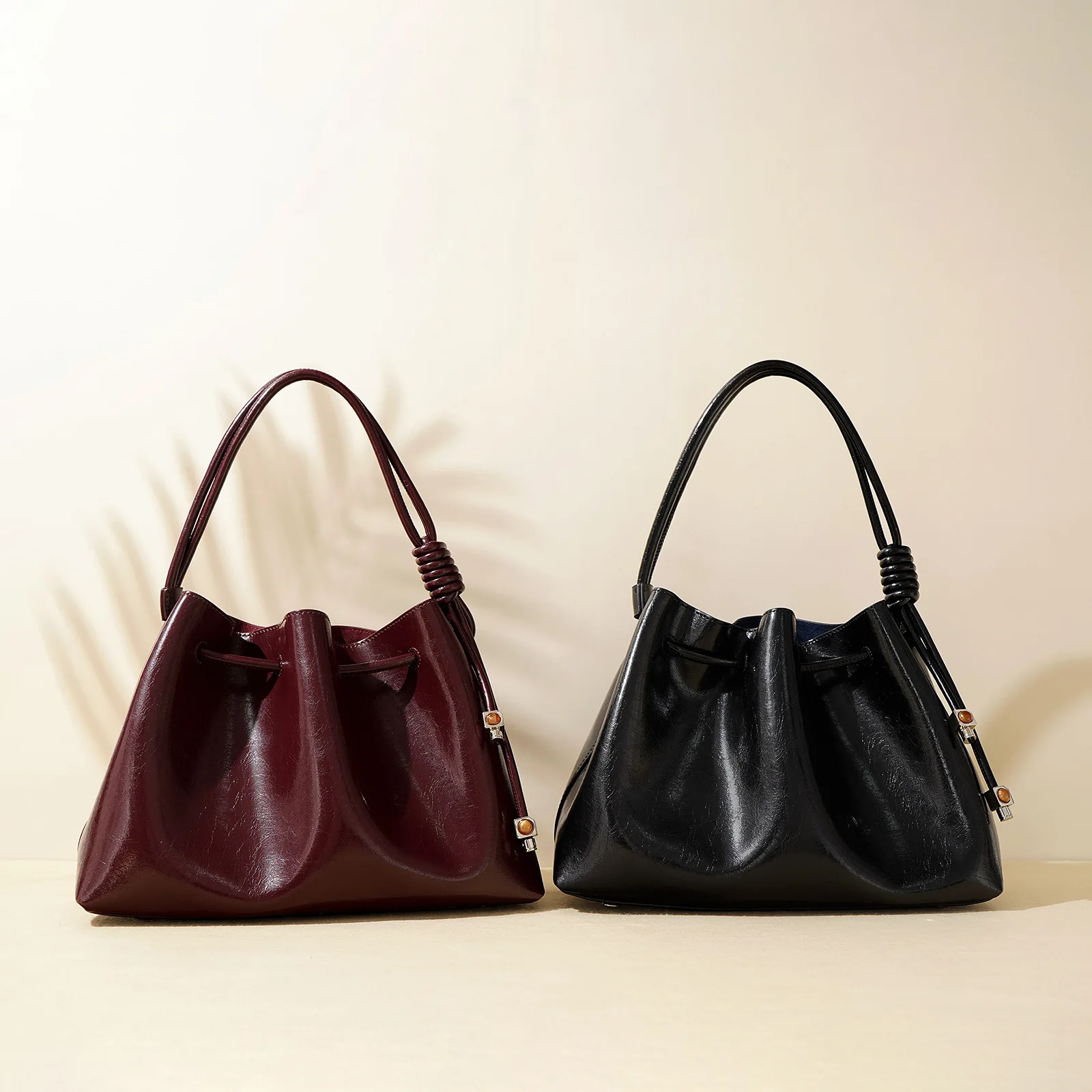 Motingsome 2024 New Leather Bags for Women Luxury Cowhide Leather Lady Bucket Chic Pleated Style Lady Daily Purse Handbag Pouch