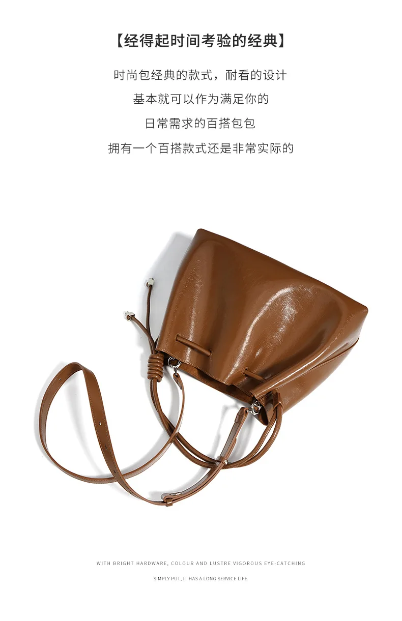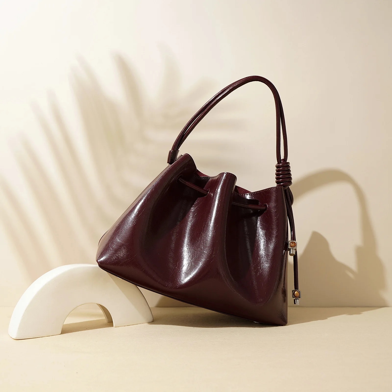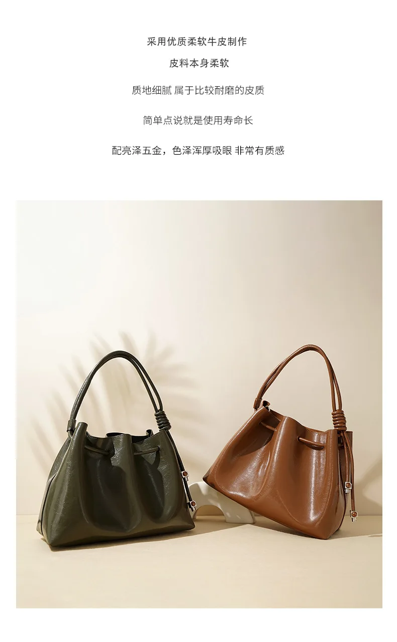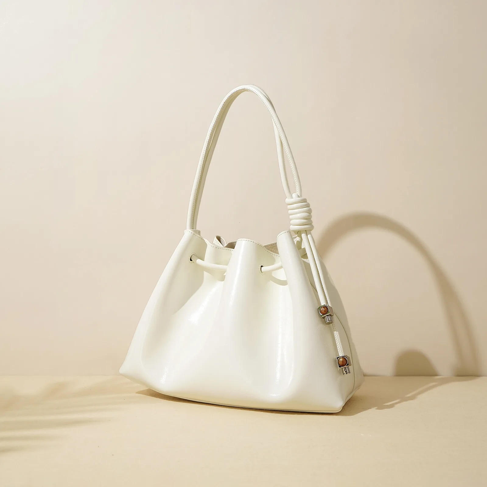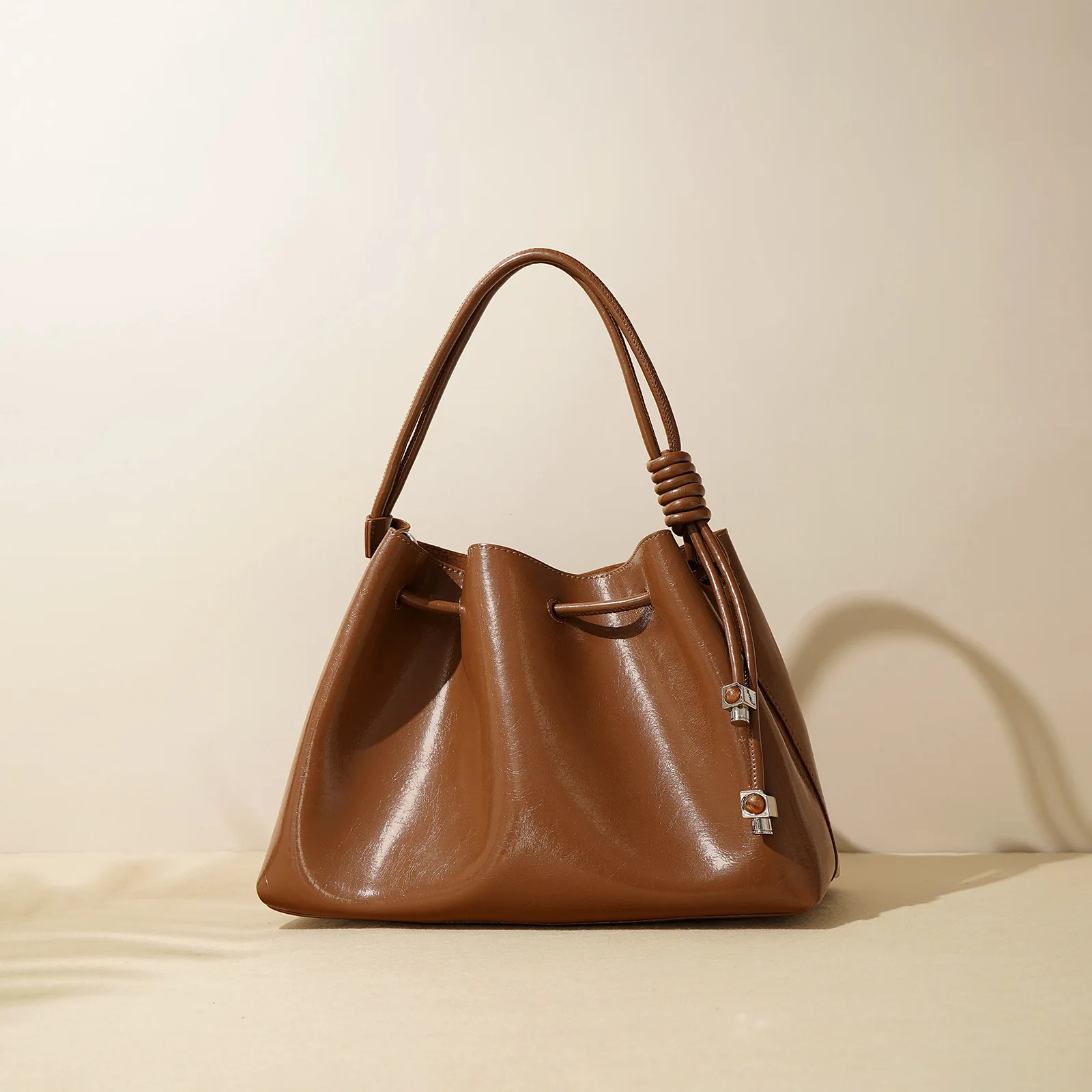 Motingsome 2024 New Leather Bags for Women Luxury Cowhide Leather Lady Bucket Chic Pleated Style Lady Daily Purse Handbag Pouch