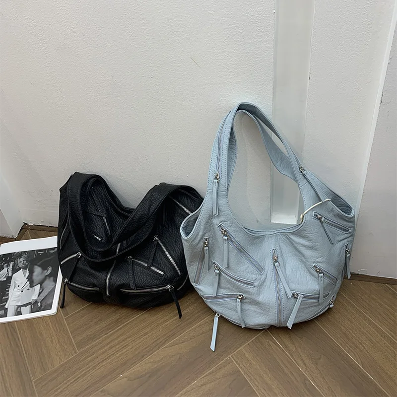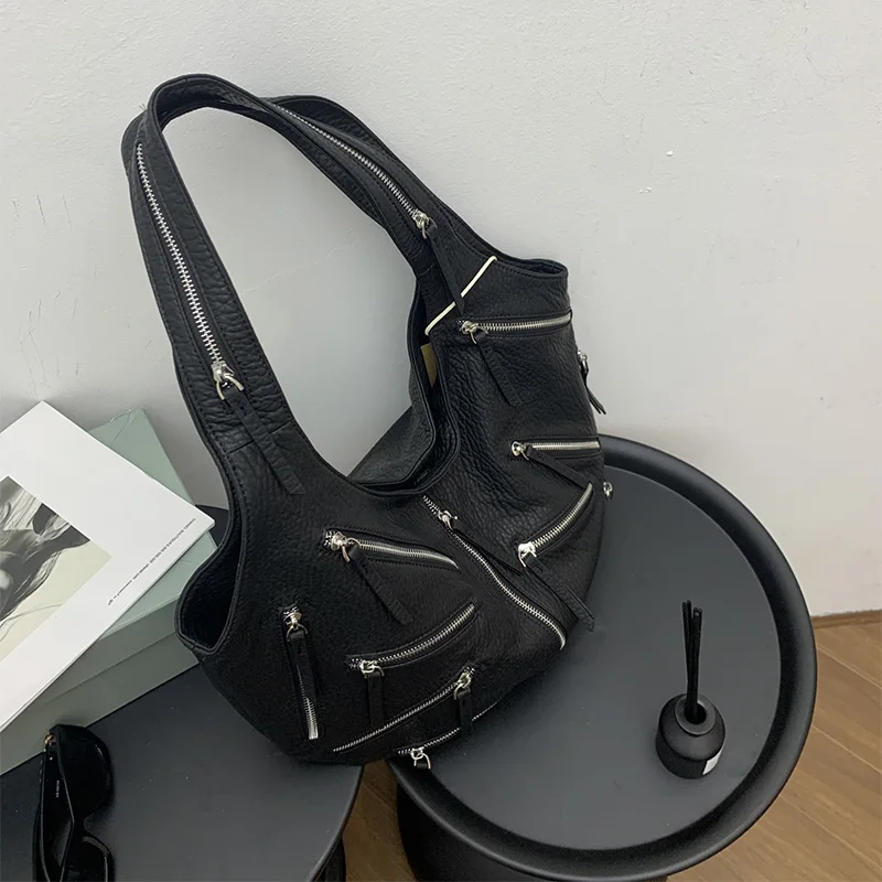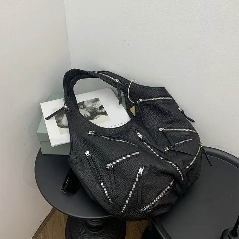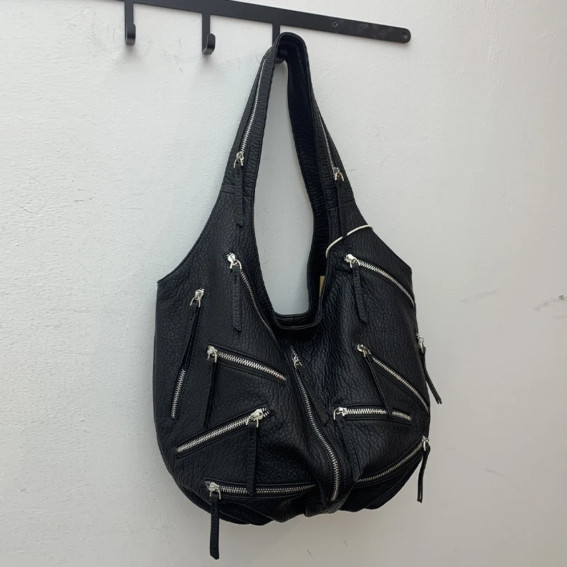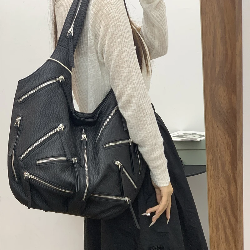 Multi-zipper Design Bag High Quality Leather Black Embroidery Print Casual Shoulder Bag Stylish Women Tote Bag Soft Leather Bag