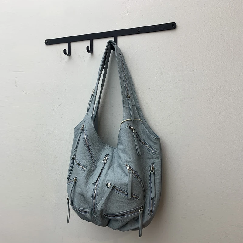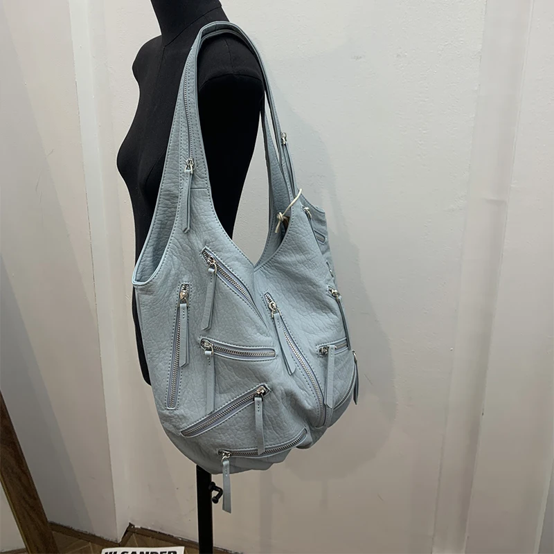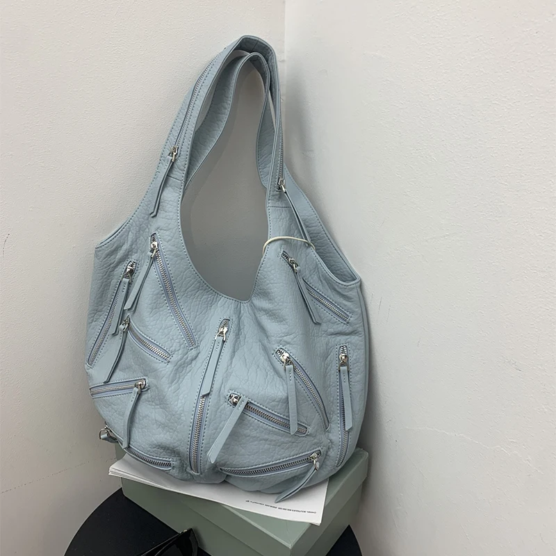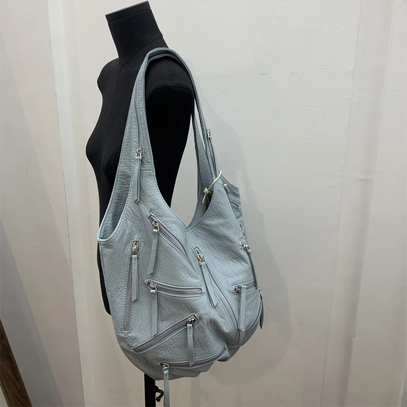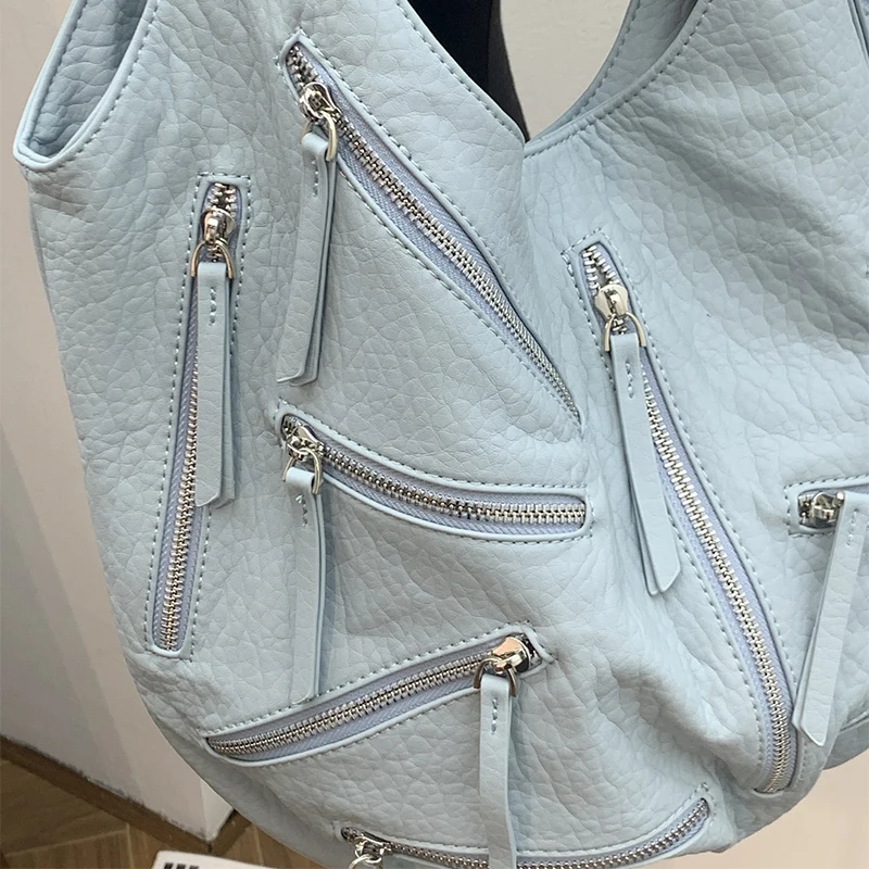 Multi-zipper Design Bag High Quality Leather Black Embroidery Print Casual Shoulder Bag Stylish Women Tote Bag Soft Leather Bag