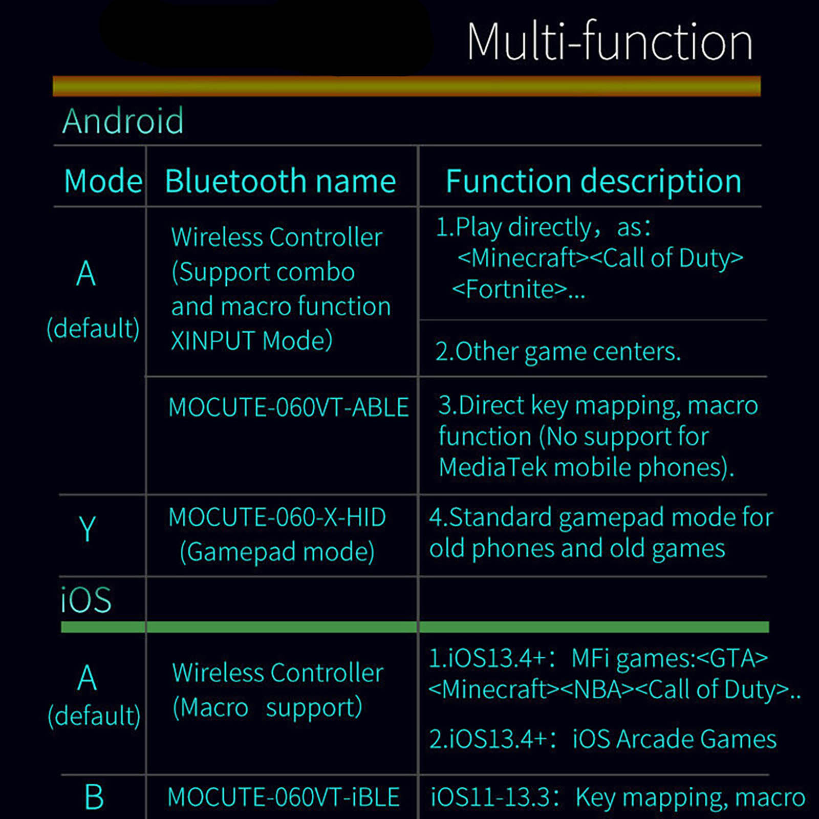 Features: Made of high quality material, very durable, ergonomics design for comfortable and enjoyable play. Flexibility, precision, comfort, easy to control, compact and portable. Support for Android 3.2 above, for IOS 13.4 above and for Windows operate sysytem and so on. Built-in wireless wireless BT 2.0 - 5.2, can support 2-10 meters wide range of control from the operation. Built-in lithium battery, after charging, it can be sustainable of 160 hours, safe and stable. Used for Mobile phone, for MID, TV box (which can support wireless BT function), smart TV, PC, etc. Supports the vast majority of games: for App store, for Android