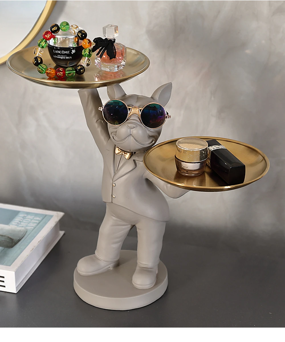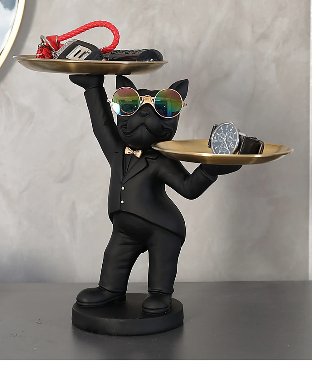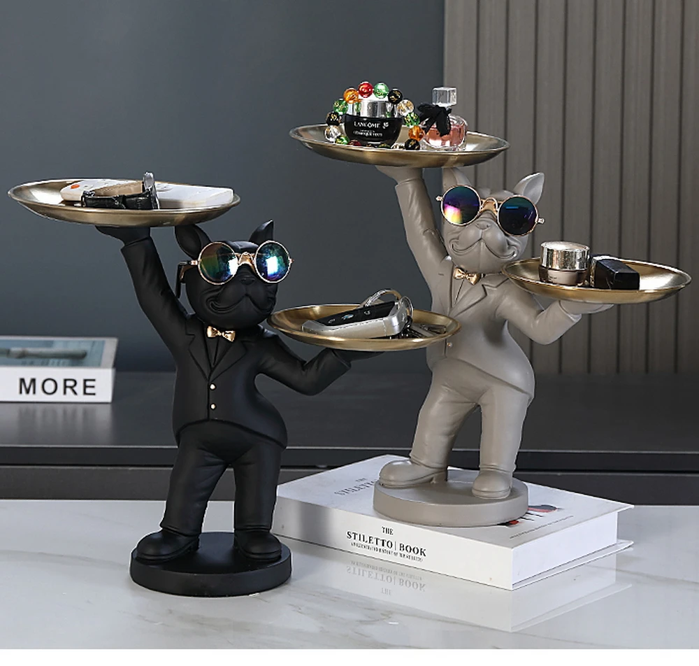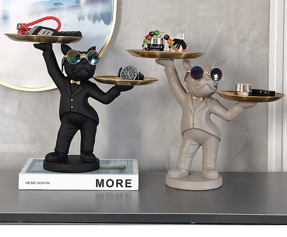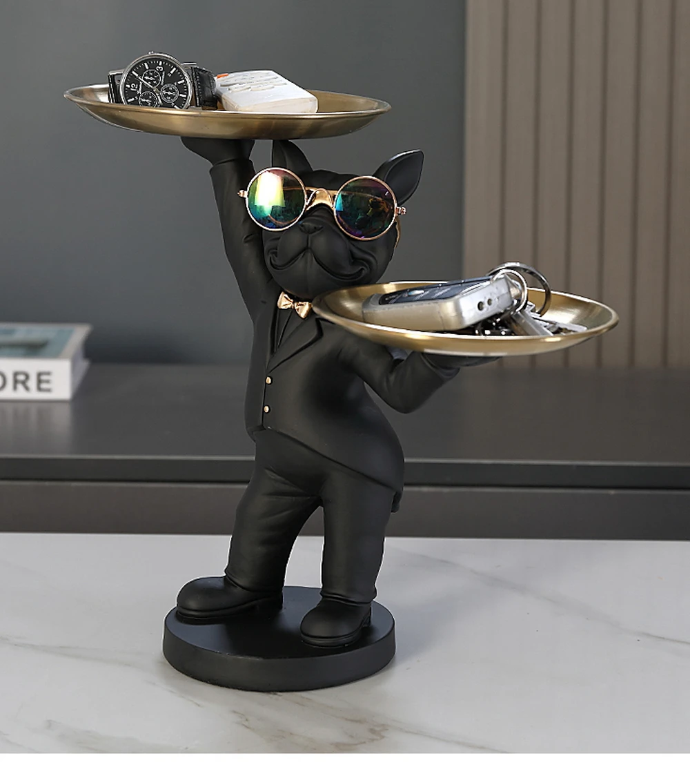 New Enchanting French Bulldog Statue with 2 Trays Decorative Sculpture Resin Dog Ornaments Animal Figurines Home Decor Gifts