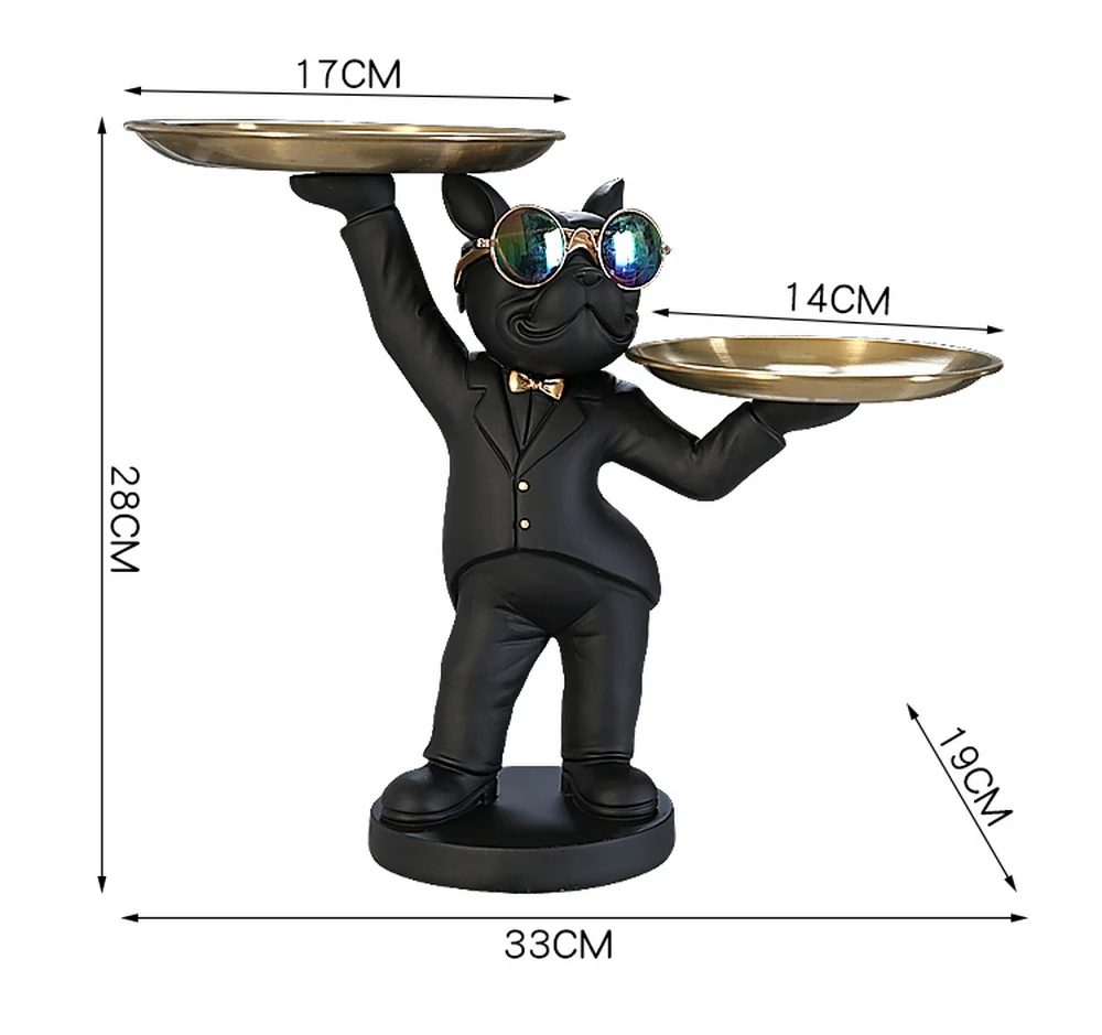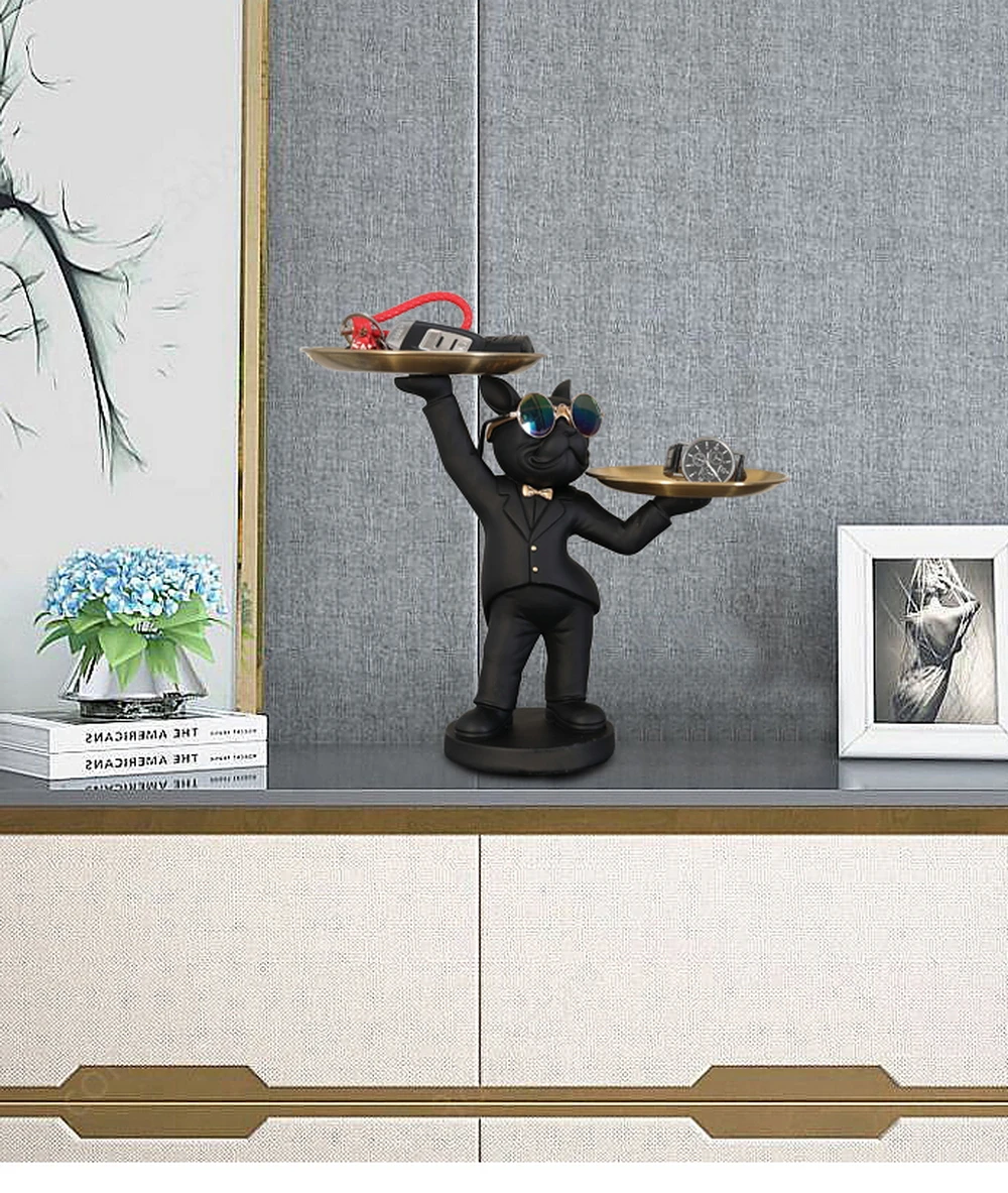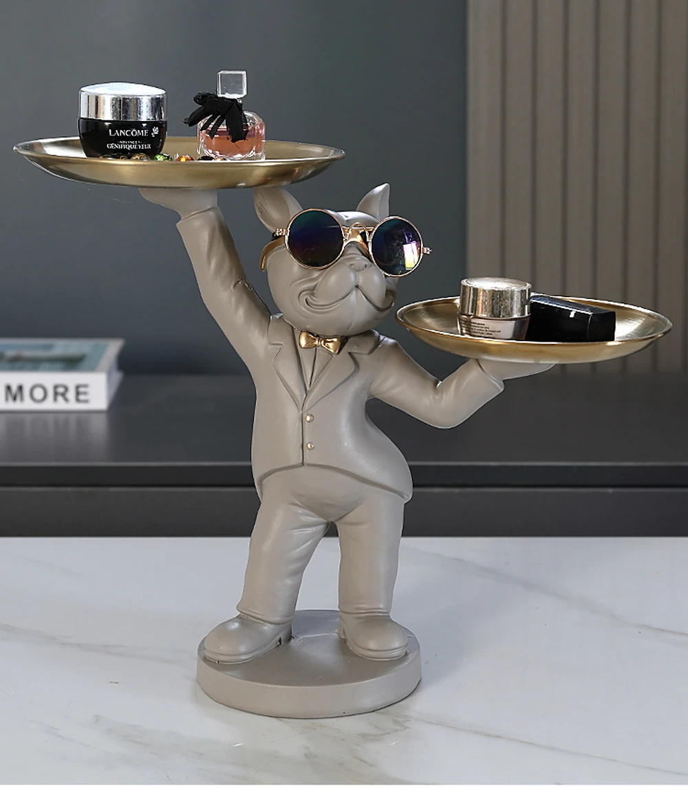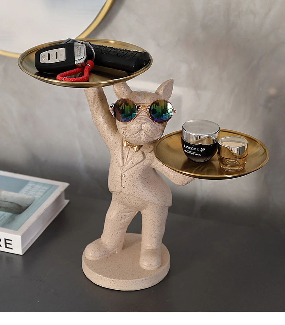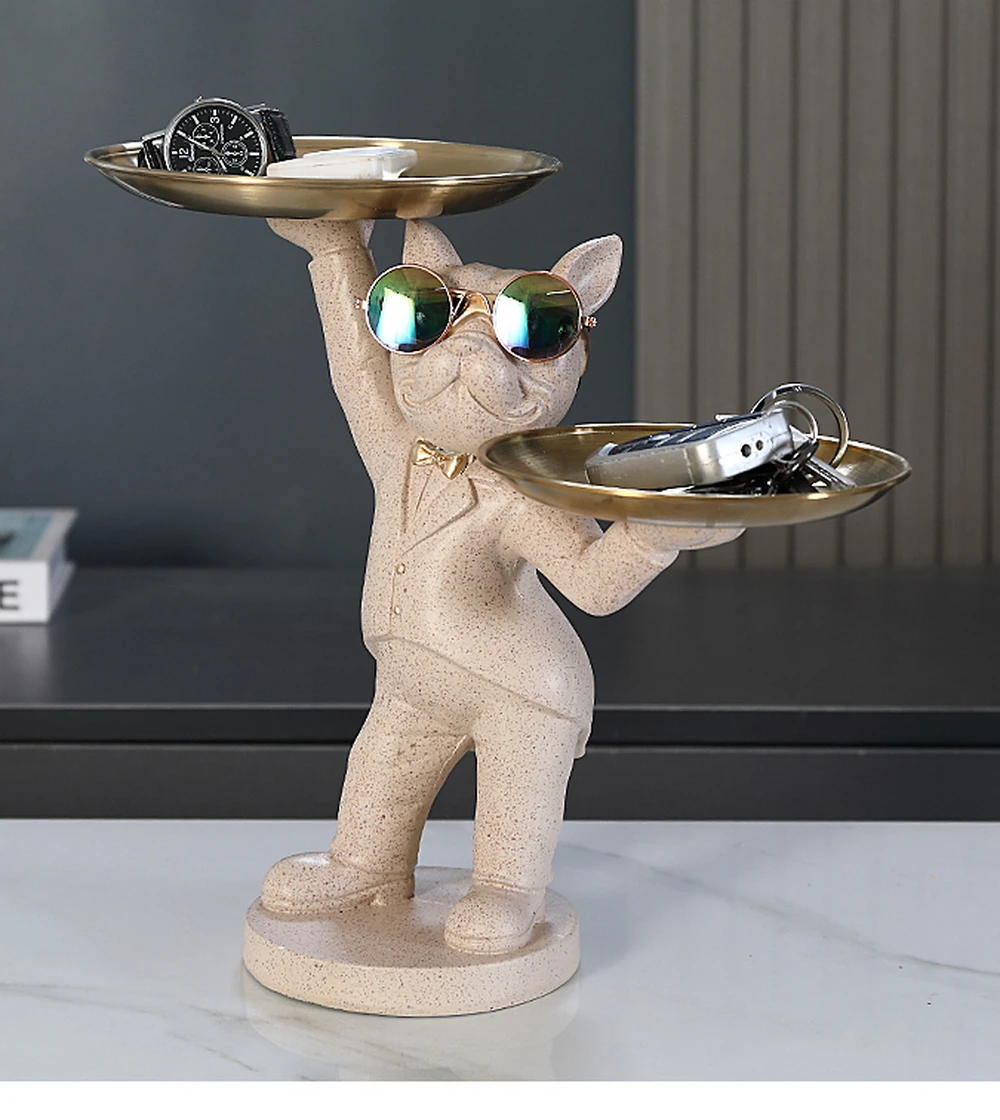 New Enchanting French Bulldog Statue with 2 Trays Decorative Sculpture Resin Dog Ornaments Animal Figurines Home Decor Gifts