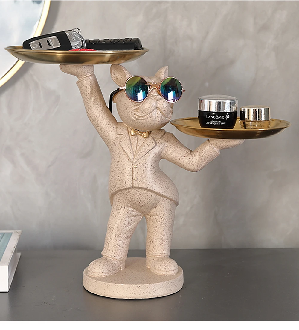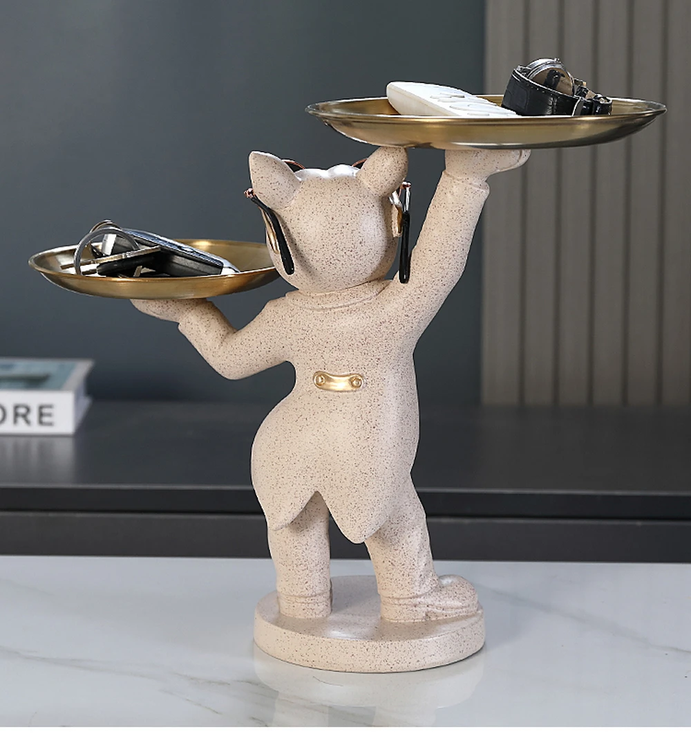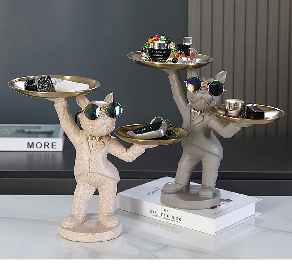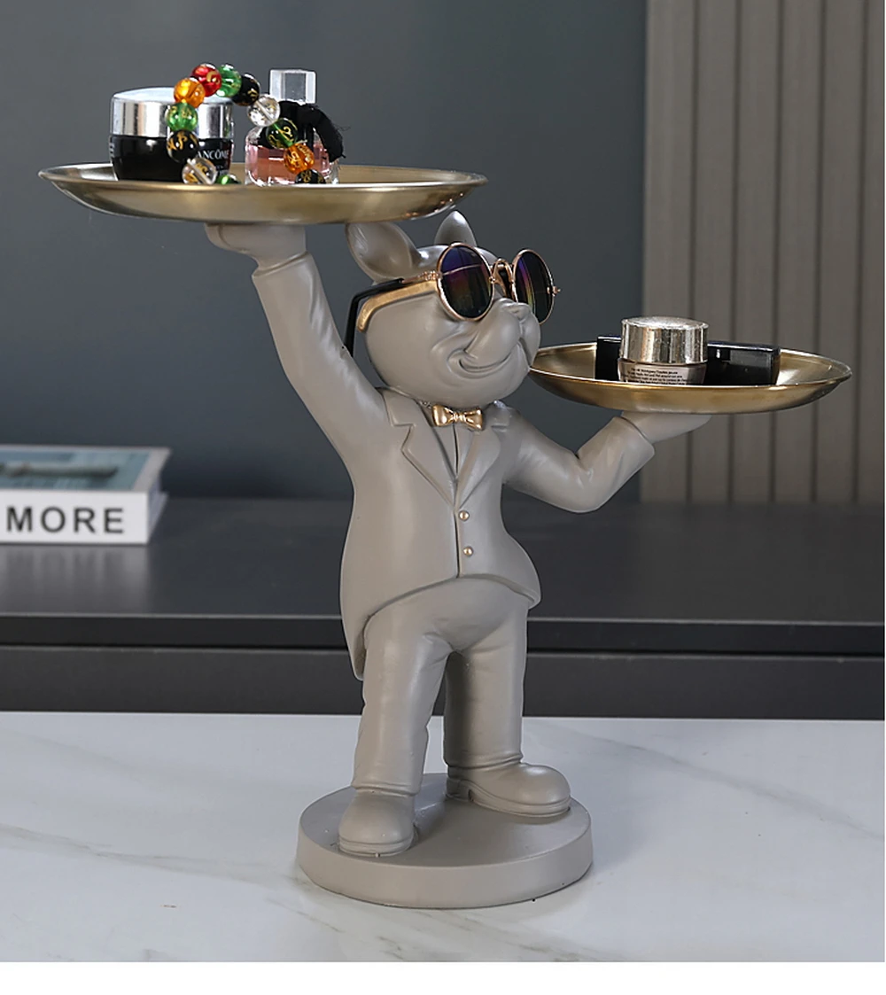 New Enchanting French Bulldog Statue with 2 Trays Decorative Sculpture Resin Dog Ornaments Animal Figurines Home Decor Gifts
