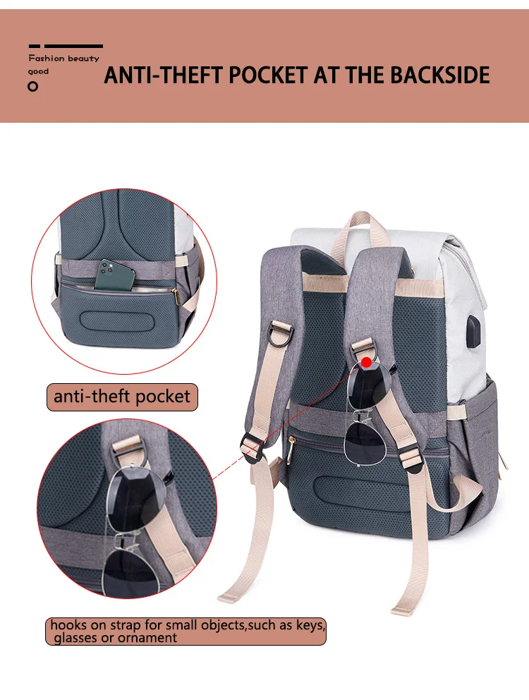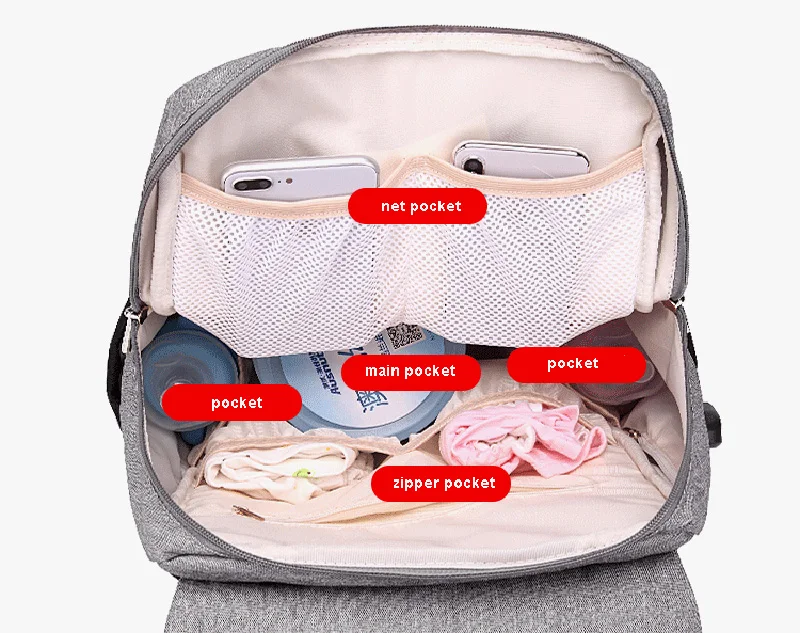 16 independent storage pockets which including 2 insulated pockets to keep the bottle warm or cold, 1 dry and wet isolation bag, 2 side pockets (including a tissue pocket), 1 anti-theft pocket for personal wallets, mobile phones or other valued things, 1 pc key chain makes it easy for you to find your keys, all these designs just to make your life easier.