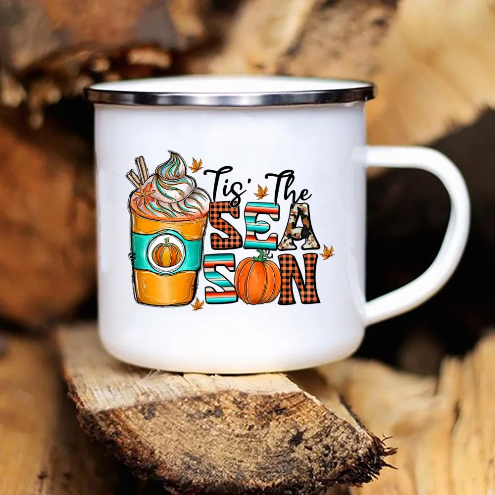 ------ Item Description ------ • Material: Enamel • Dimensions: height 3.14″ (8 cm), diameter 3.35″(8.5 cm) • White coating with a silver rim • Only print on ONE SIDE of the mug •Due to the rustic nature of mugs, you may see small imperfections such as dents, bubbles + other rustic features
