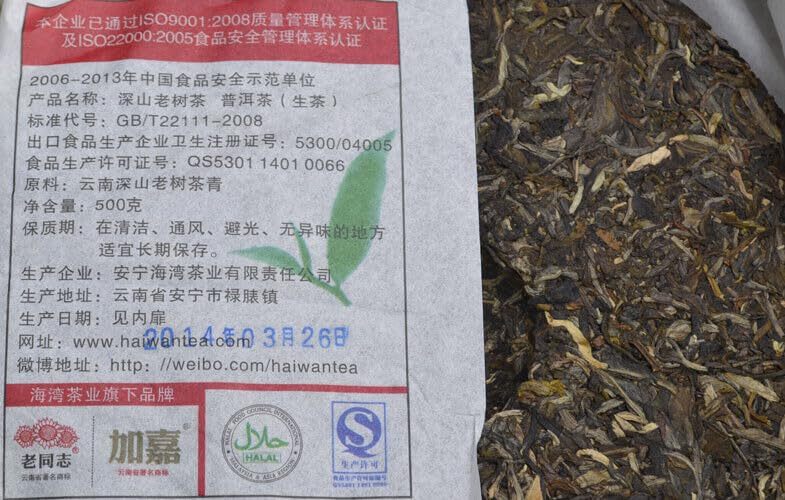 Product name: 2014 year Haiwan Tea Shen Shan Lao Shu Batch 141 Puer type: Raw puer tea Net weight: 500g/Pcs Origin: Yunnan, China Storage: Avoid sunlight, ventilation places Manufacturer: Anning Haiwan Tea Industry Co.,Ltd. Tea Material: Shaiqinmao tea leaves of Yunnan big leaves species ( Without any additive)