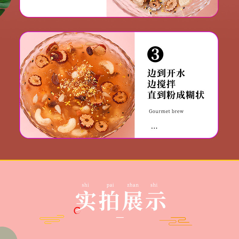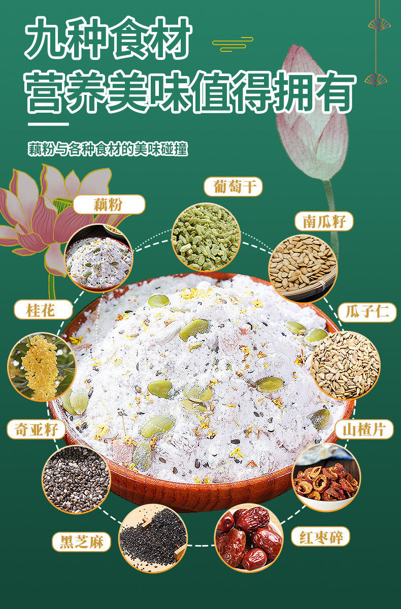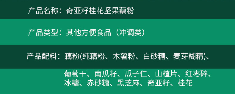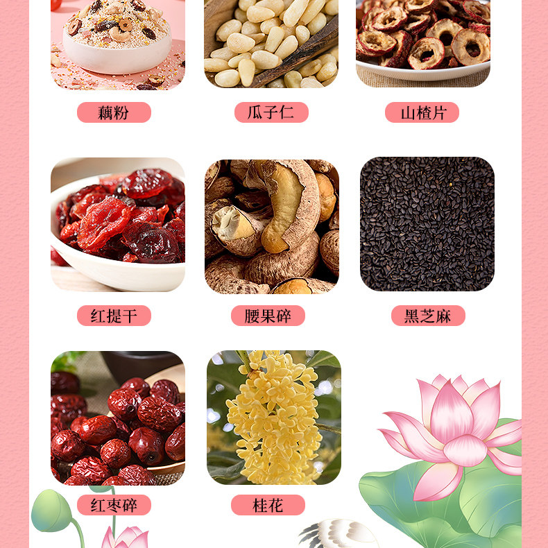 Main ingredients/ingredients: lotus root starch, dried red grapes, hawthorn slices, black sesame seeds, dried red dates, sunflower seeds, almonds, walnut kernels, cranberries, peanuts, sweet-scented osmanthus, rock sugar powder.