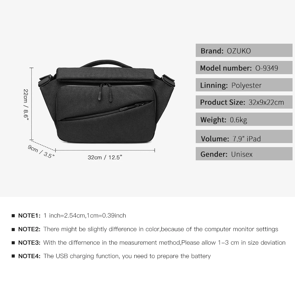 OZUKO Men Crossbody Bags Male Messenger Bag USB Charging Multifunction Riding Waterproof Shoulder Bag Travel Bag Men New