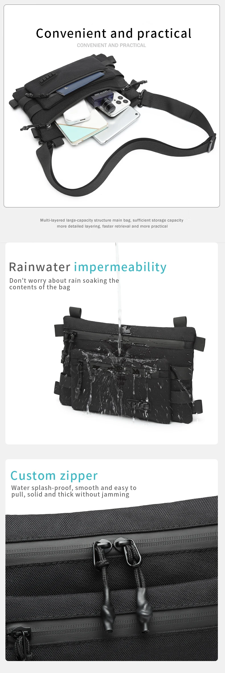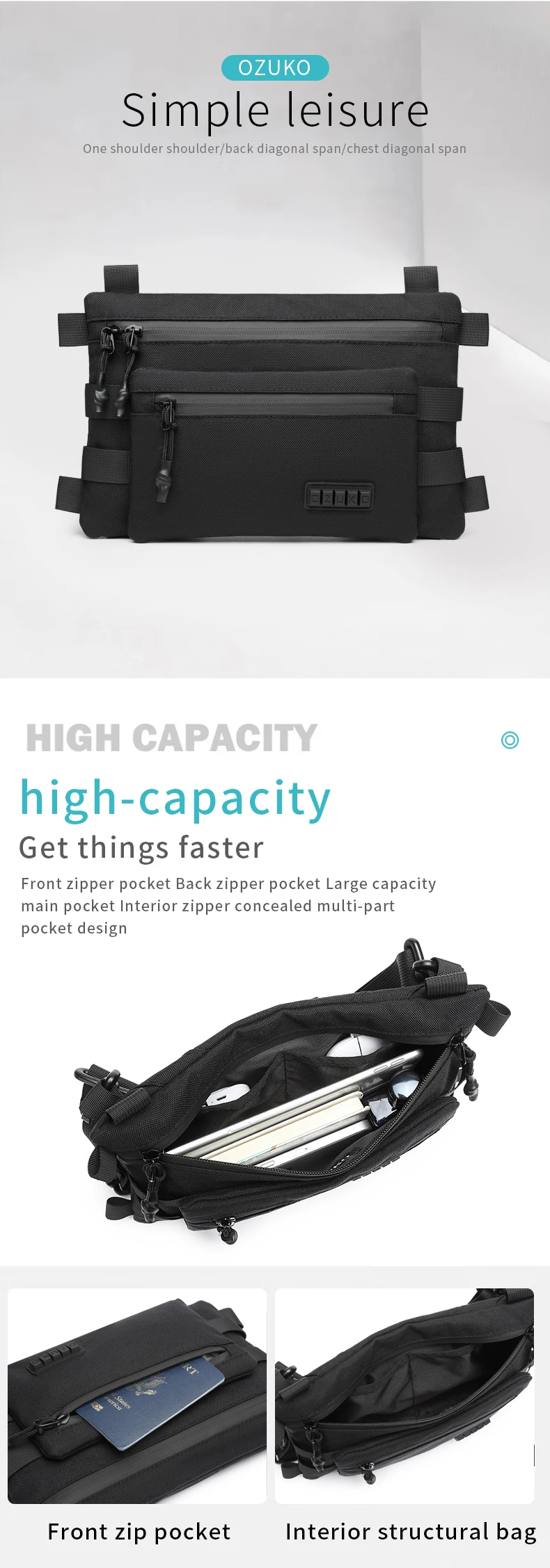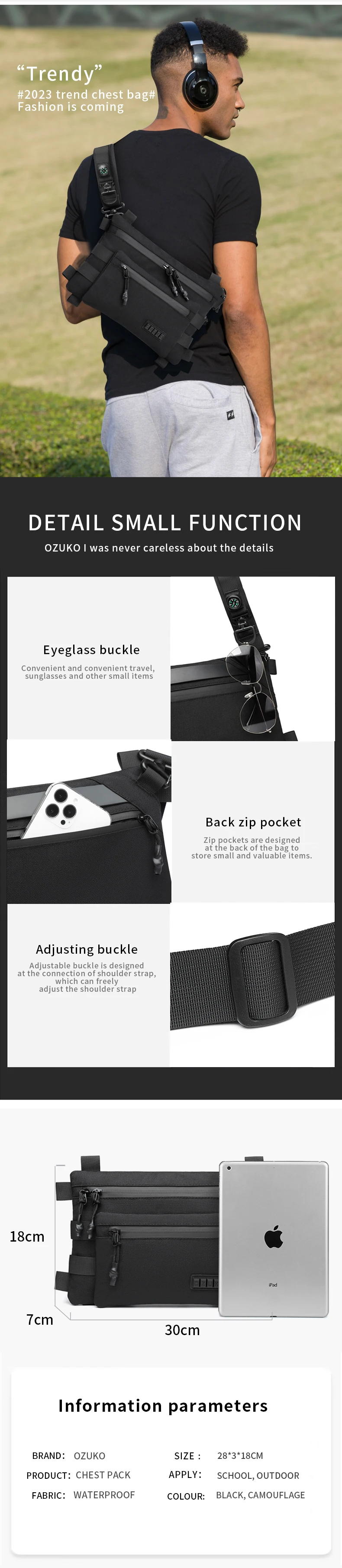 OZUKO Men's Chest Bag Waterproof Satchel for Men and Women Leisure Sports One-shoulder BMessenger Bag