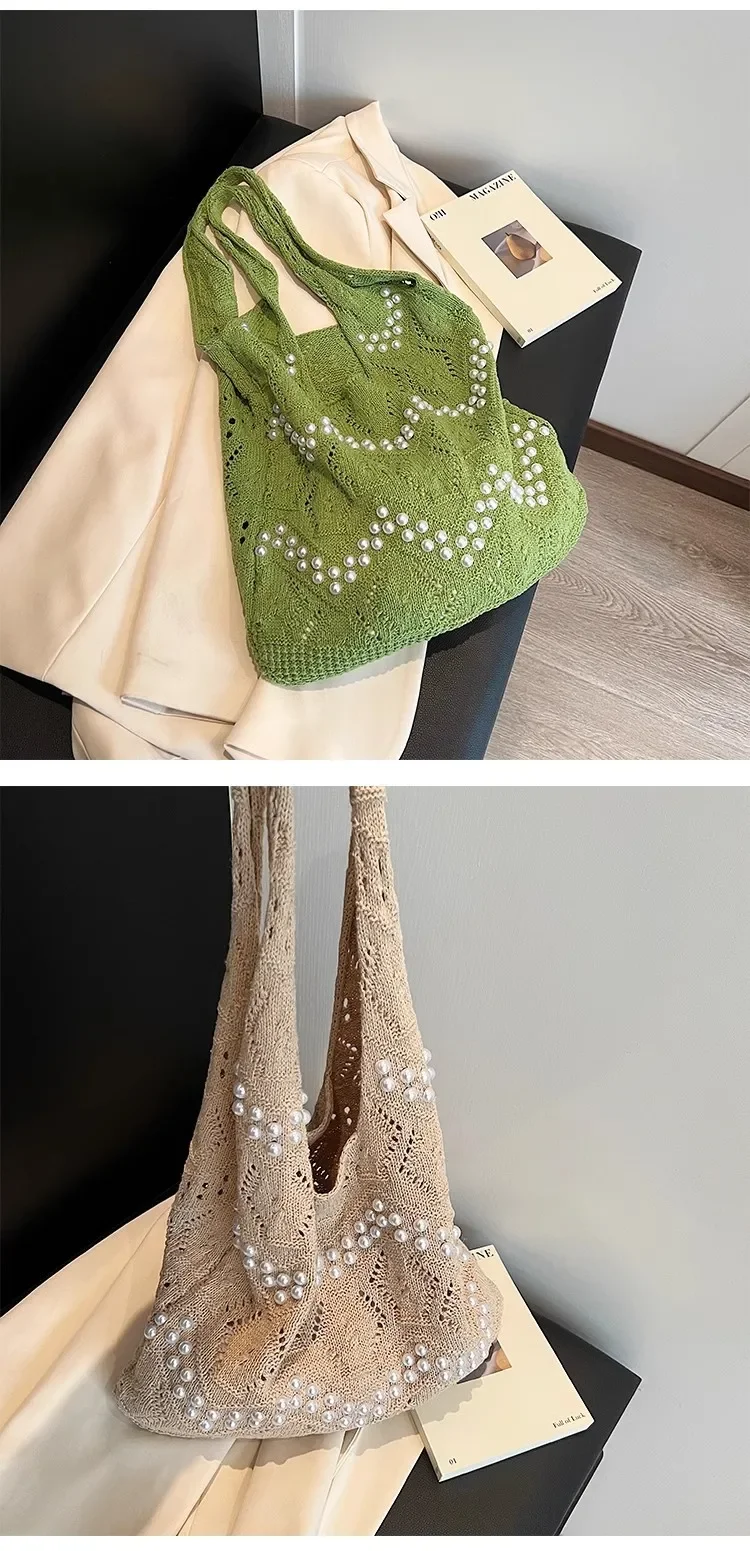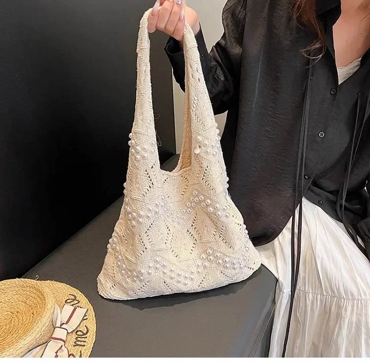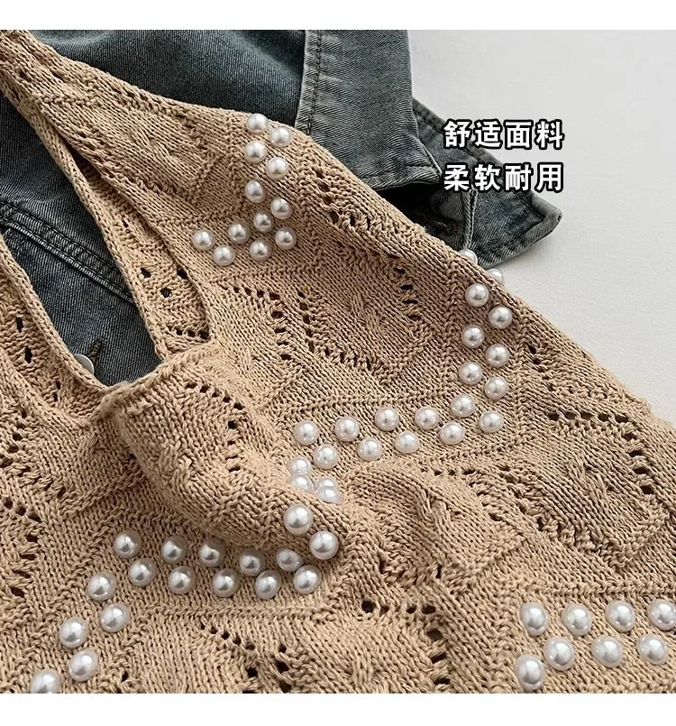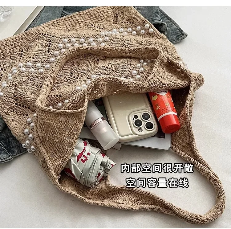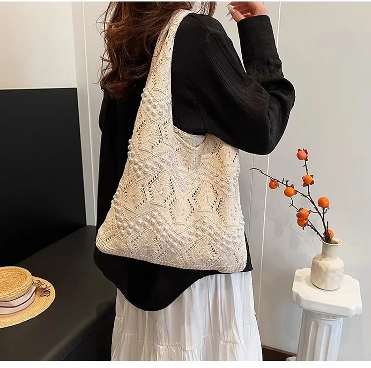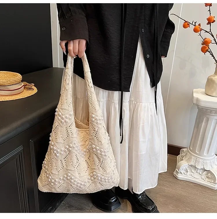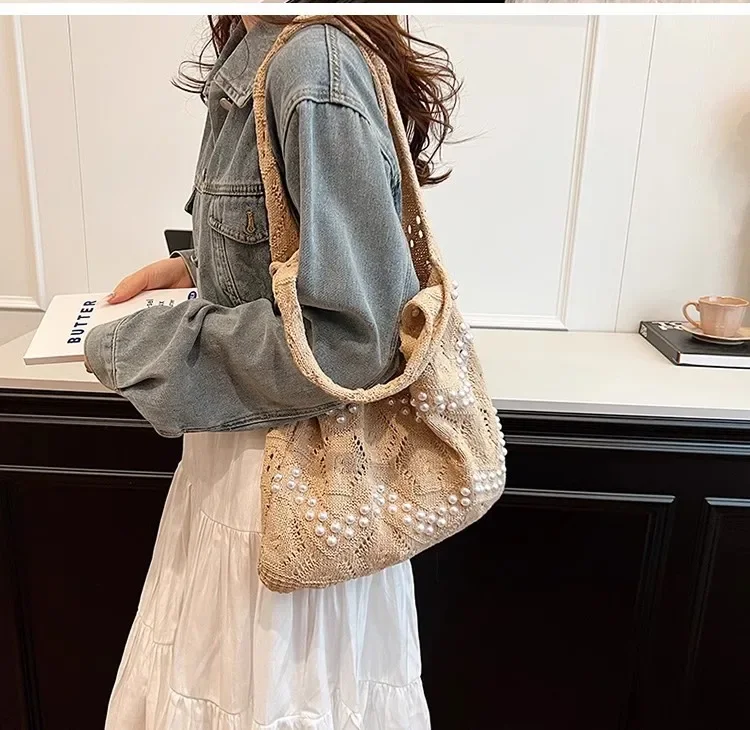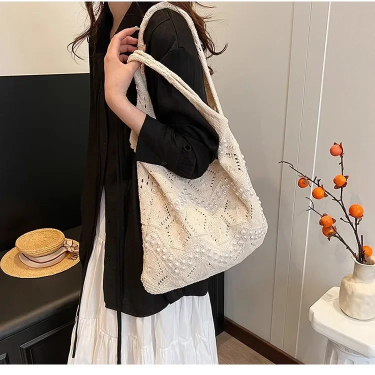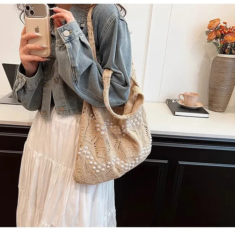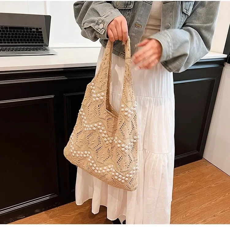 Pearl Decoration Large Capacity Tote Bags Gentle Style Shopping Handbag for Picnic Ladies Exquisite Woven Shoulder Single Bags