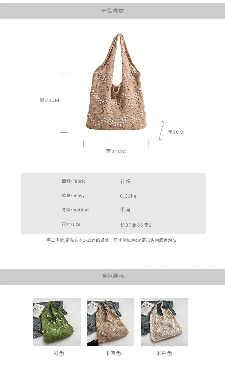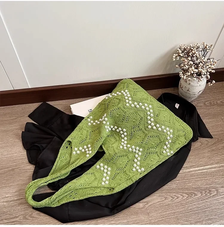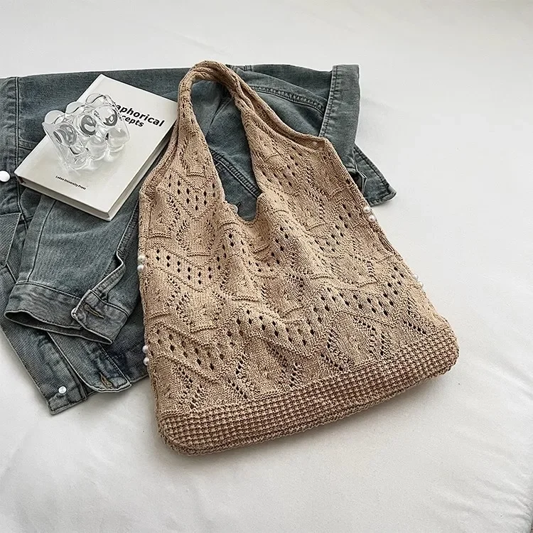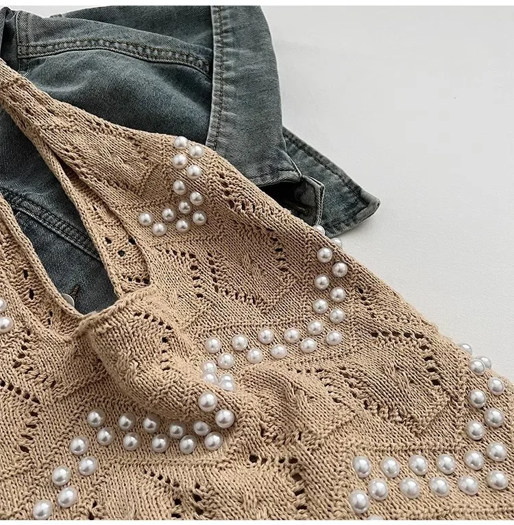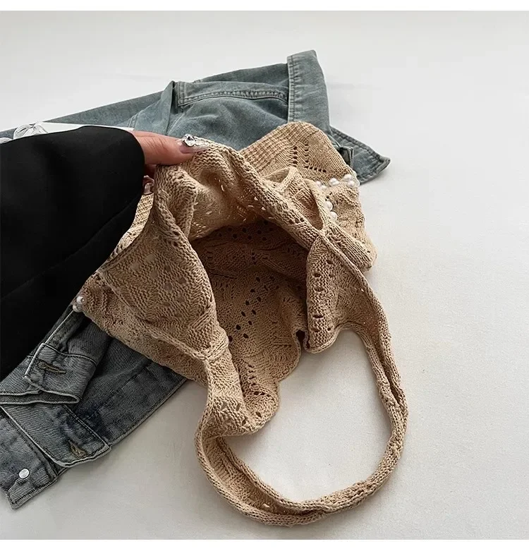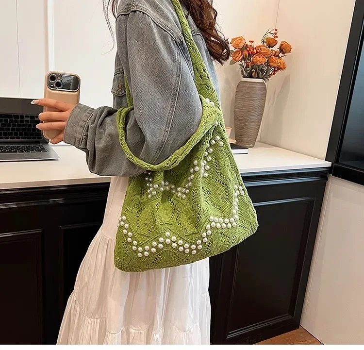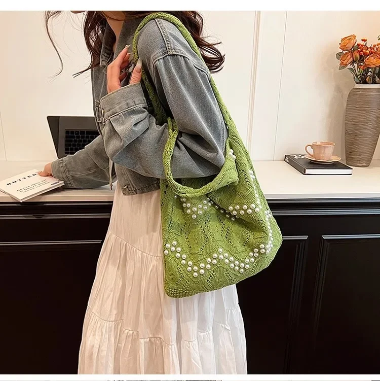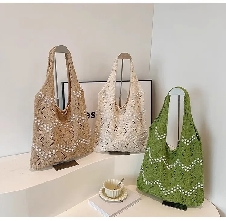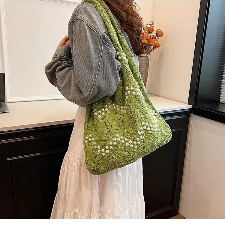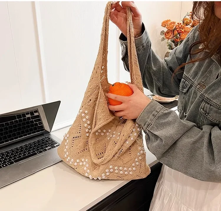 Pearl Decoration Large Capacity Tote Bags Gentle Style Shopping Handbag for Picnic Ladies Exquisite Woven Shoulder Single Bags